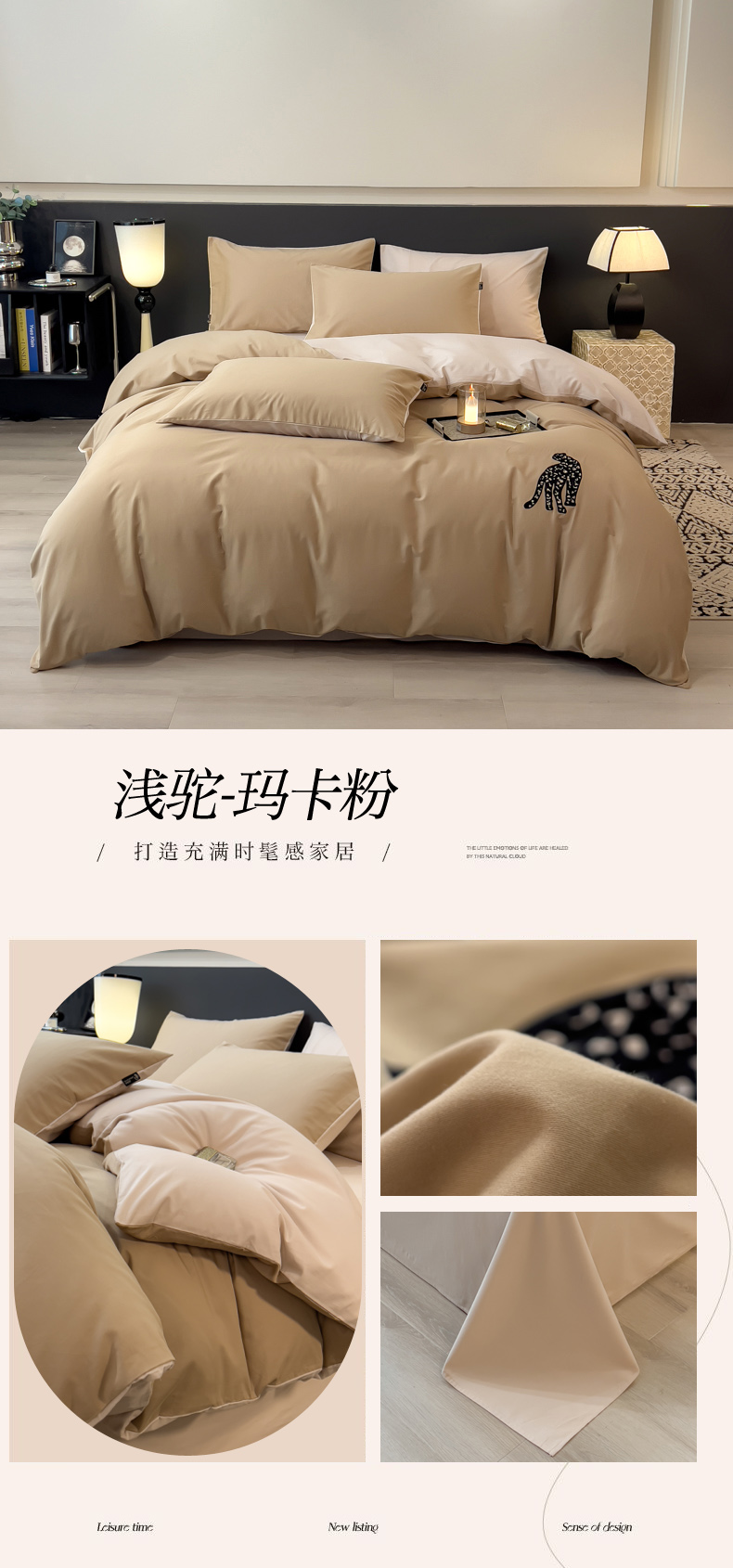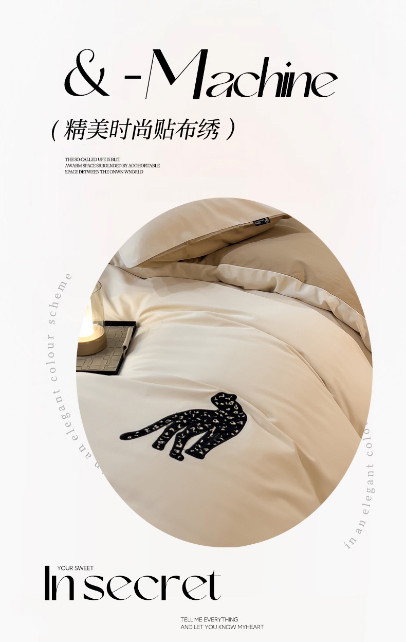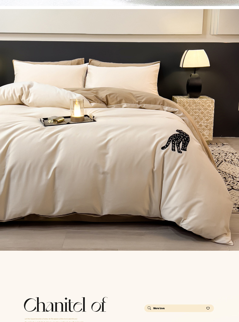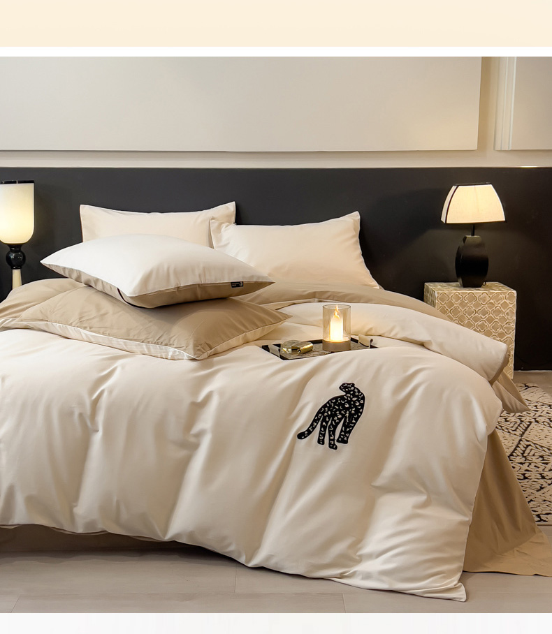 商品名称:印季家纺 2025新款全棉50s磨毛绣花-黑豹四件套 奶玉-浅驼