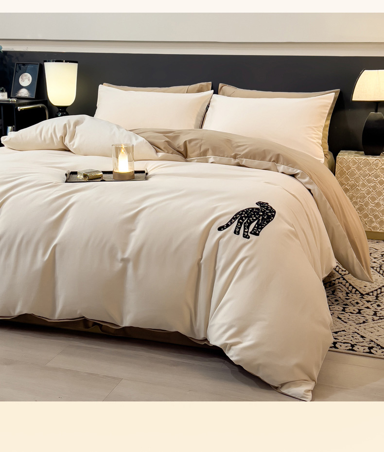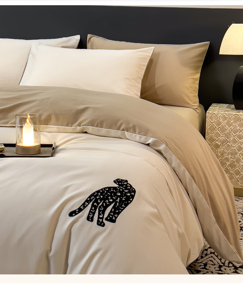 印季家纺 2025新款全棉50s磨毛绣花-黑豹四件套 奶玉-浅驼