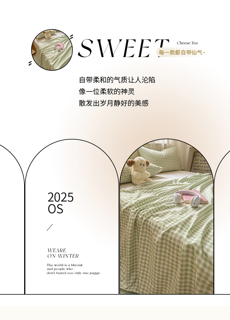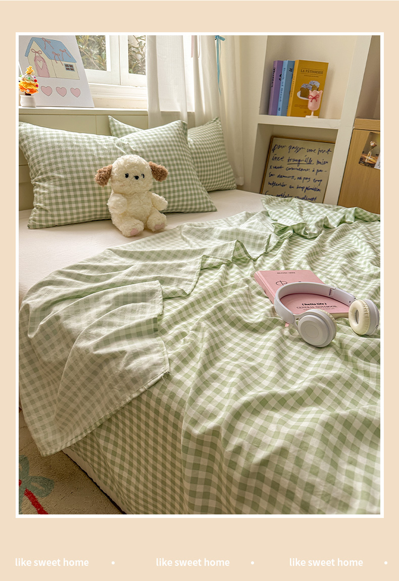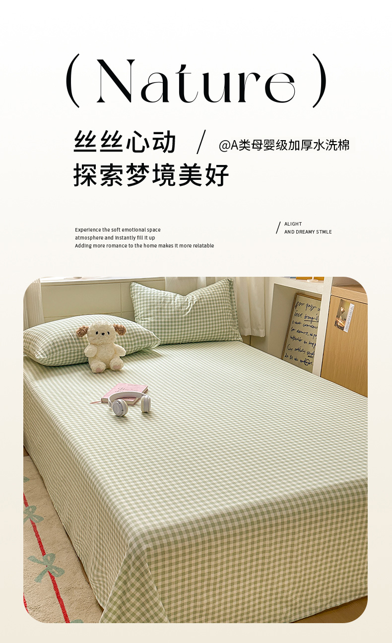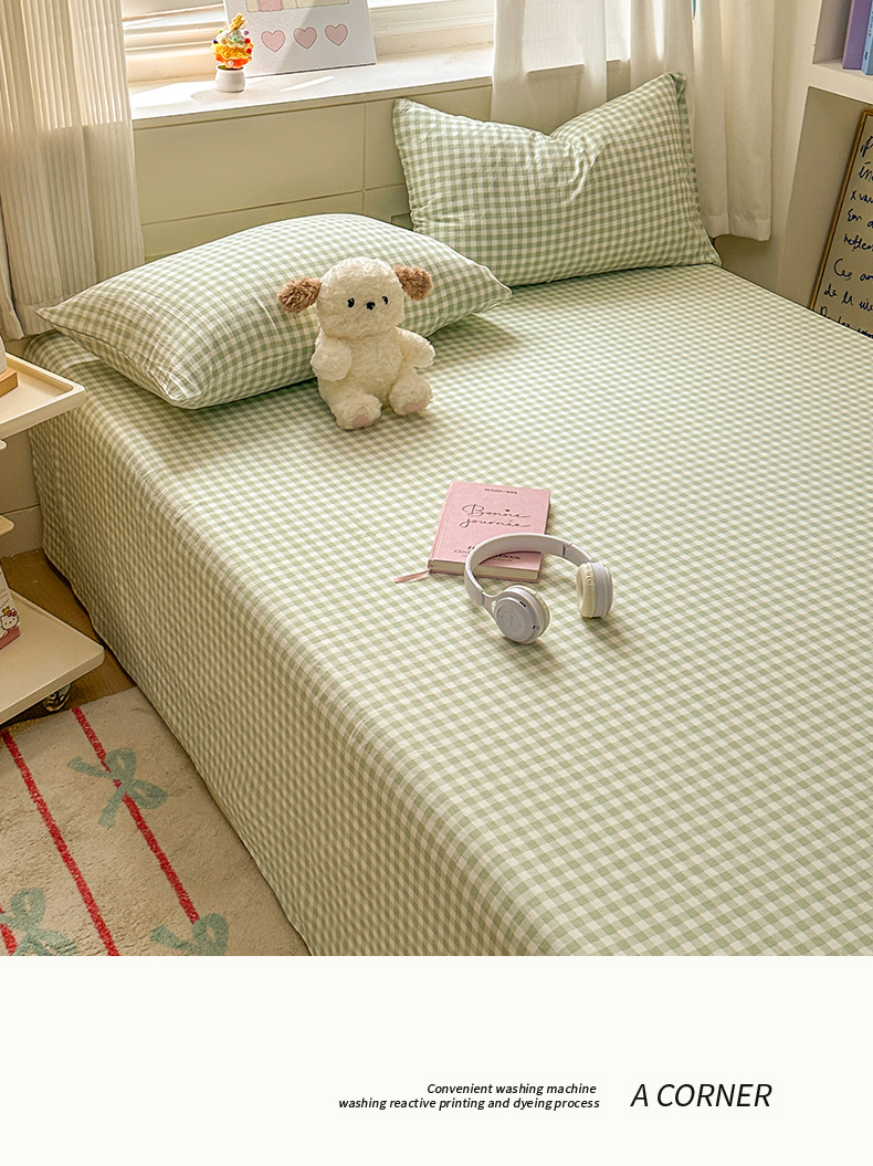 冕悠家纺 2025新款A类加厚水洗棉格子点点印花超柔单品床单枕套 绿格