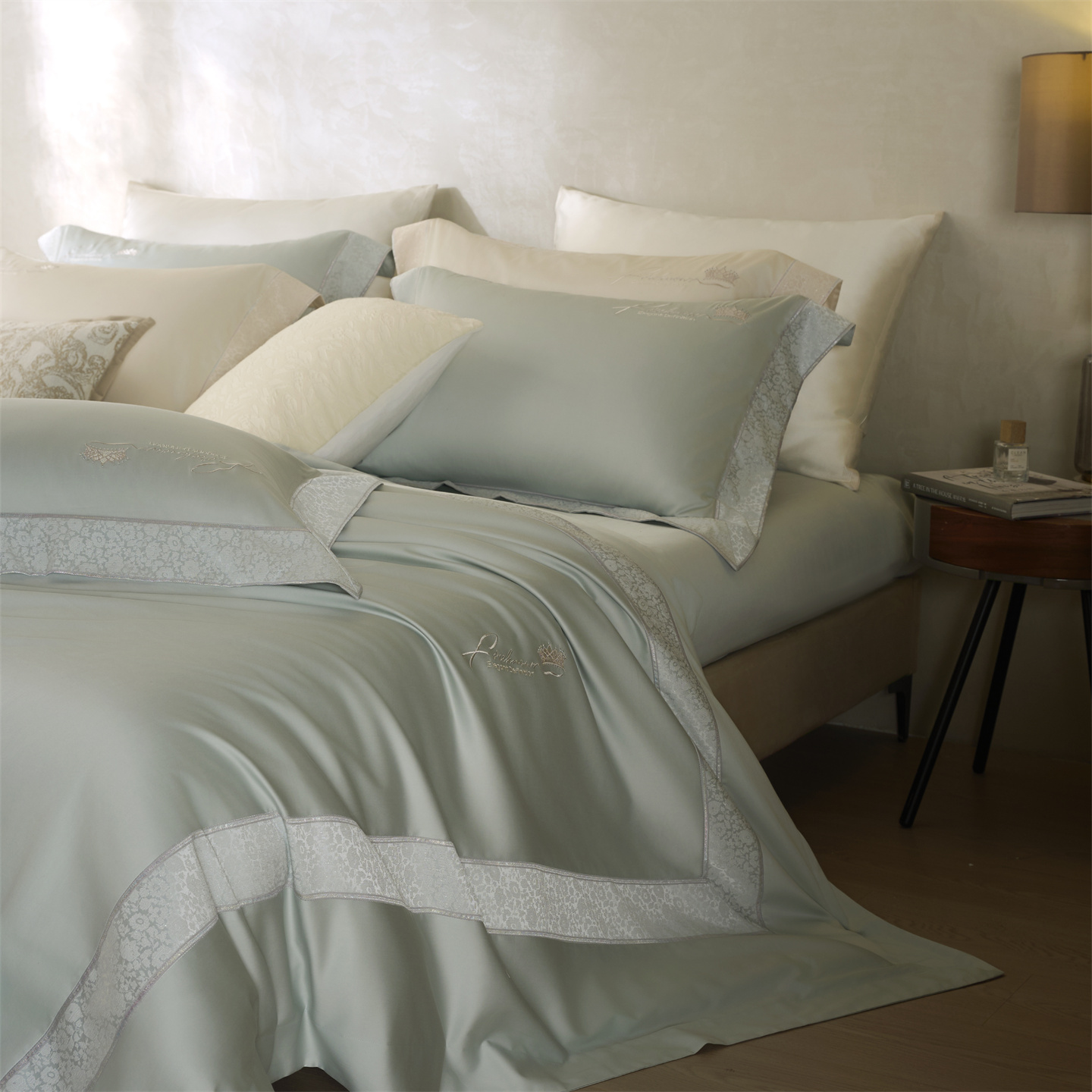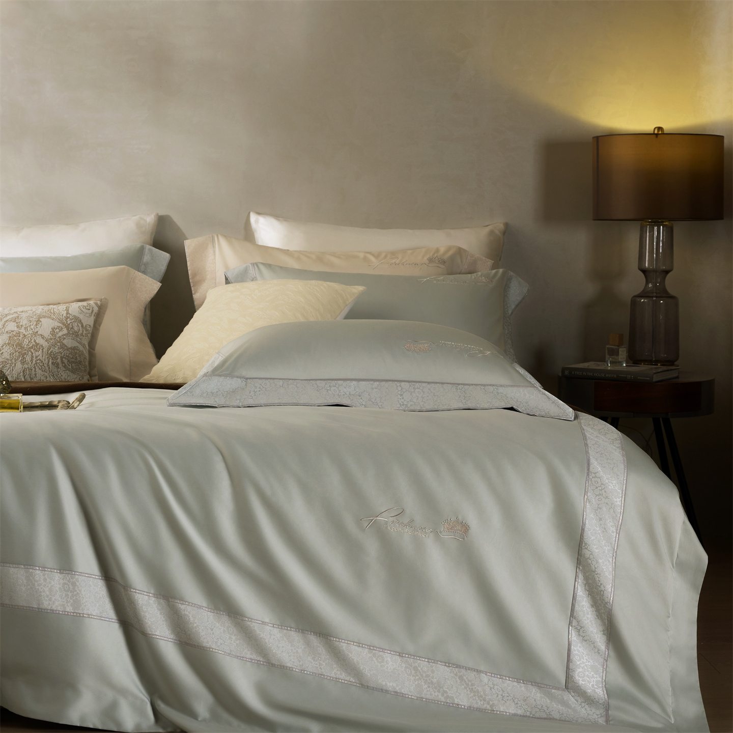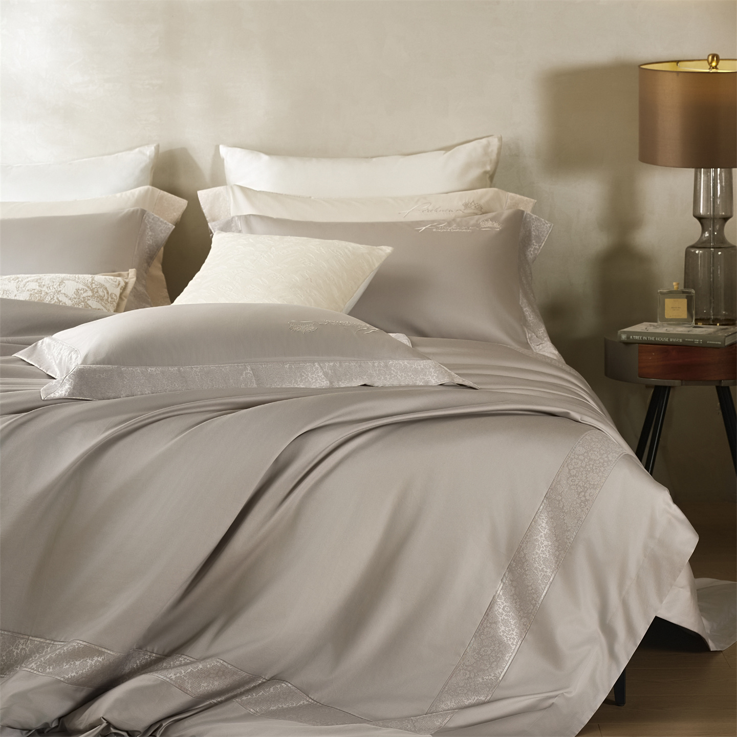总玖玖爱家纺 纯棉100支贡缎长绒棉刺绣被套三件套四件套加大四件套,白色,高级灰,卡其,蓝灰,绿色,浅桔,深蓝,紫豆沙