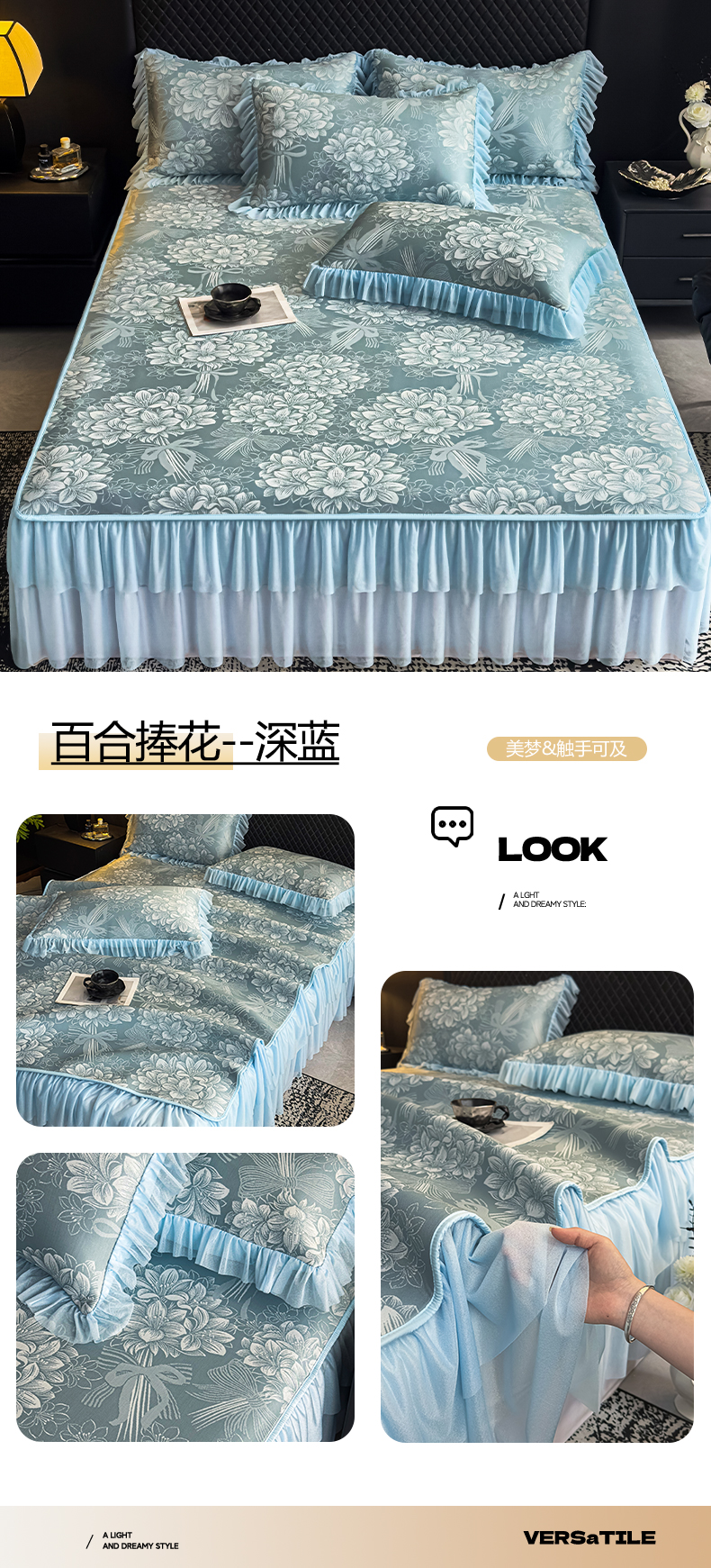 当前位置: 91家纺网 > 商品网购 > 床上用品 > 凉席 > 家之硕家纺 2026春夏新款凉感提花床裙款凉席席子 蔷薇玫瑰--天蓝