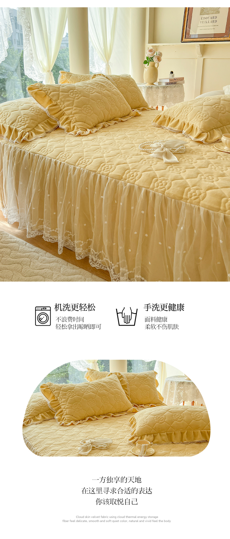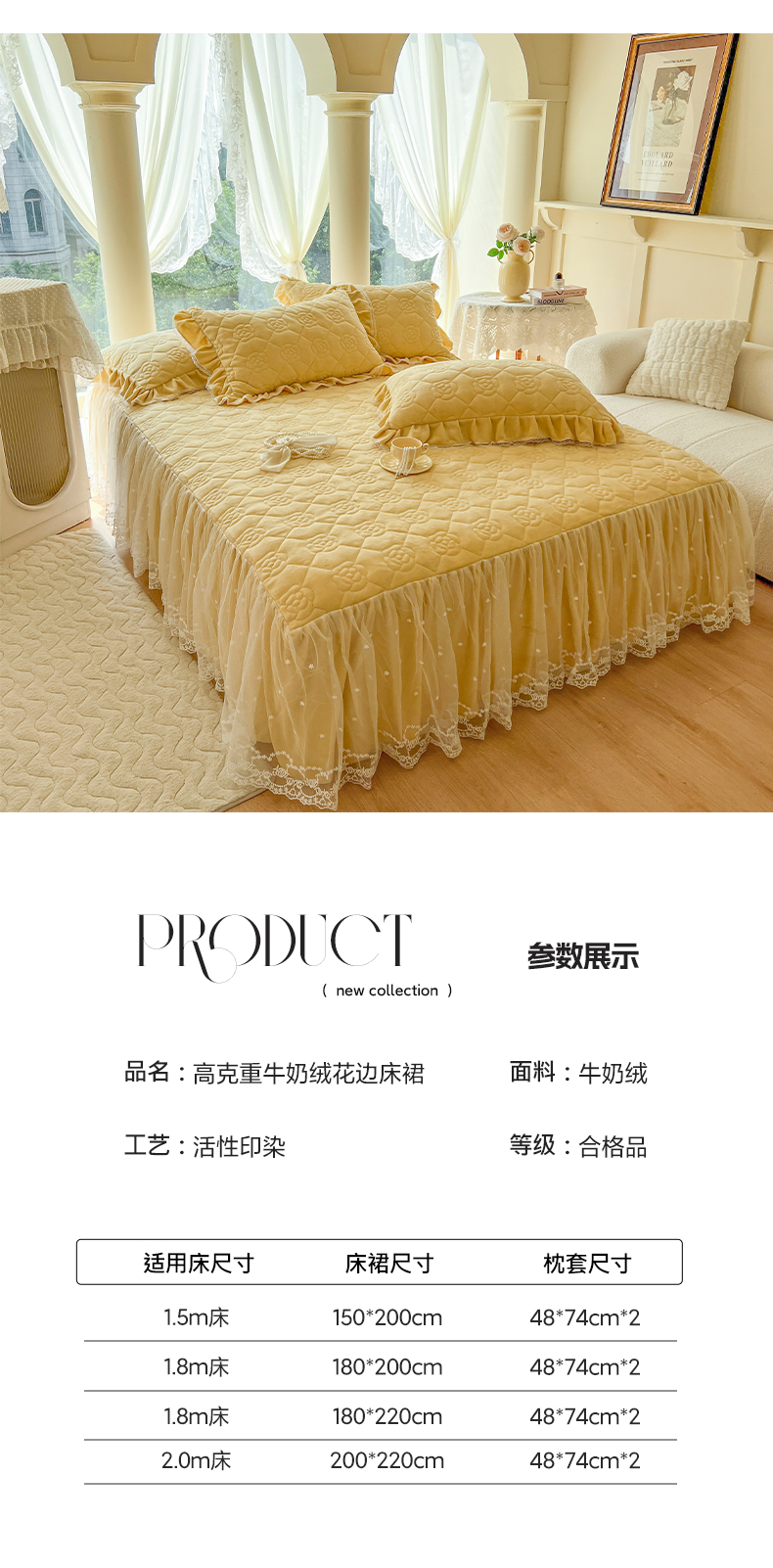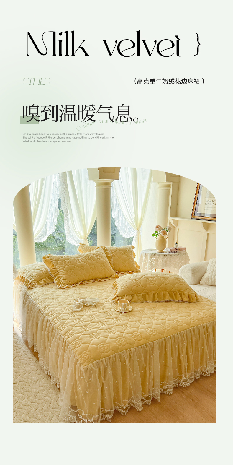 麒豆豆 2023新款高克重牛奶绒花边单床裙-山茶系列 山茶-黄