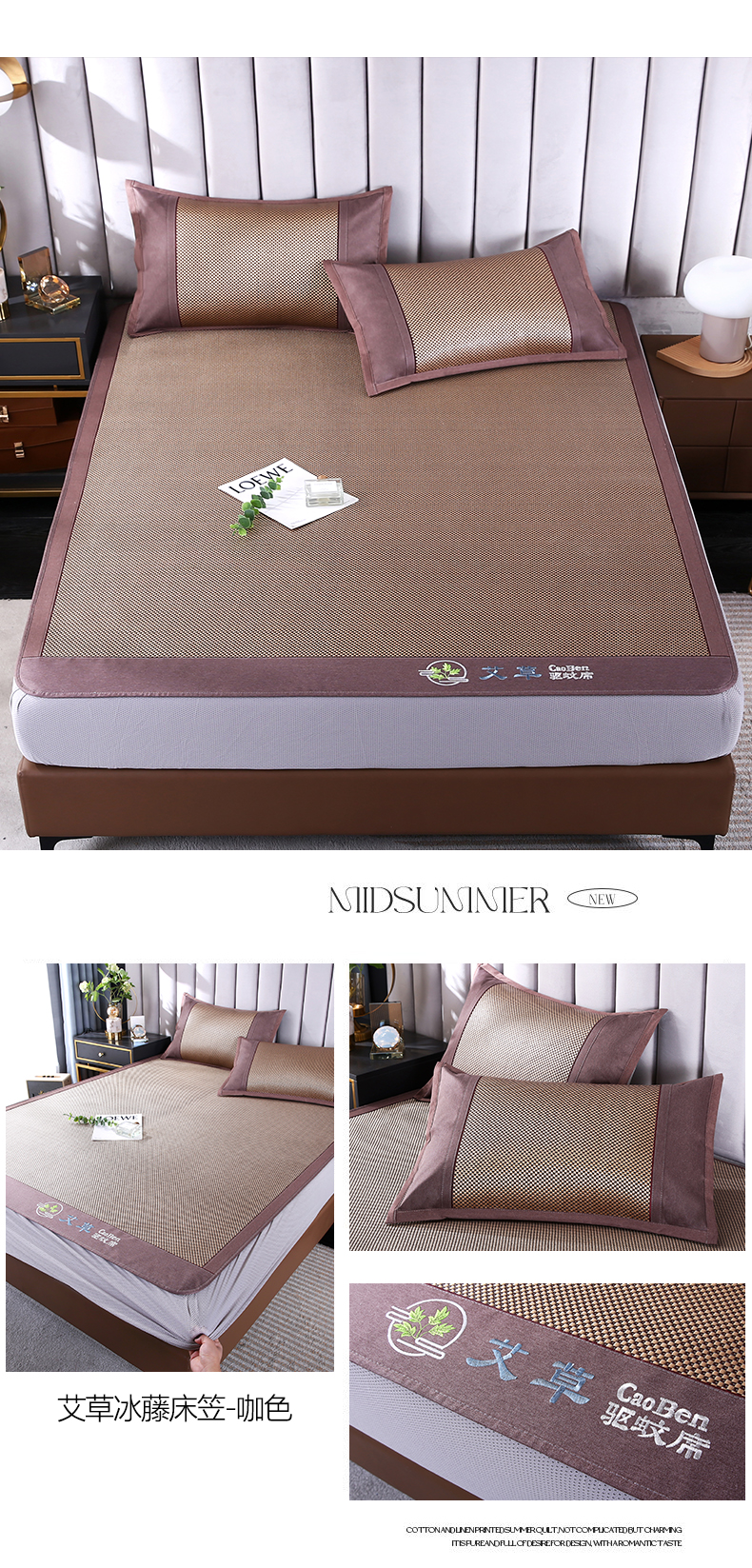商品名称:莱轩席业 2024新款A类艾草冰藤刺绣款凉席-床笠款 咖色