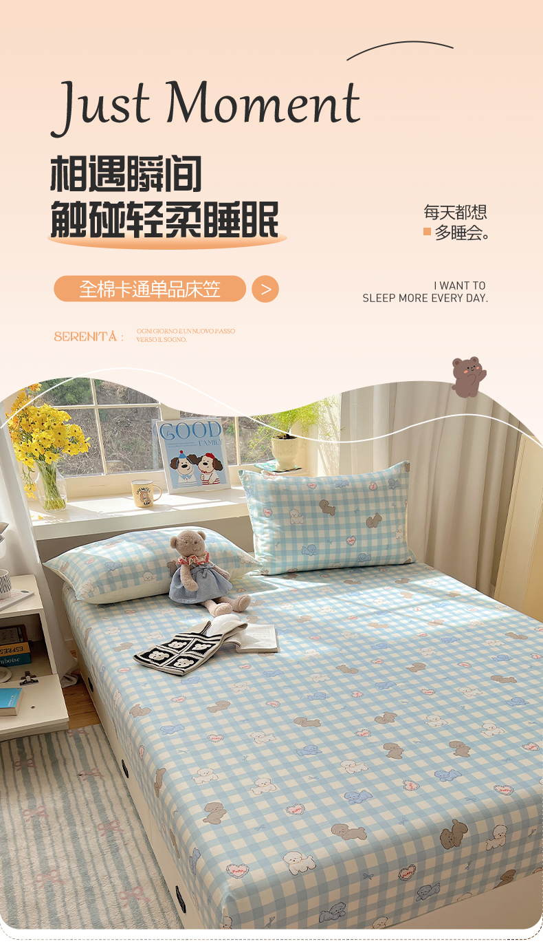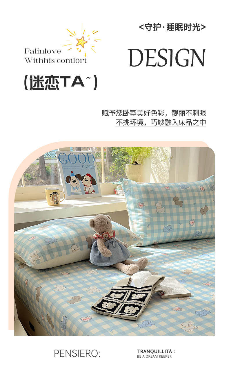 六巷胡同 2025新款40s13070全棉纯棉卡通单品系列床笠单件-单床笠 蓝格奶油狗
