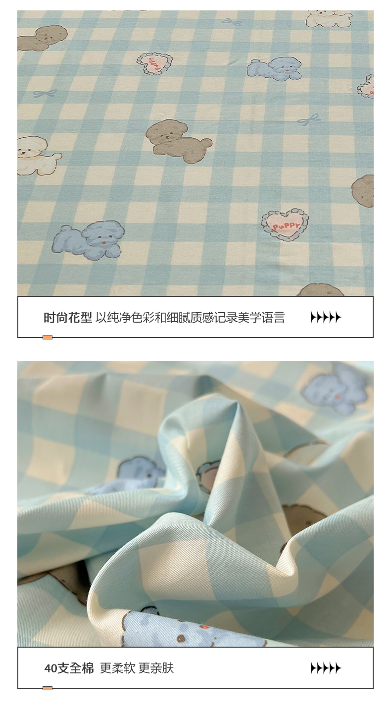商品名称:六巷胡同 2025新款40s13070全棉纯棉卡通单品系列床笠单件-单床笠 蓝格奶油狗