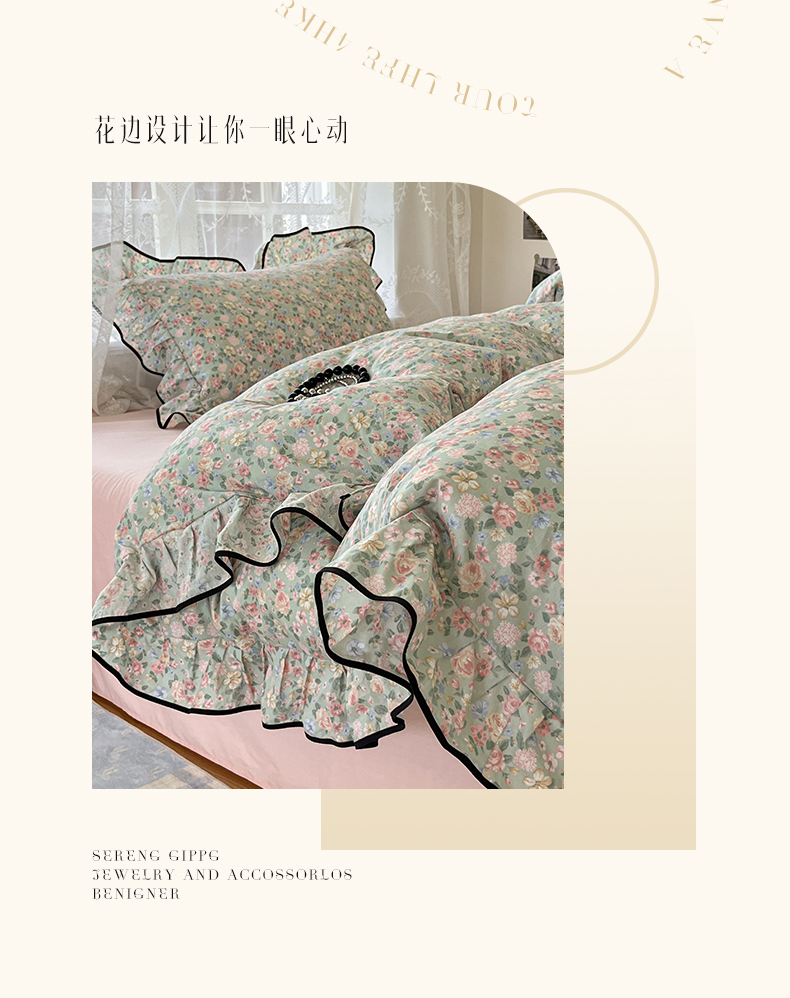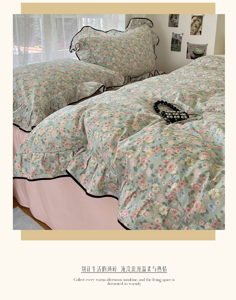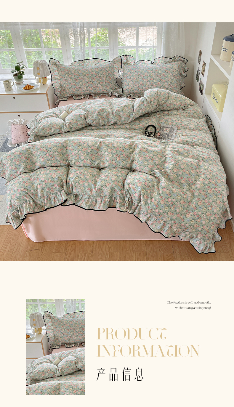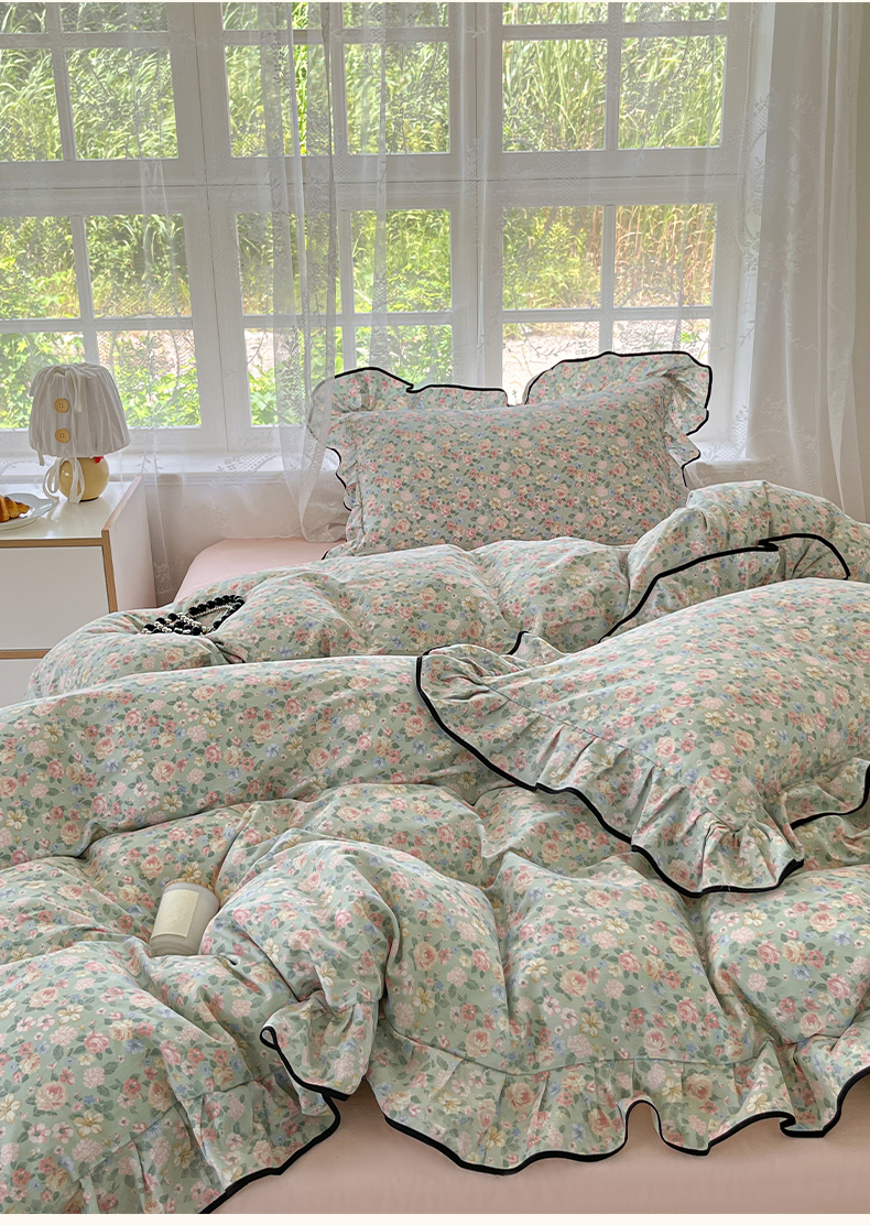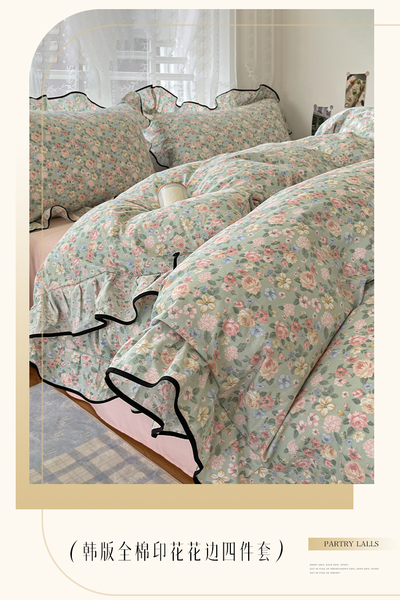 当前位置: 91家纺网 > 商品网购 > 床品套件 > 四件套 > 全棉普通四件套 > 乐美家纺 2025新款韩版全棉纯棉印花花边四件套 柏林梦境绿