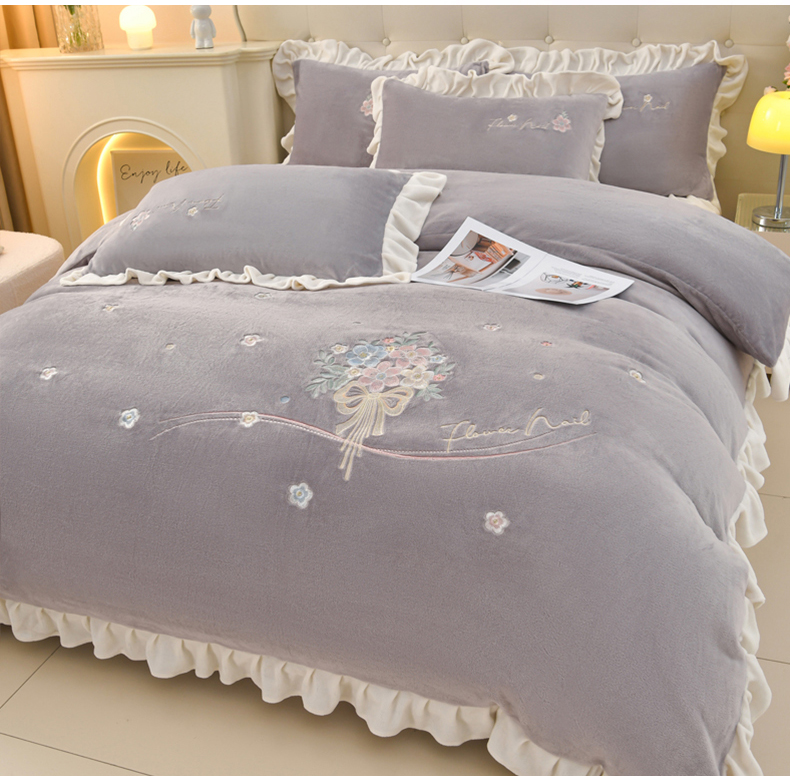 梦之星 2025新款刺绣韩式花边牛奶绒四件套 花束-灰