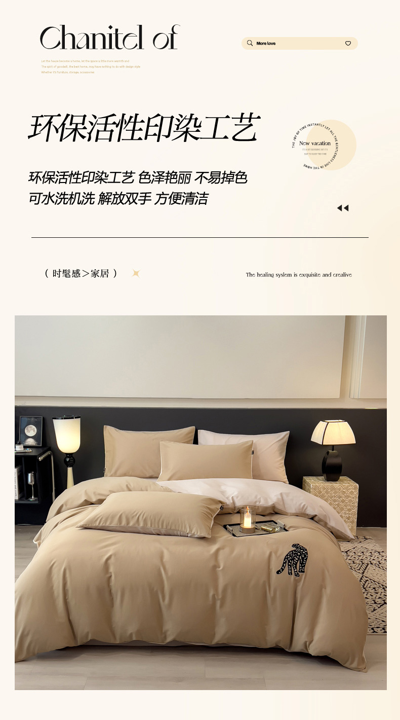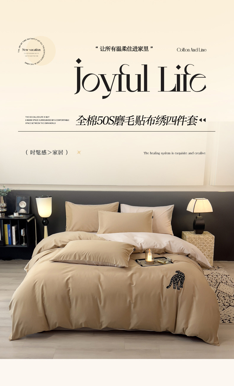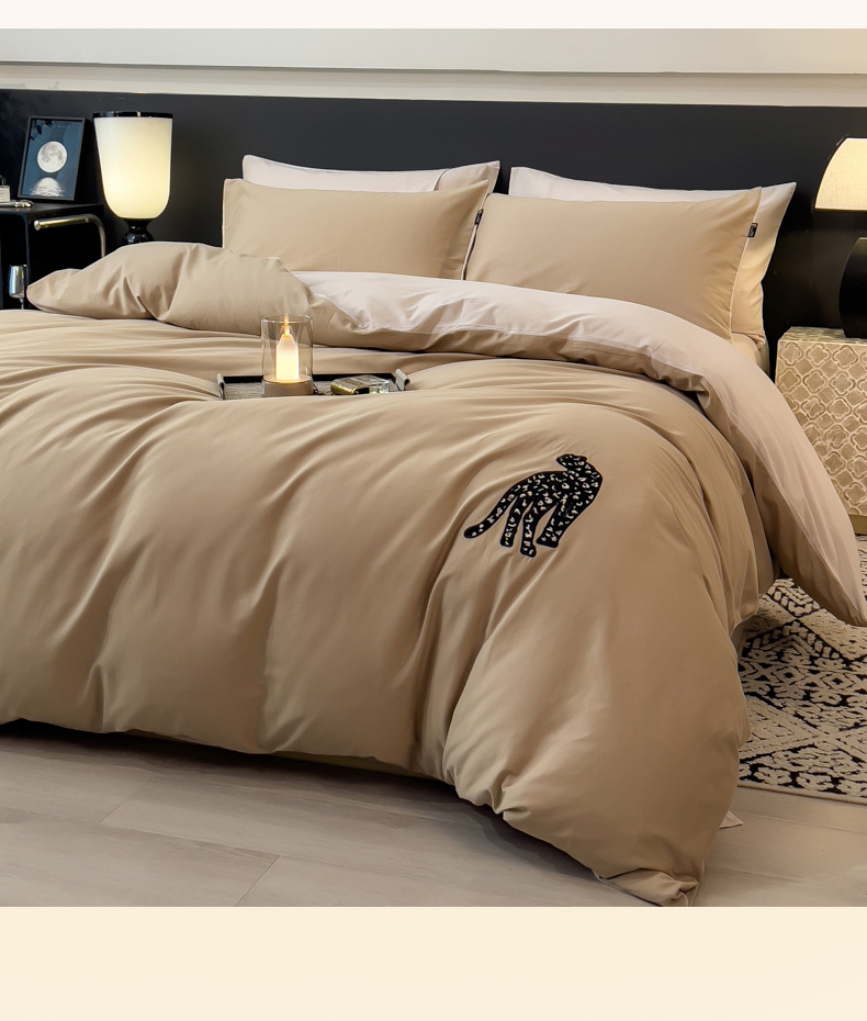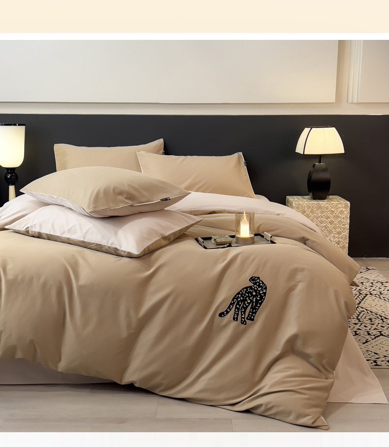 商品名称:印季家纺 2025新款全棉50s磨毛绣花-黑豹四件套 浅驼-玛卡粉