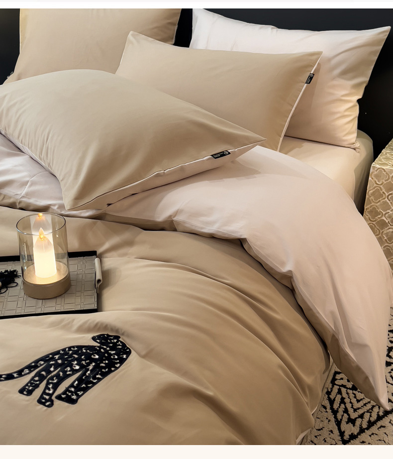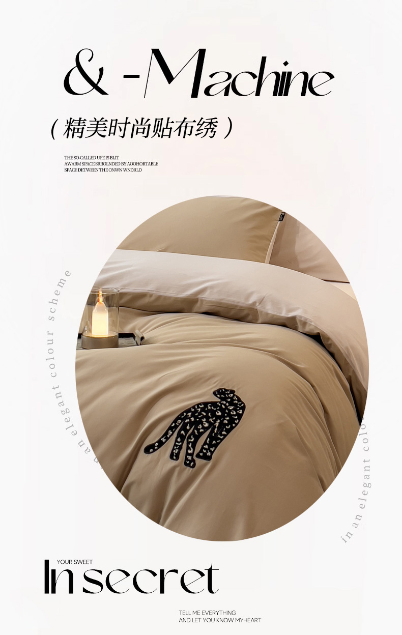 印季家纺 2025新款全棉50s磨毛绣花-黑豹四件套 浅驼-玛卡粉