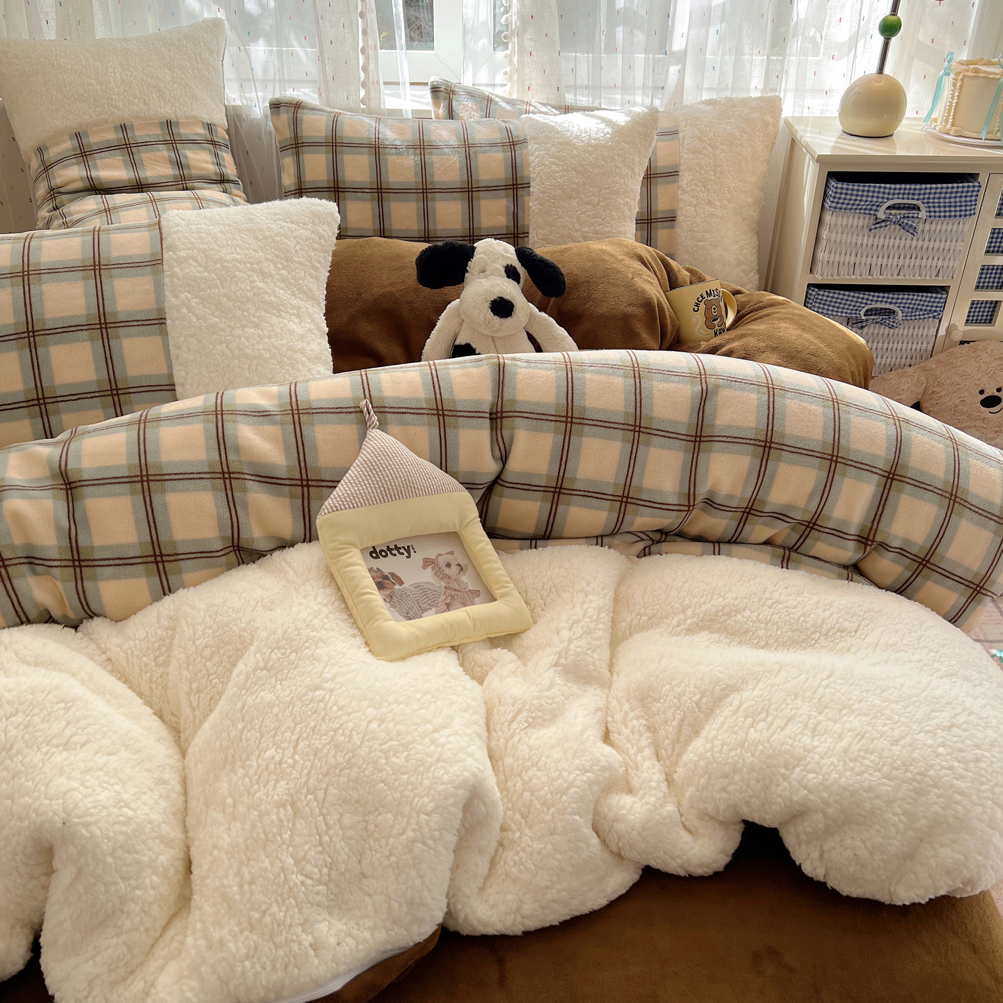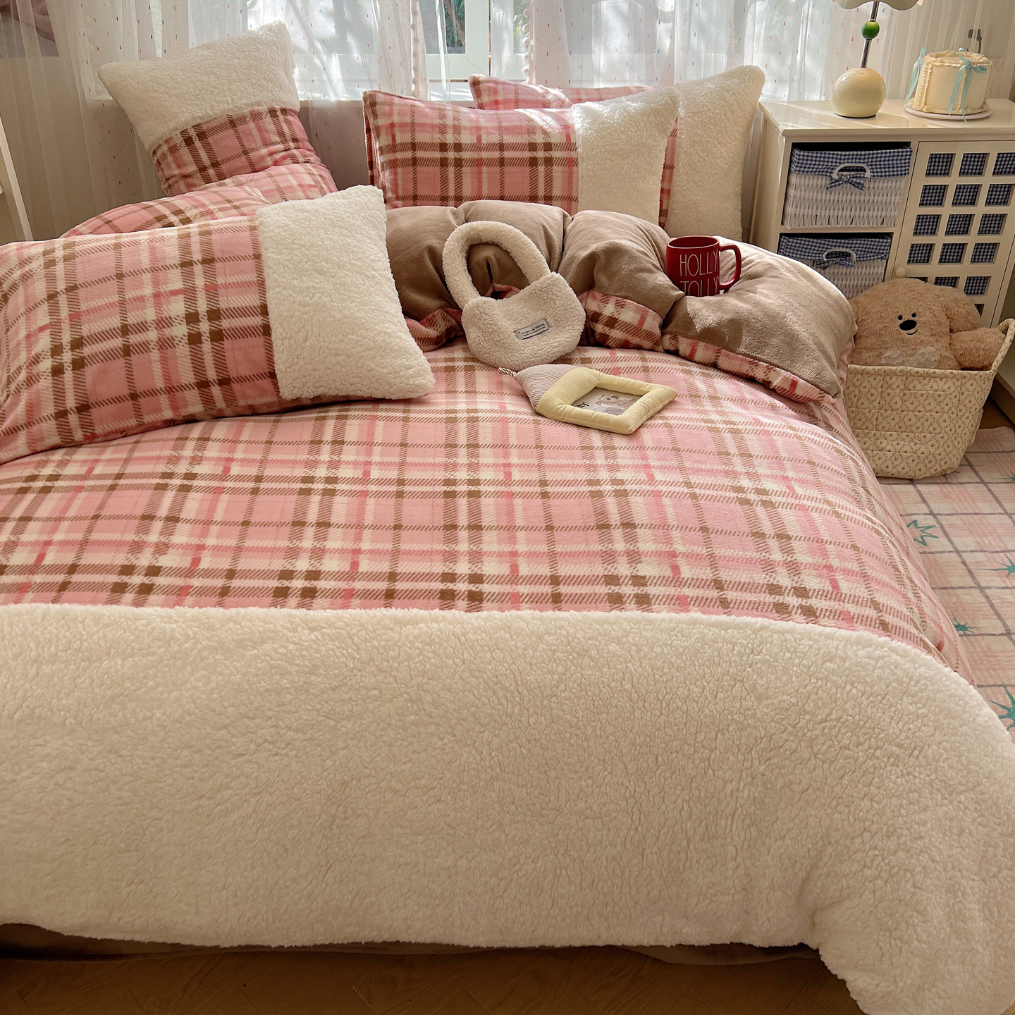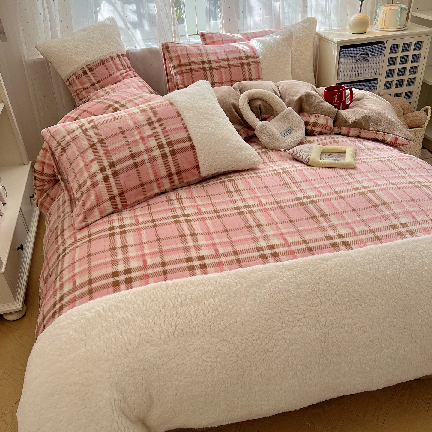 (总)顾里家纺 2024新款ins韩系牛奶羊羔绒套件,羊羔粉黄,羊羔白蓝,羊羔黄蓝,羊羔灰,羊羔咖,羊羔蓝,羊羔蓝黄,羊羔绿粉,羊羔米,羊羔奶黄,羊羔暖咖,羊羔紫