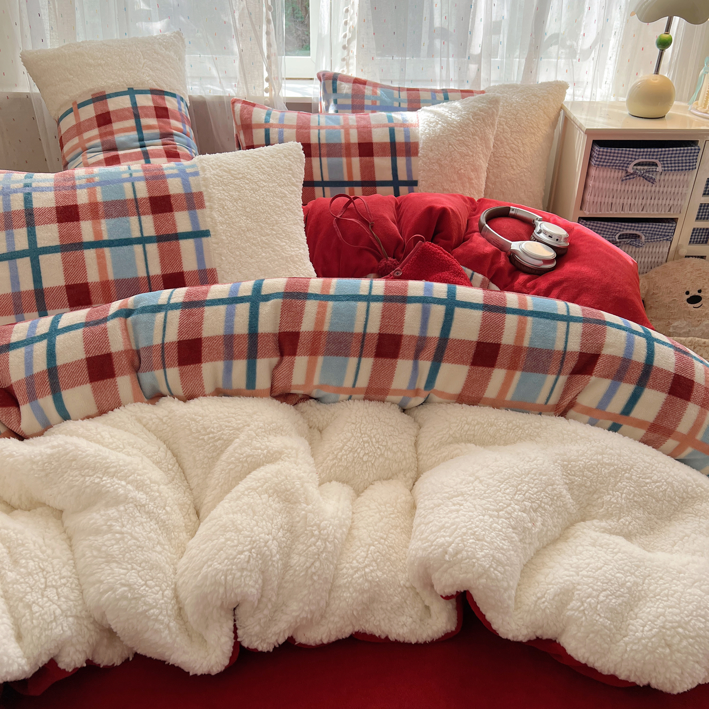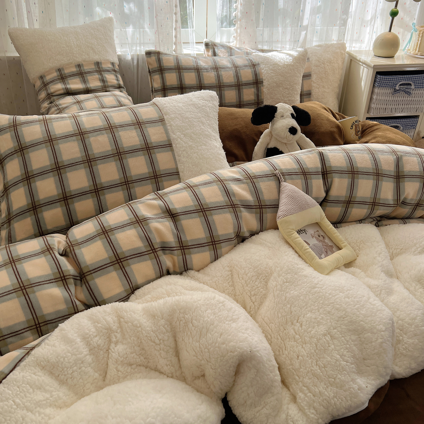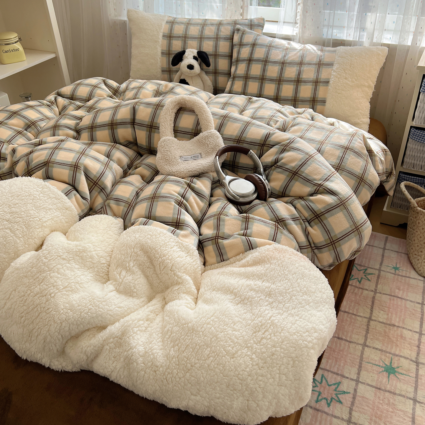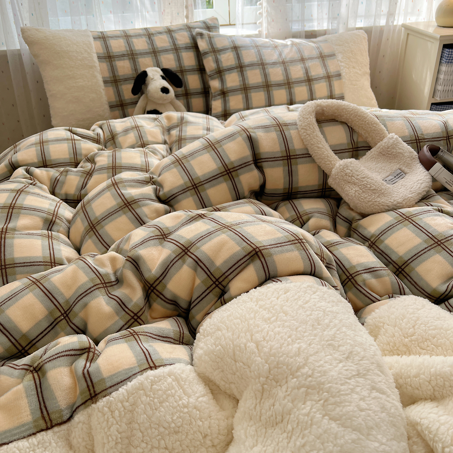 (总)顾里家纺 2024新款ins韩系牛奶羊羔绒套件,羊羔粉黄,羊羔白蓝,羊羔黄蓝,羊羔灰,羊羔咖,羊羔蓝,羊羔蓝黄,羊羔绿粉,羊羔米,羊羔奶黄,羊羔暖咖,羊羔紫