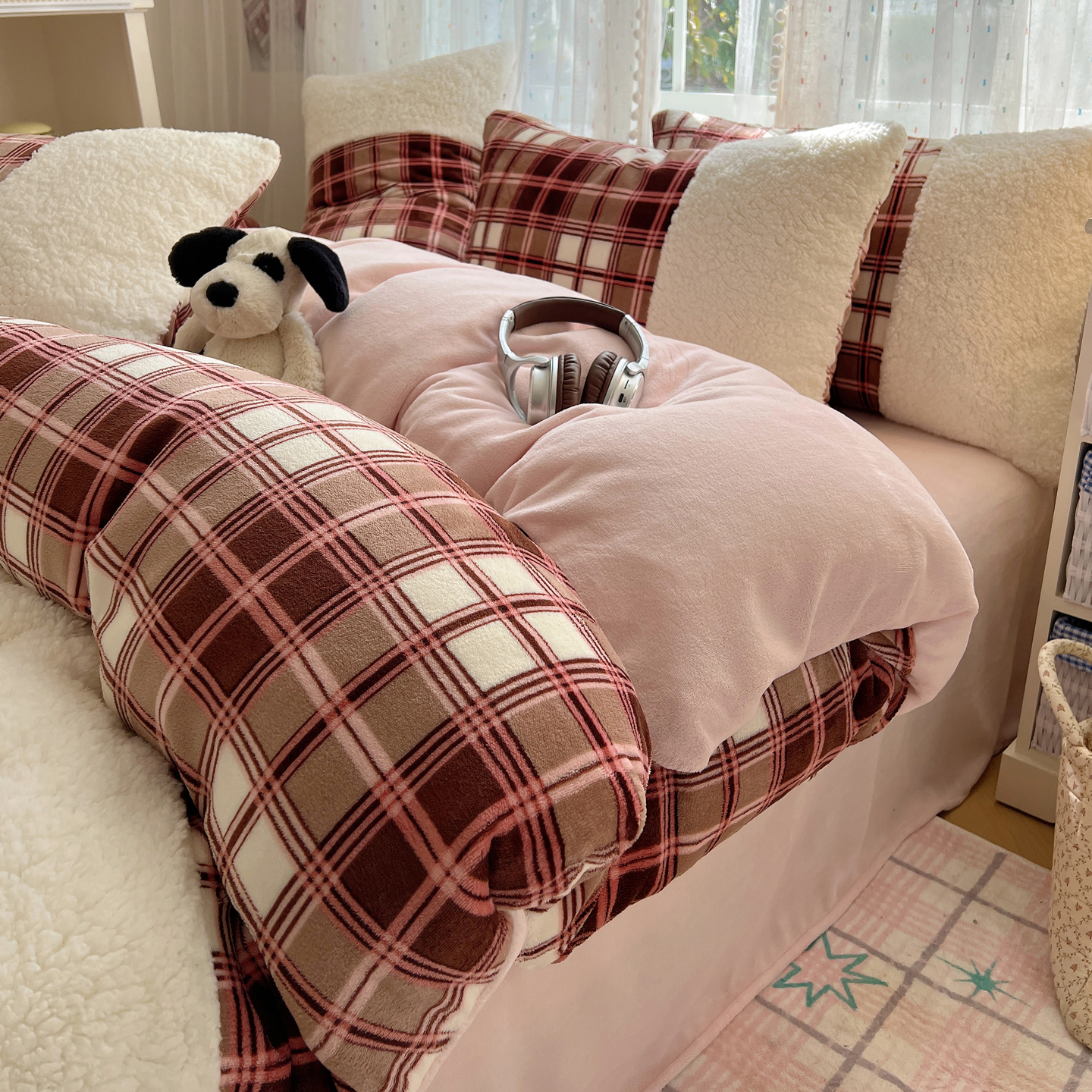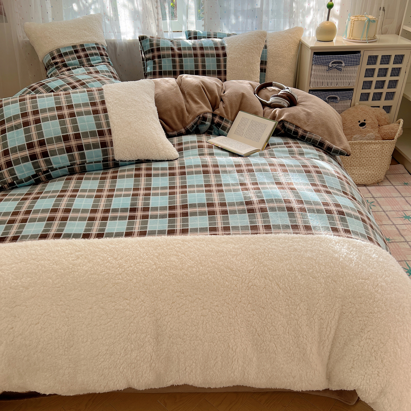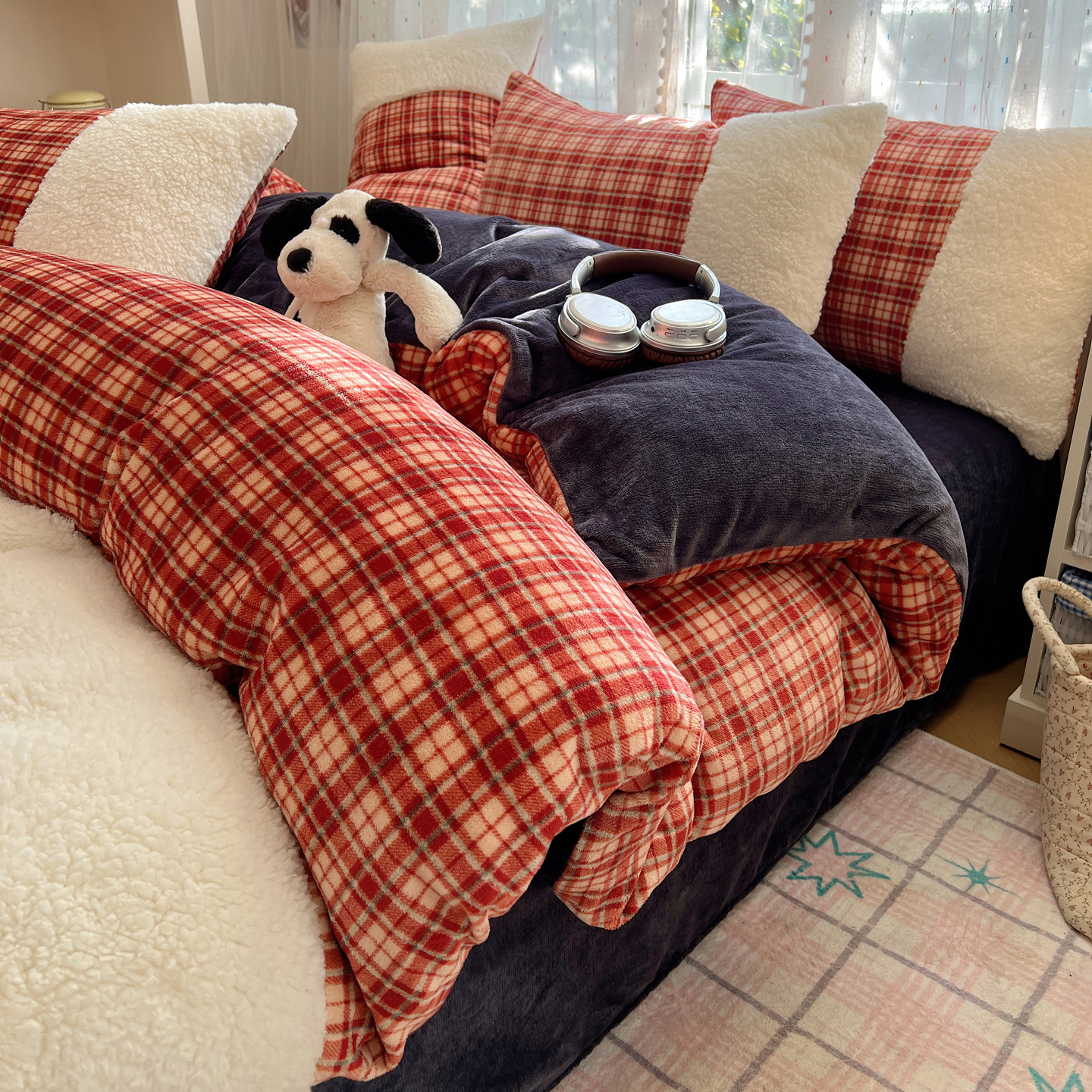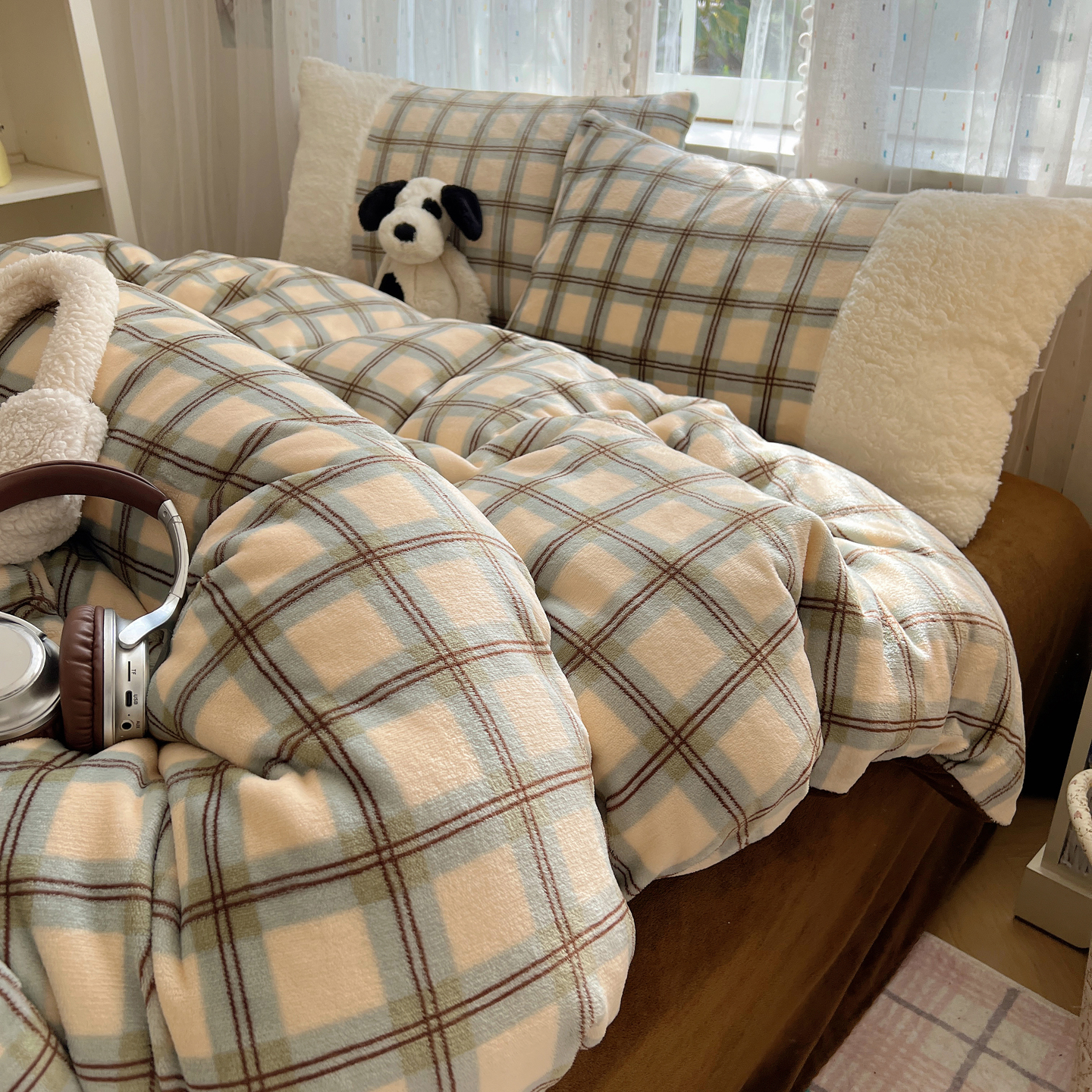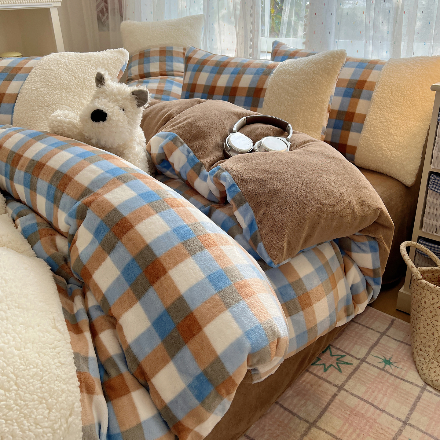 商品名称:(总)顾里家纺 2025新款复古博主风高克重羊羔毛拼接牛奶绒套件