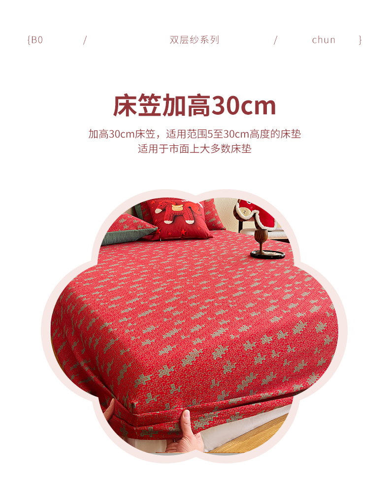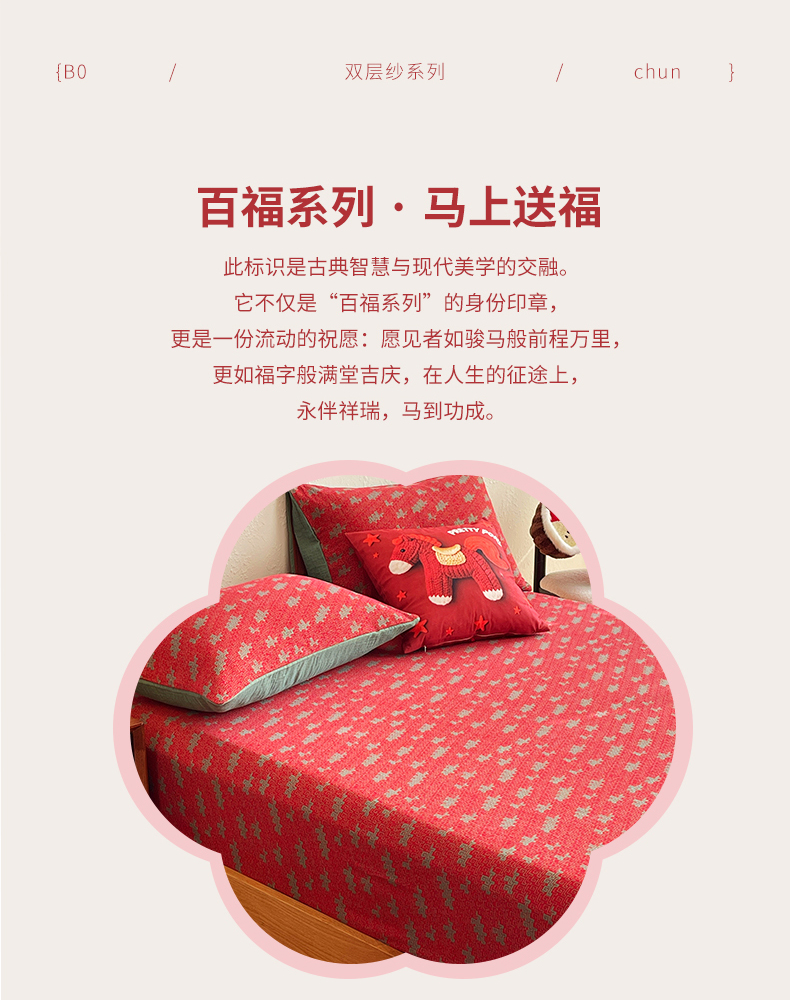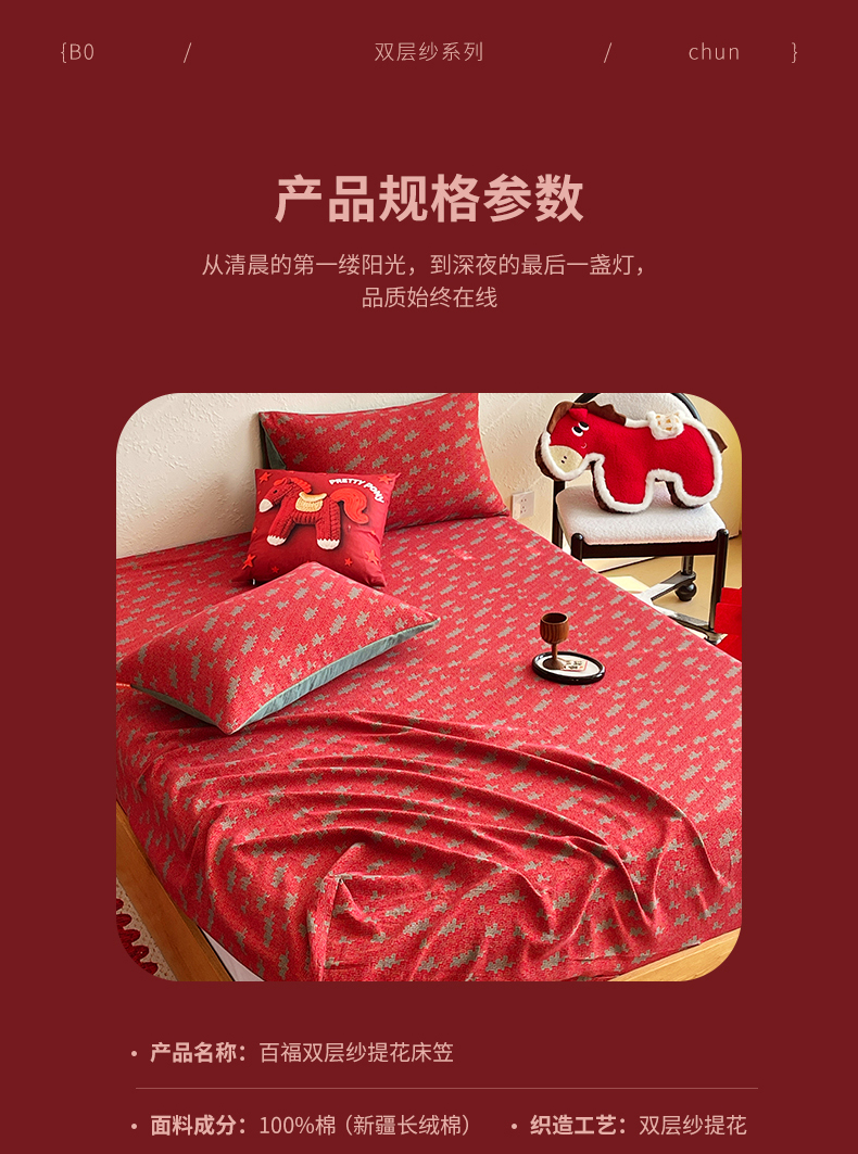 • 91家纺网 家纺一手货源 找家纺 春皖家纺 2026新款全棉色织双层纱提花百福系列拉链款-单床笠 红赤兔