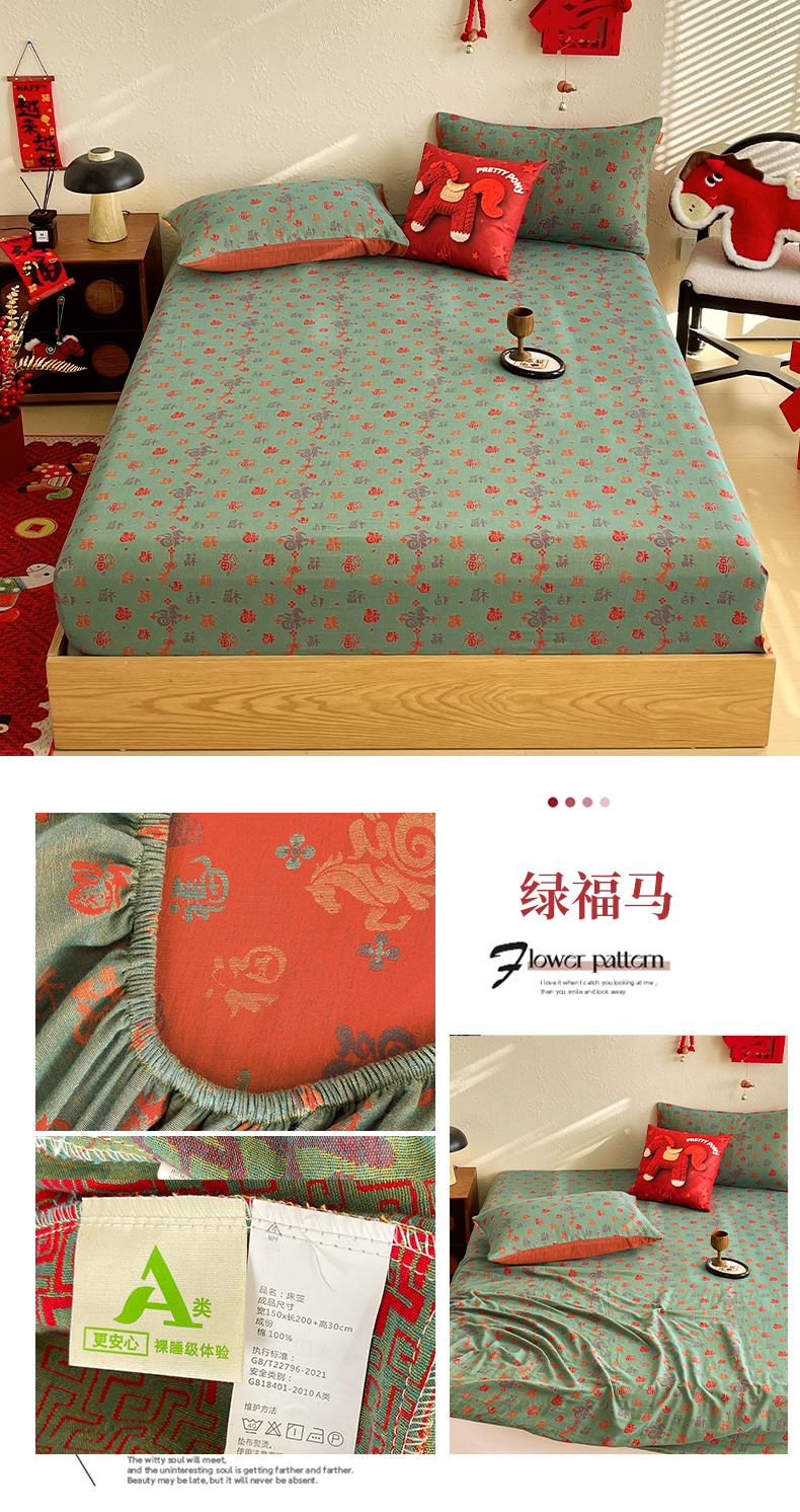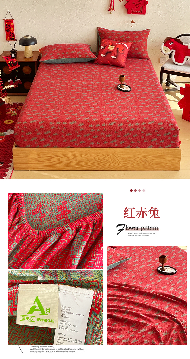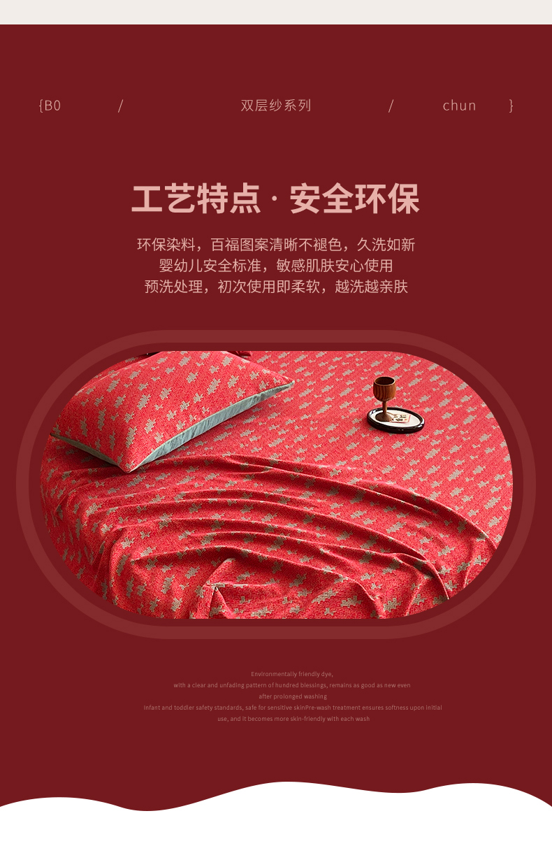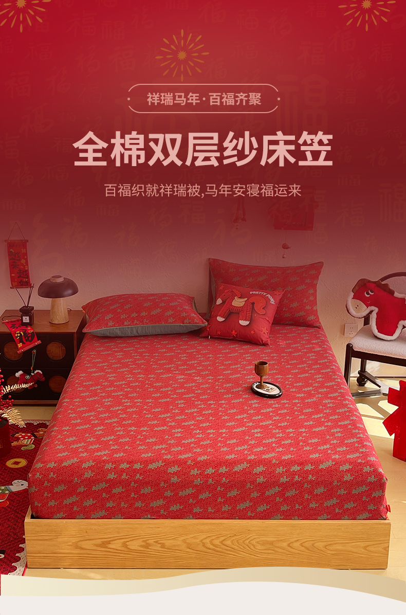 春皖家纺 2026新款全棉色织双层纱提花百福系列拉链款-单床笠 红赤兔