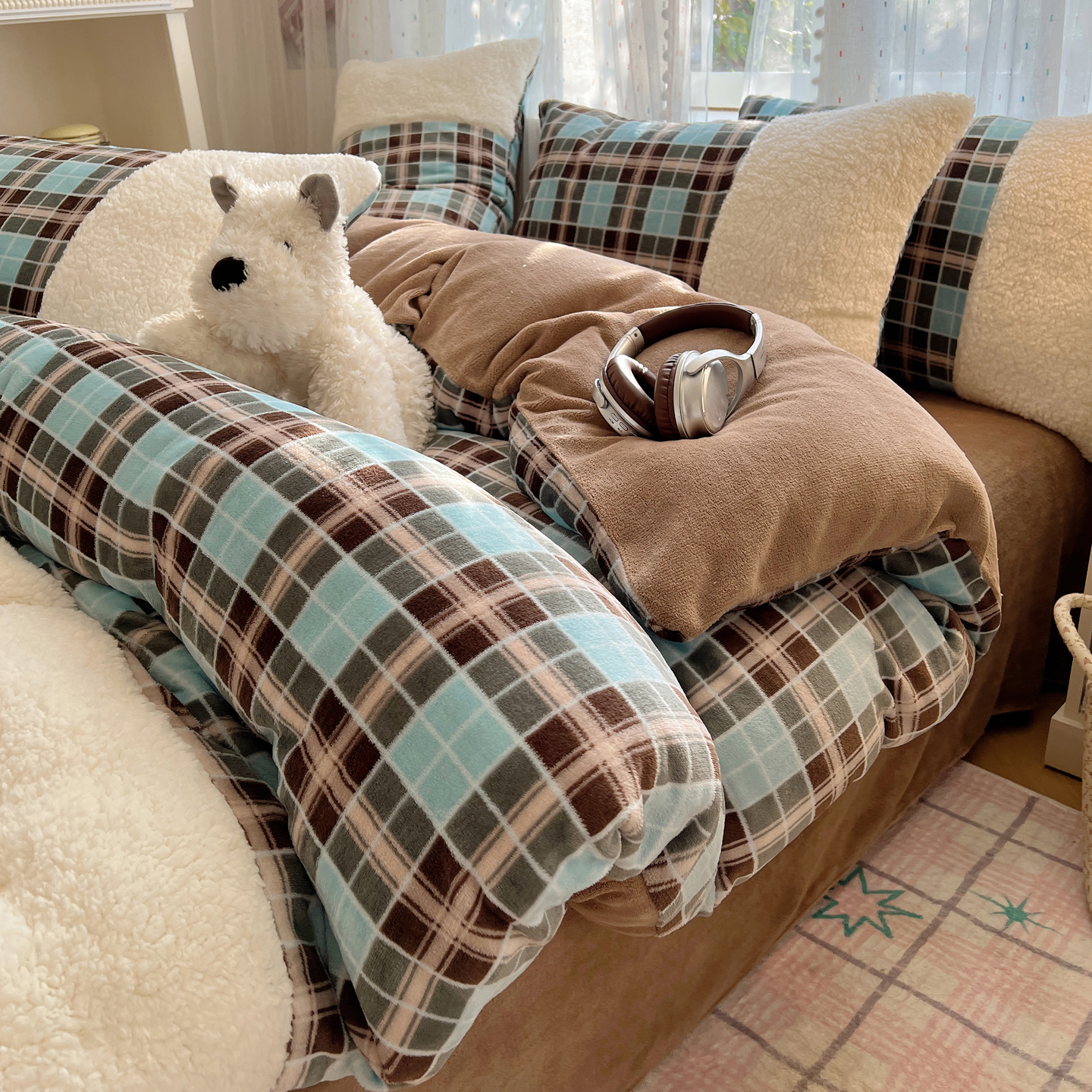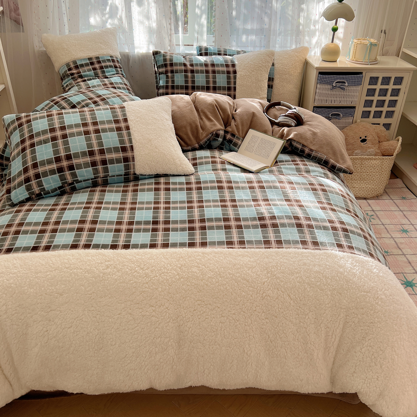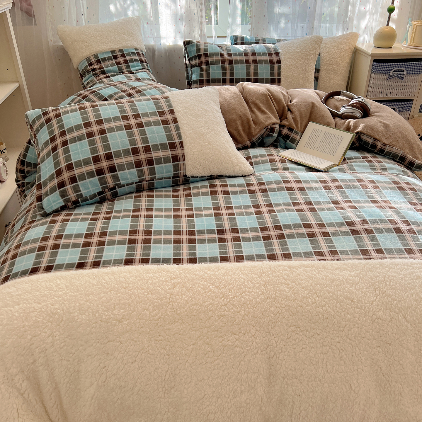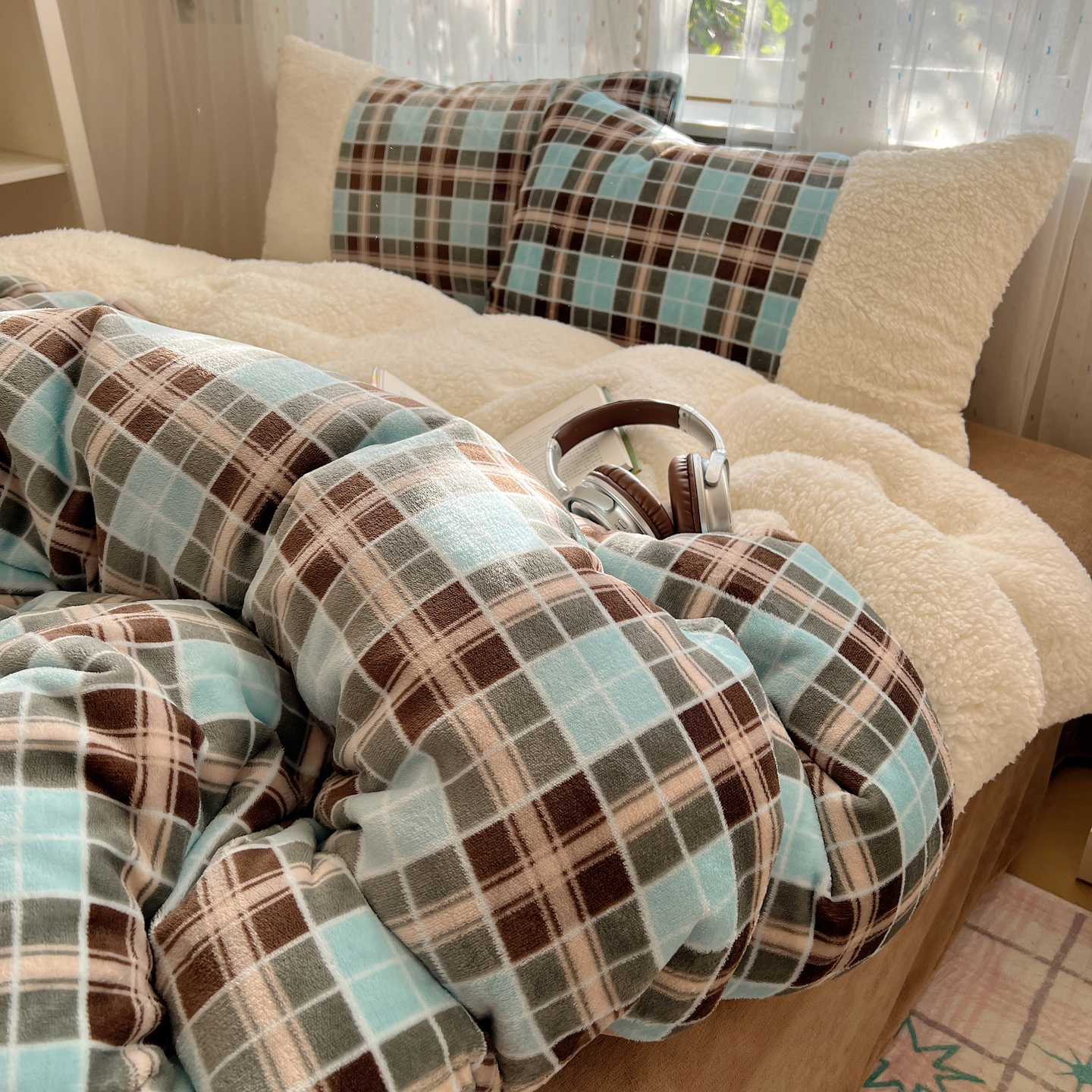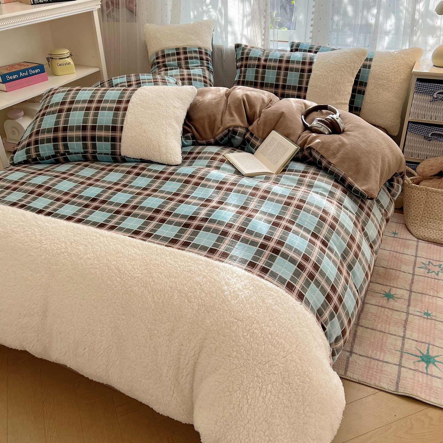 商品名称:顾里家纺 2025新款复古博主风高克重羊羔毛拼接牛奶绒套件 薄荷甜巧