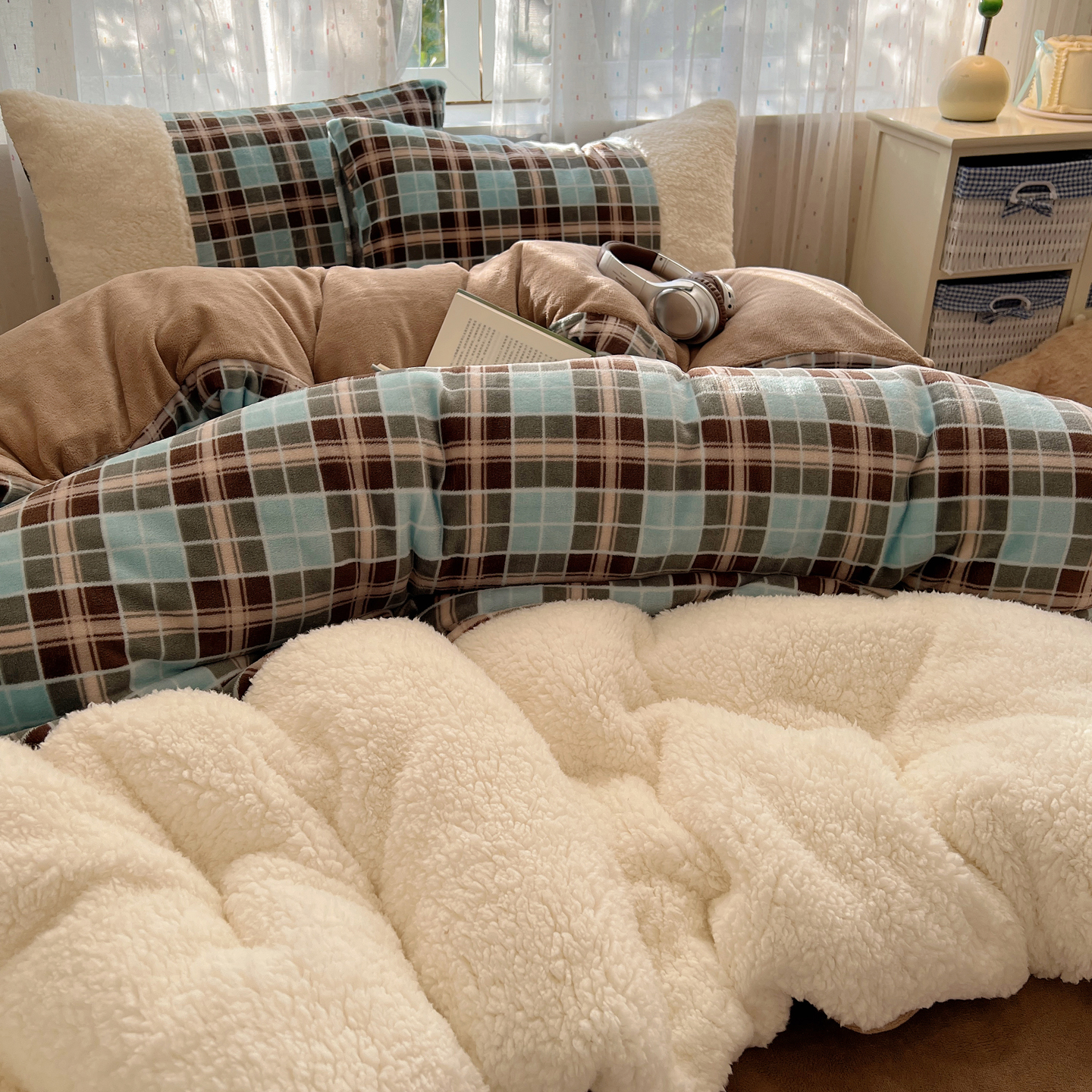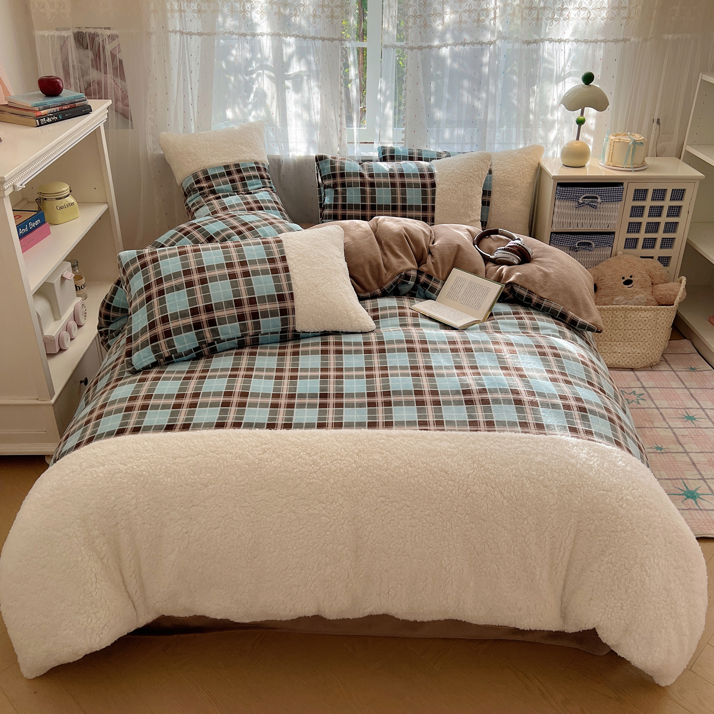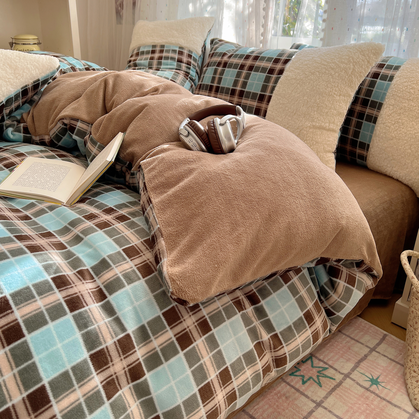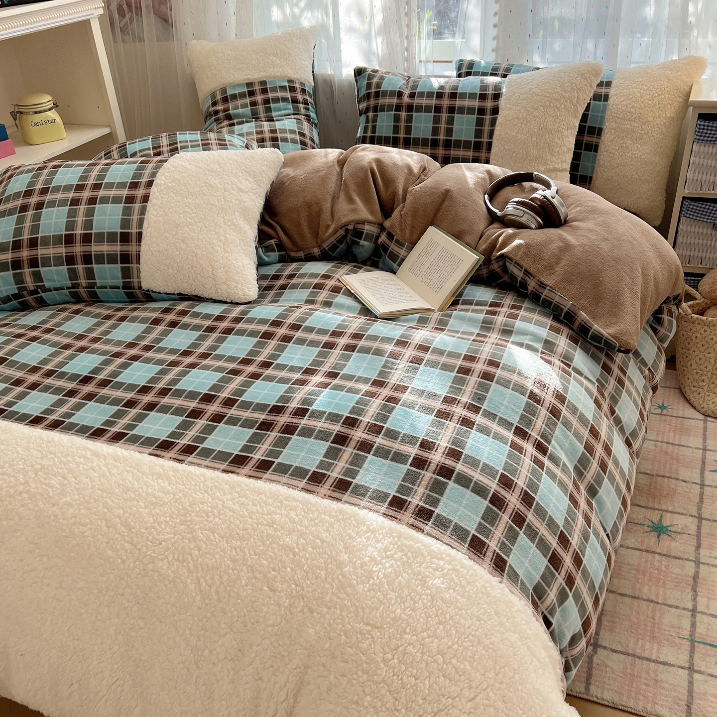 商品名称:顾里家纺 2025新款复古博主风高克重羊羔毛拼接牛奶绒套件 薄荷甜巧