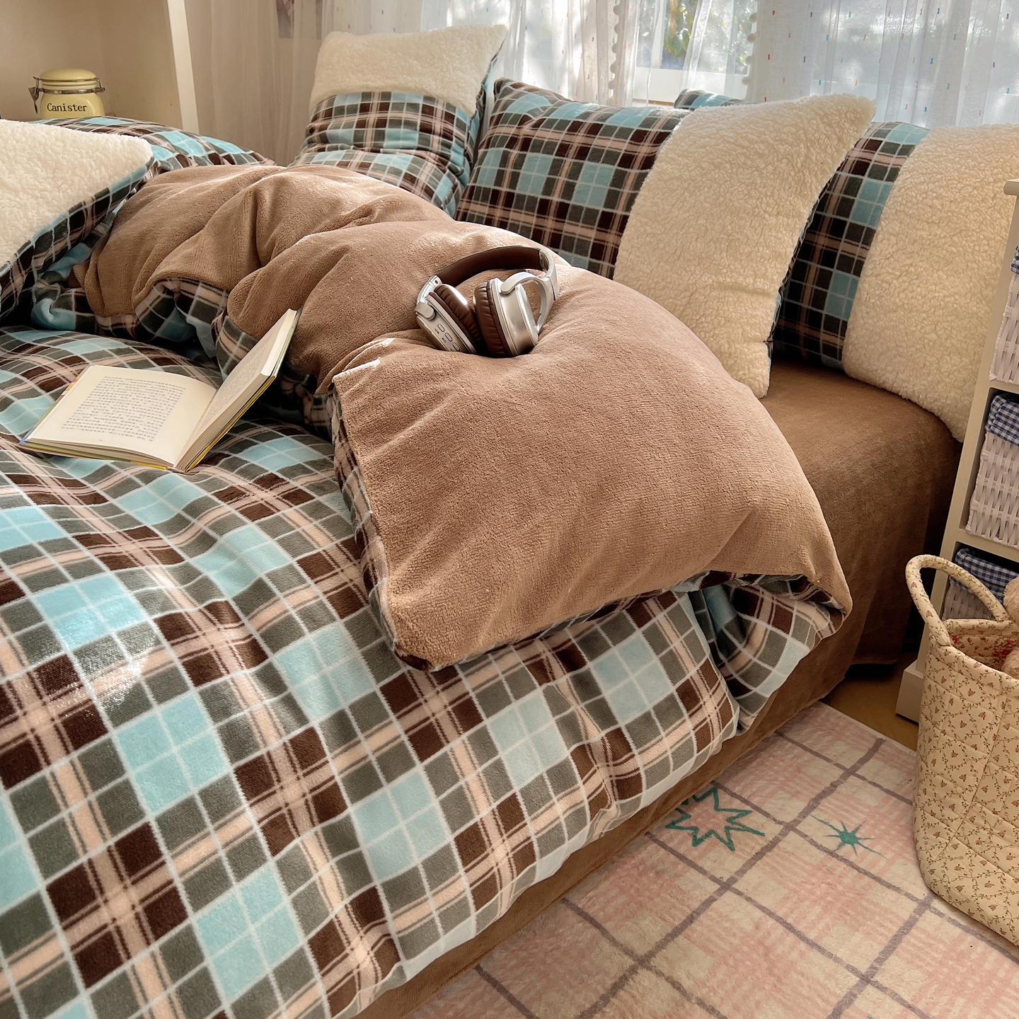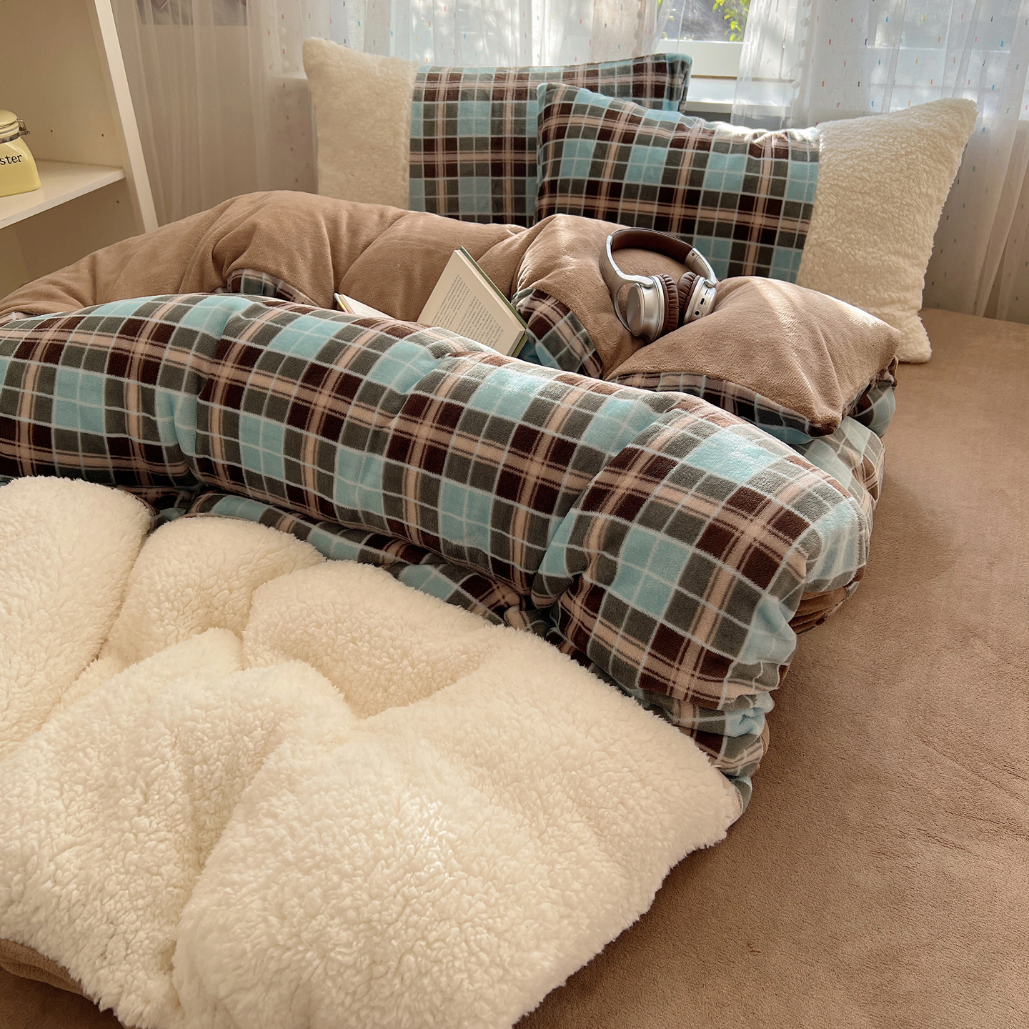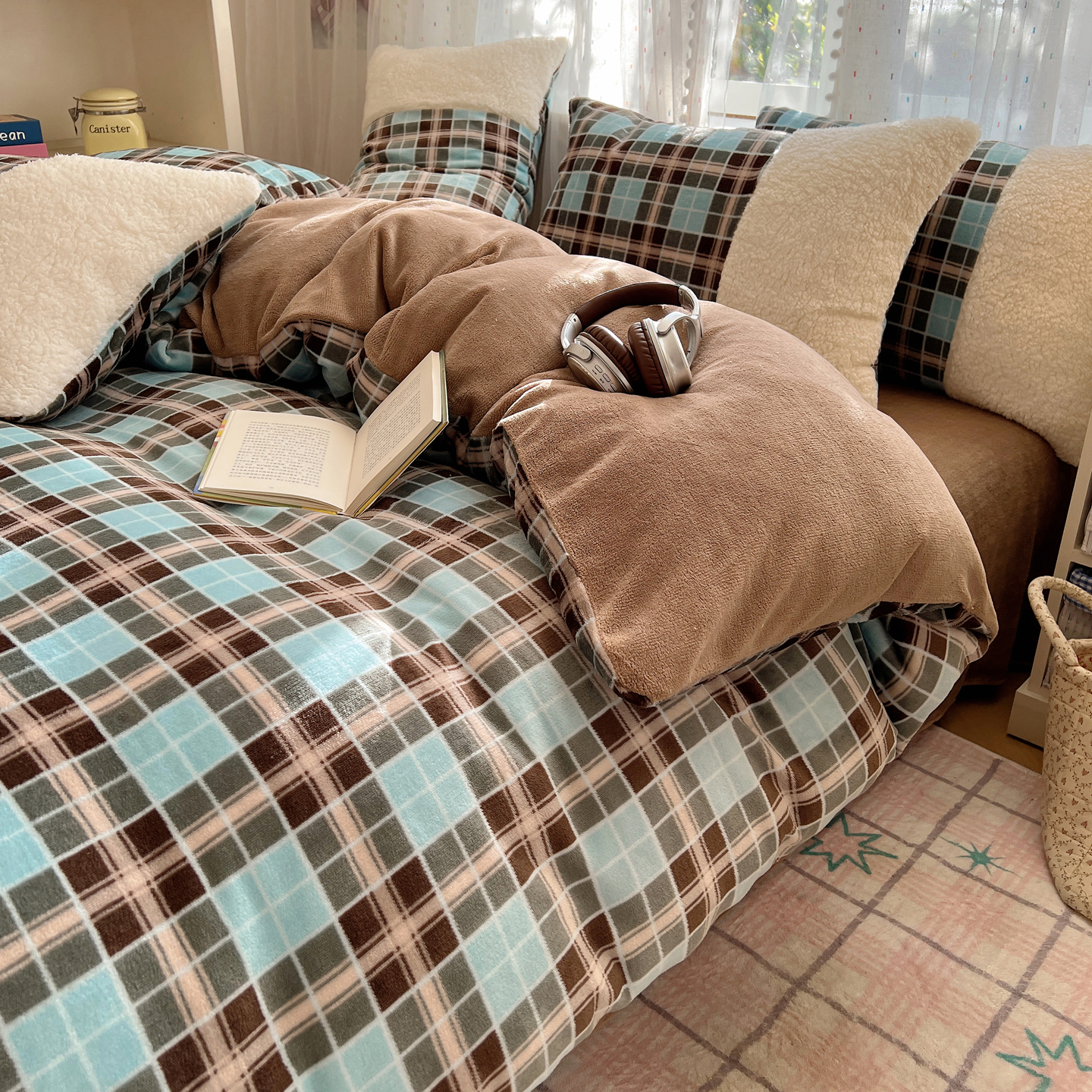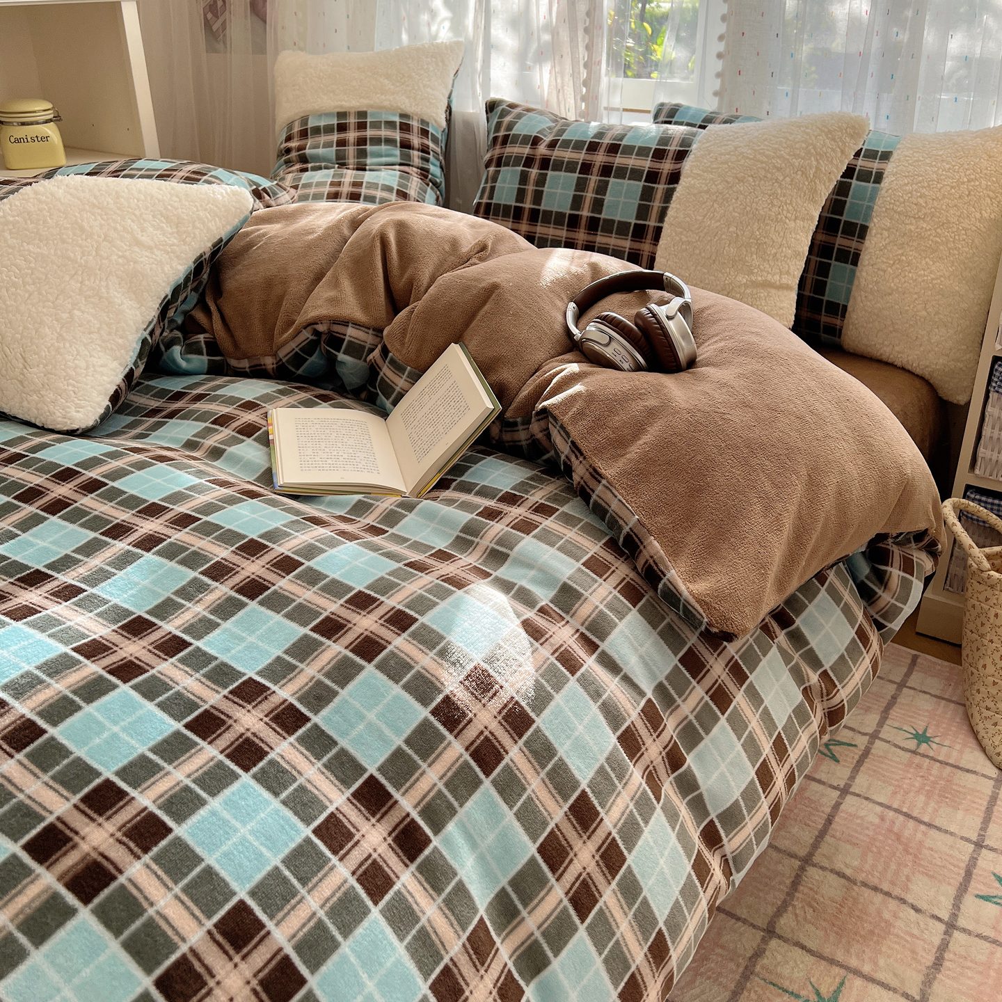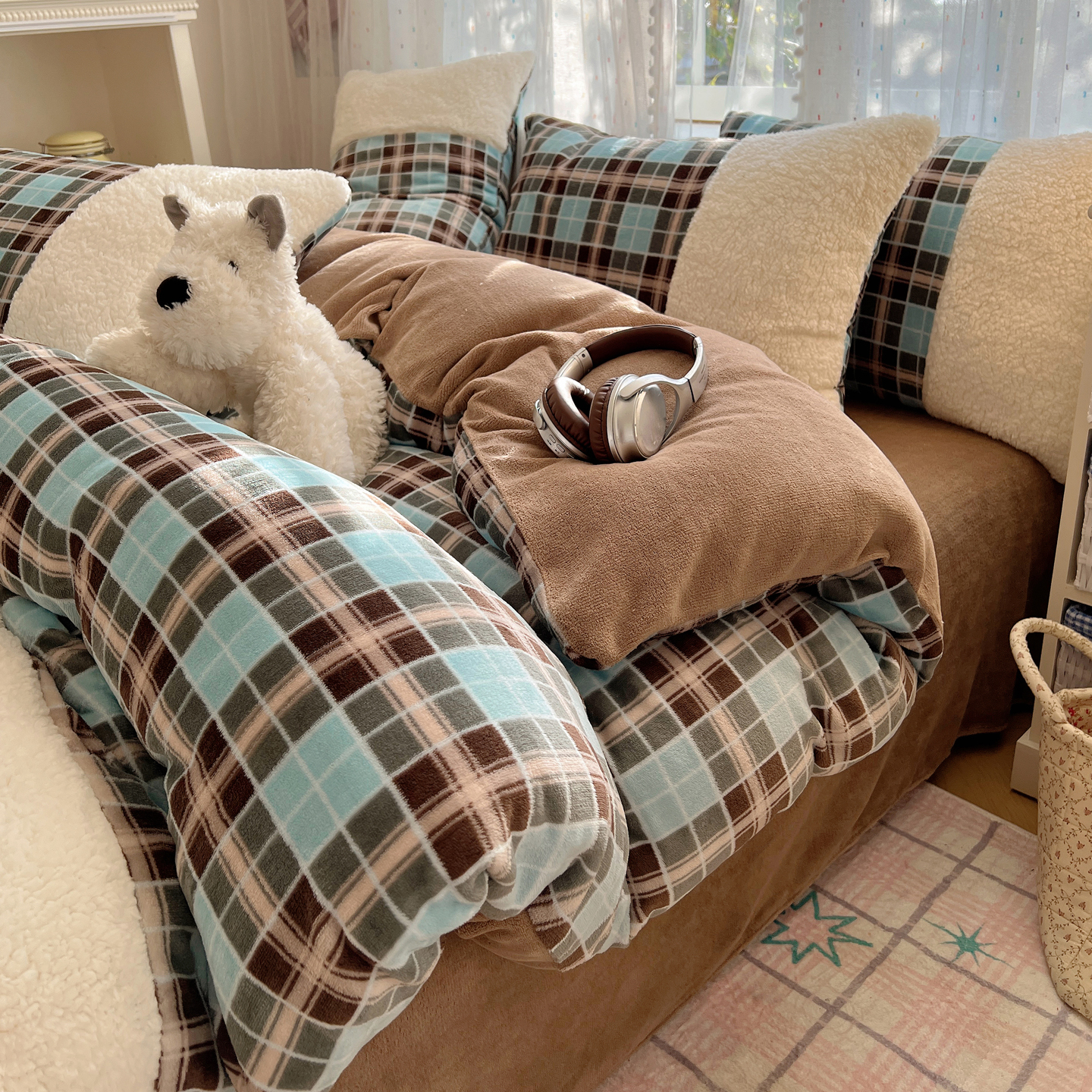 商品名称:顾里家纺 2025新款复古博主风高克重羊羔毛拼接牛奶绒套件 薄荷甜巧