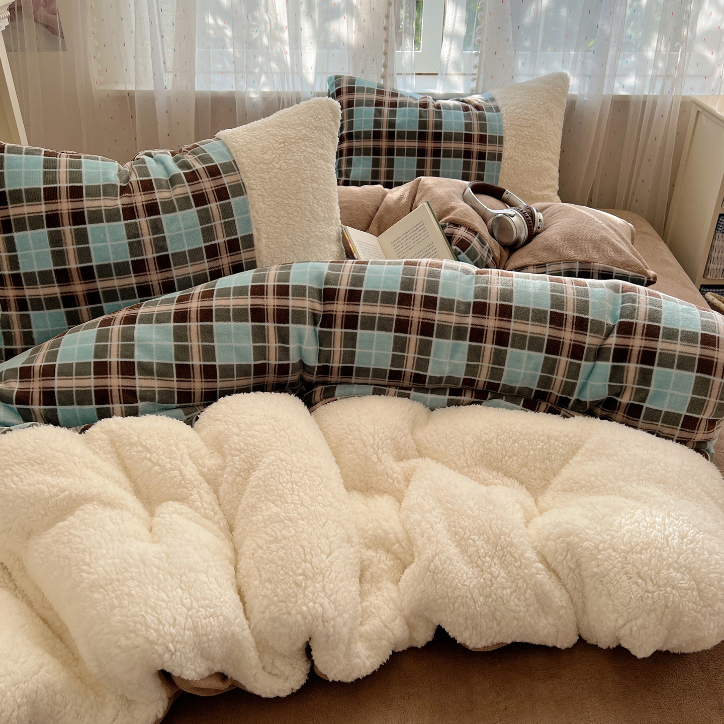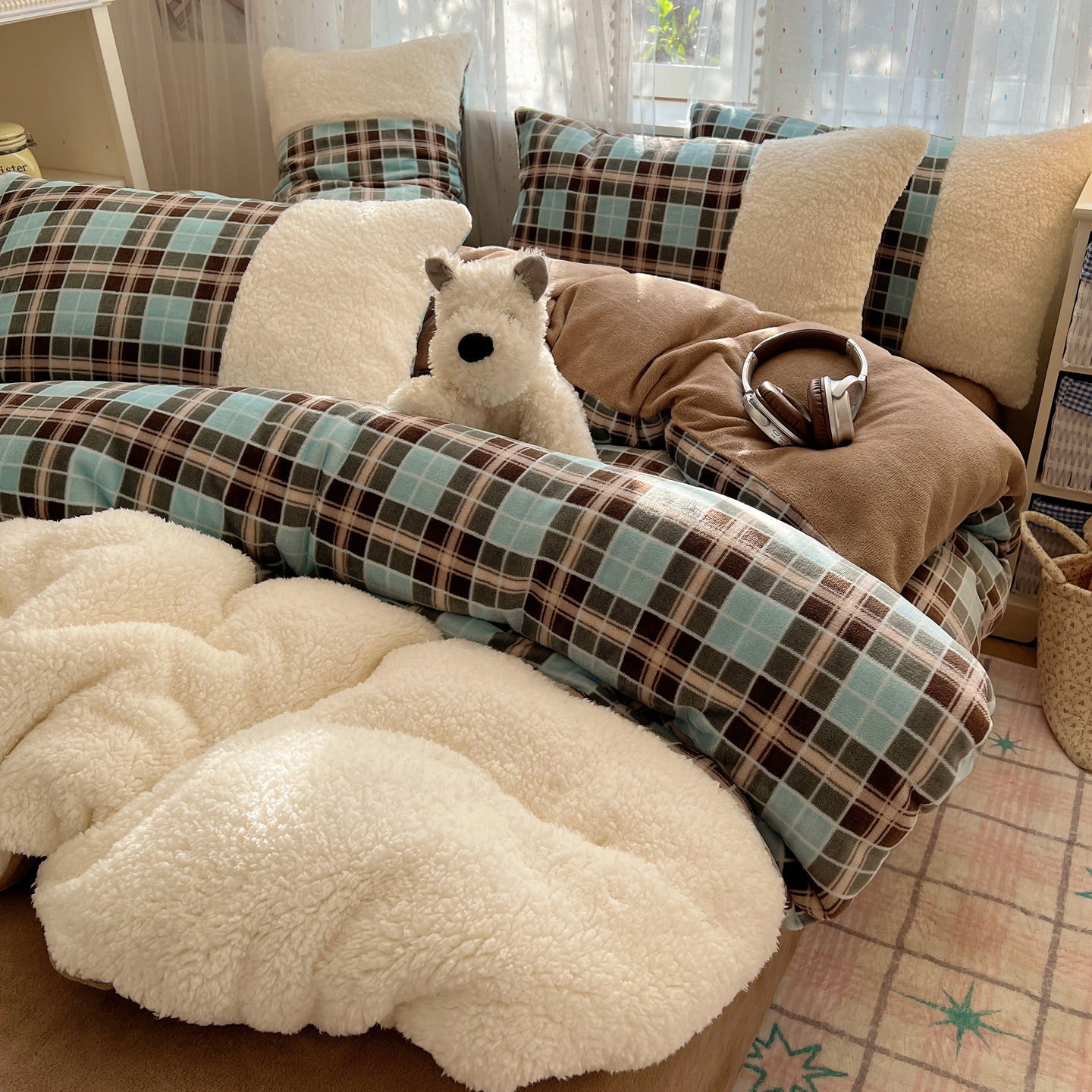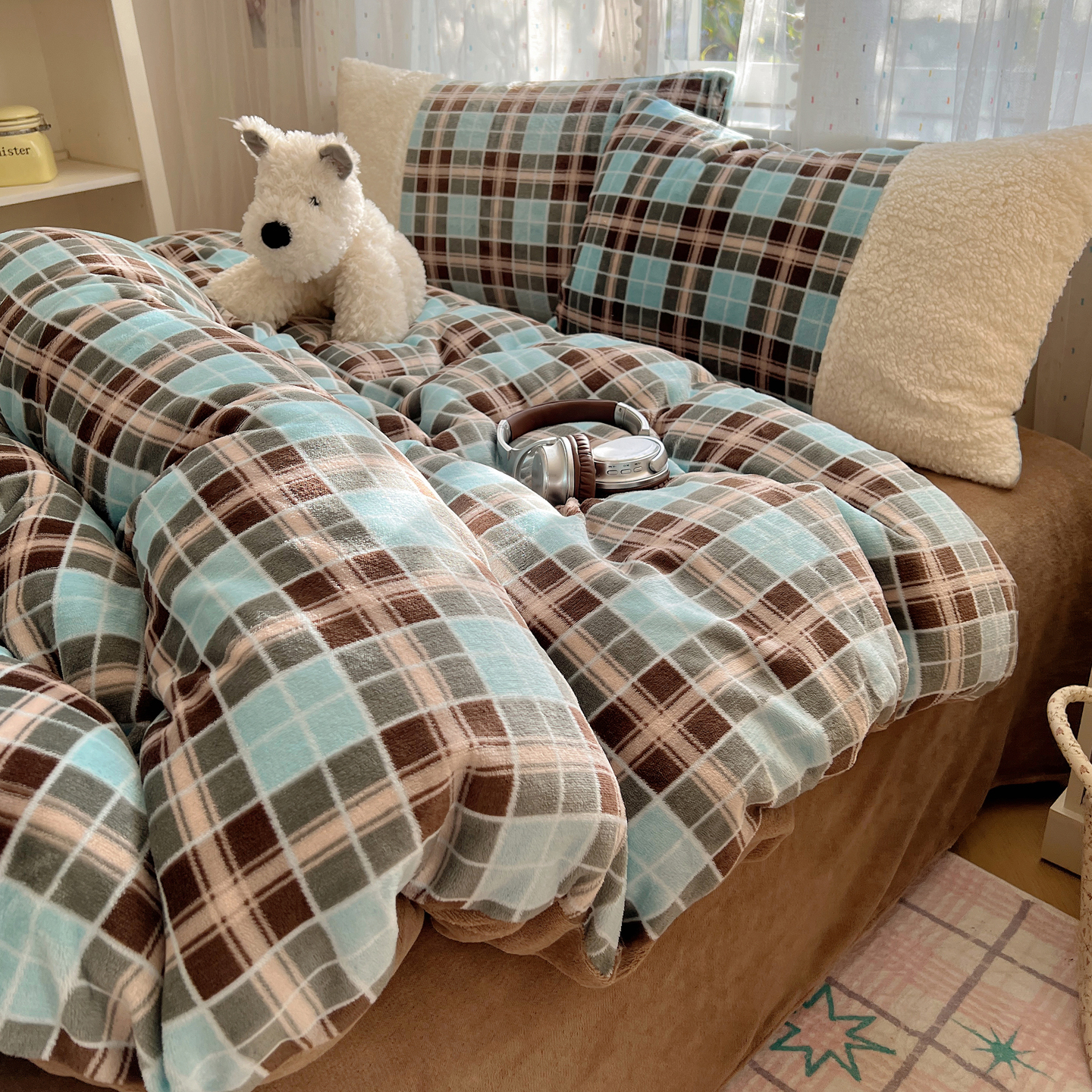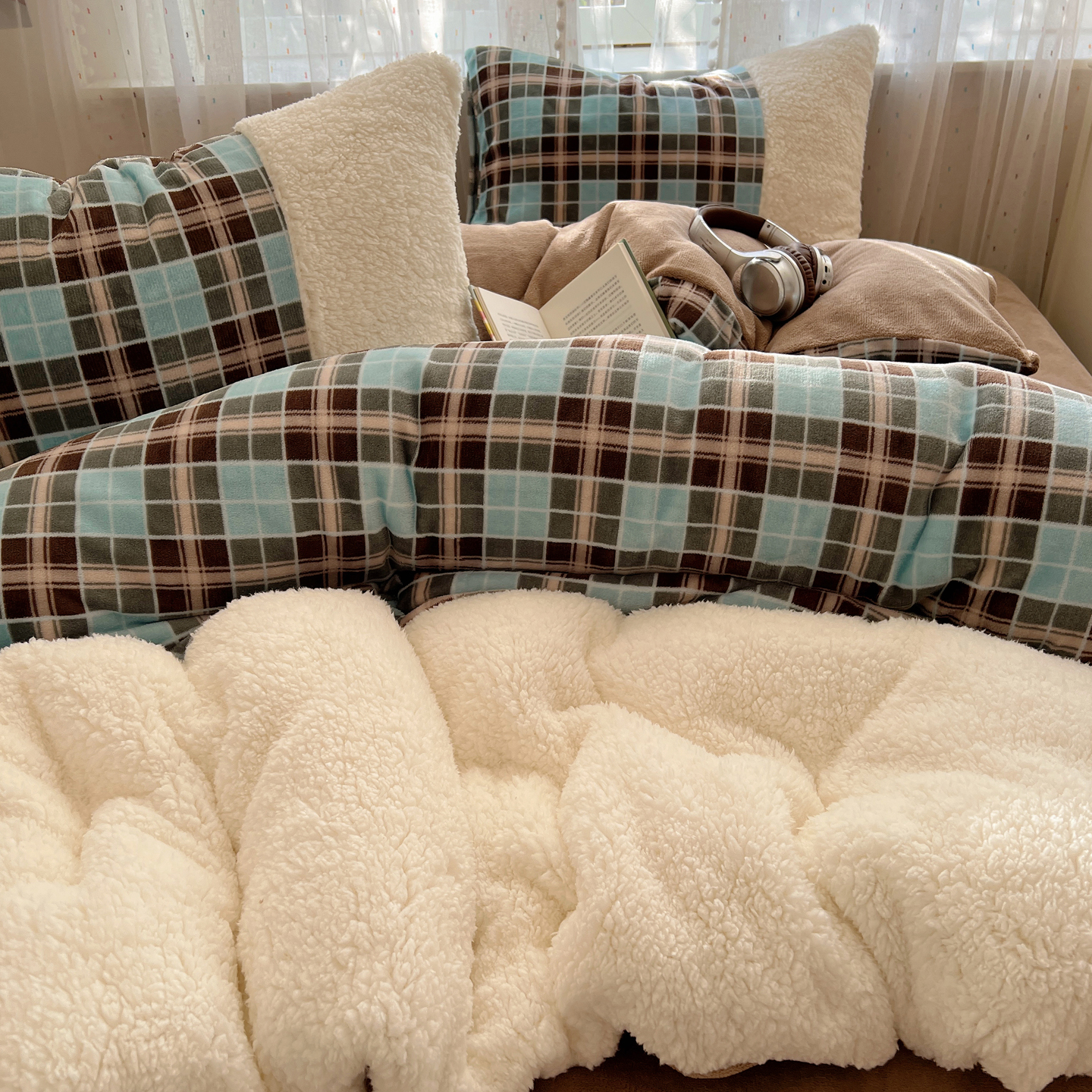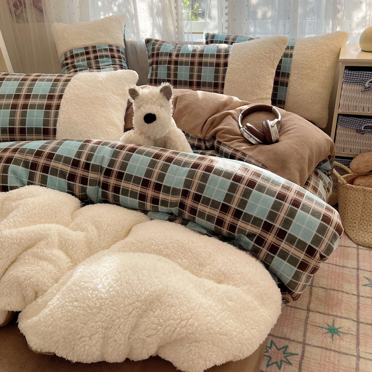 商品名称:顾里家纺 2025新款复古博主风高克重羊羔毛拼接牛奶绒套件 薄荷甜巧