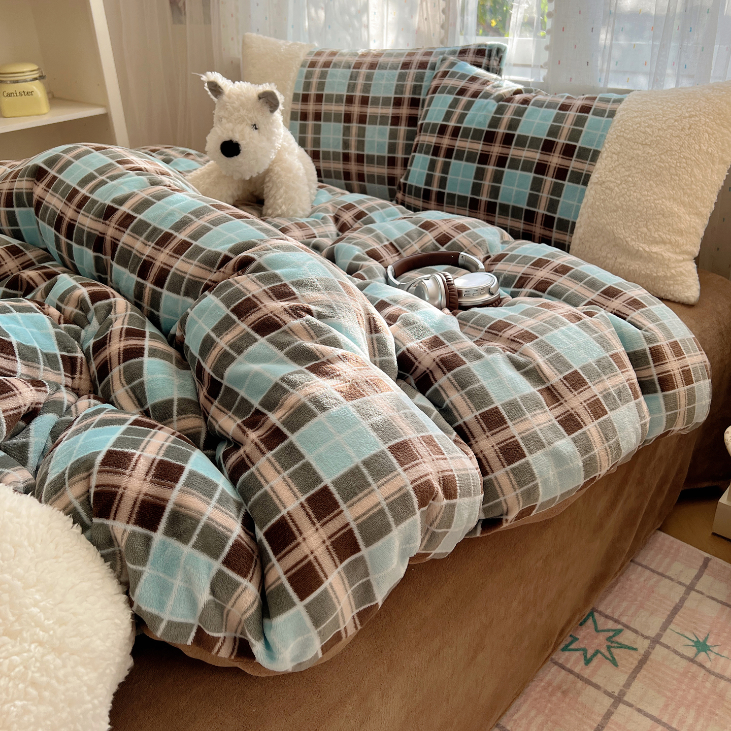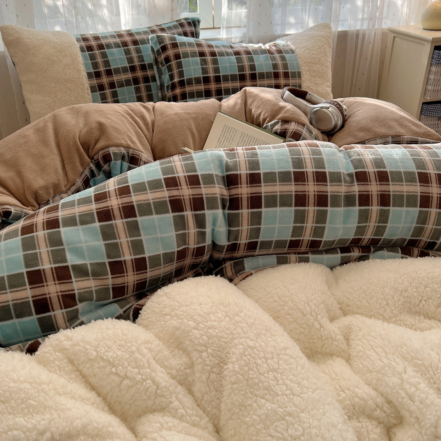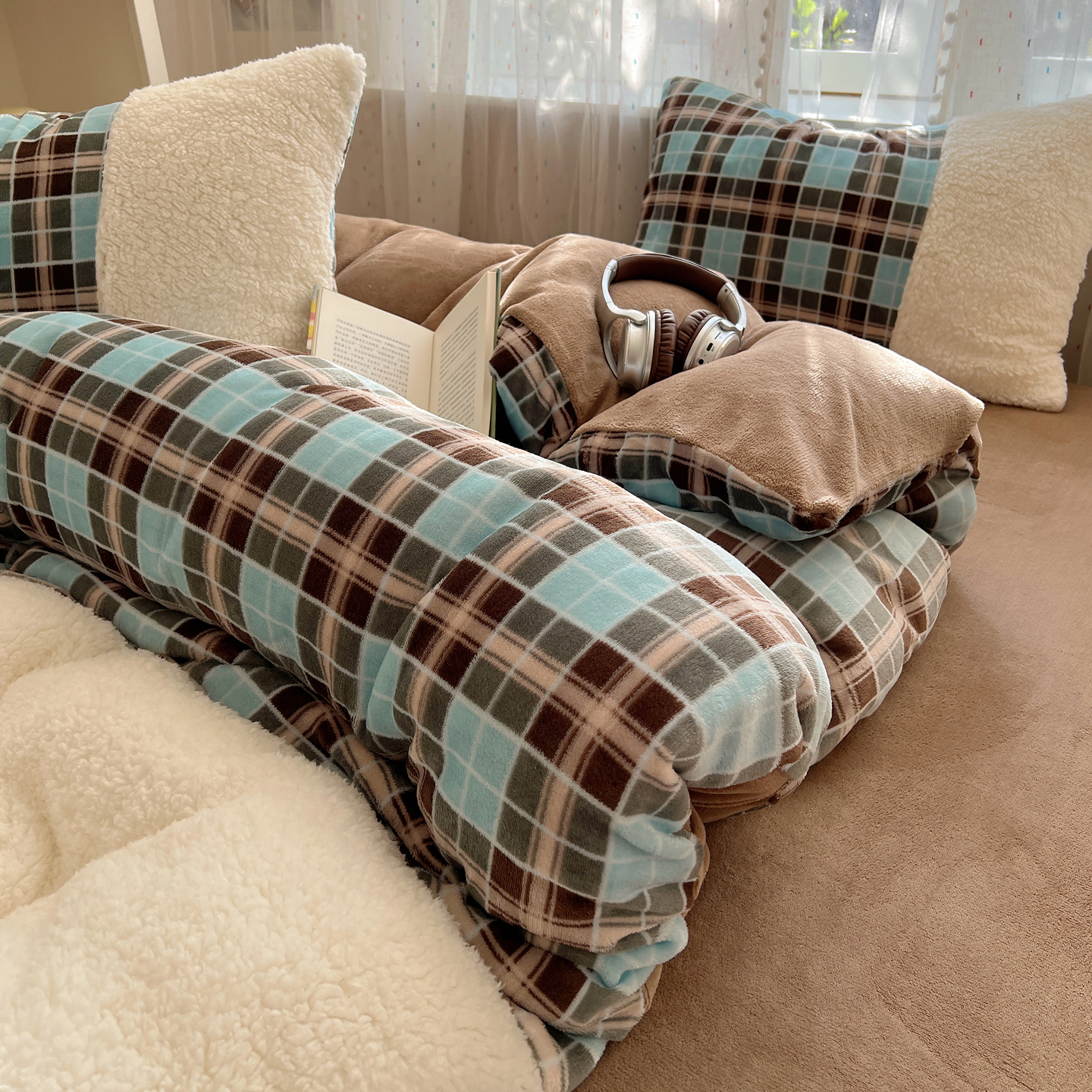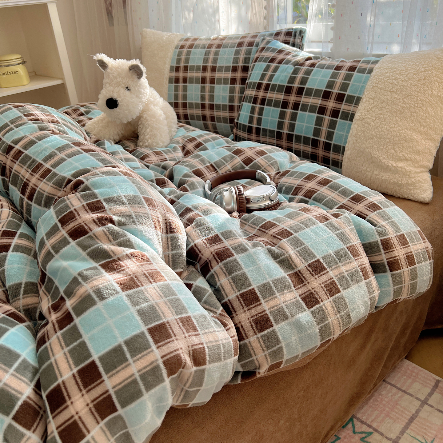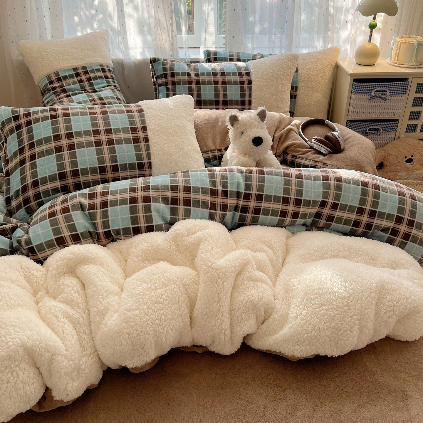 商品名称:顾里家纺 2025新款复古博主风高克重羊羔毛拼接牛奶绒套件 薄荷甜巧
