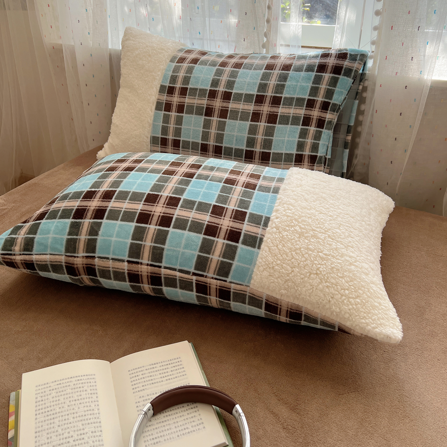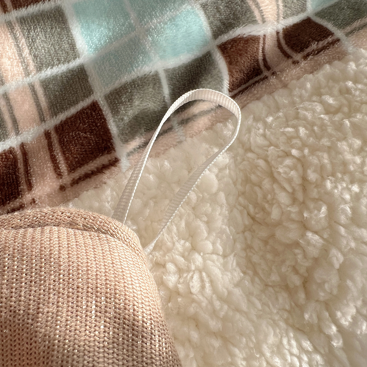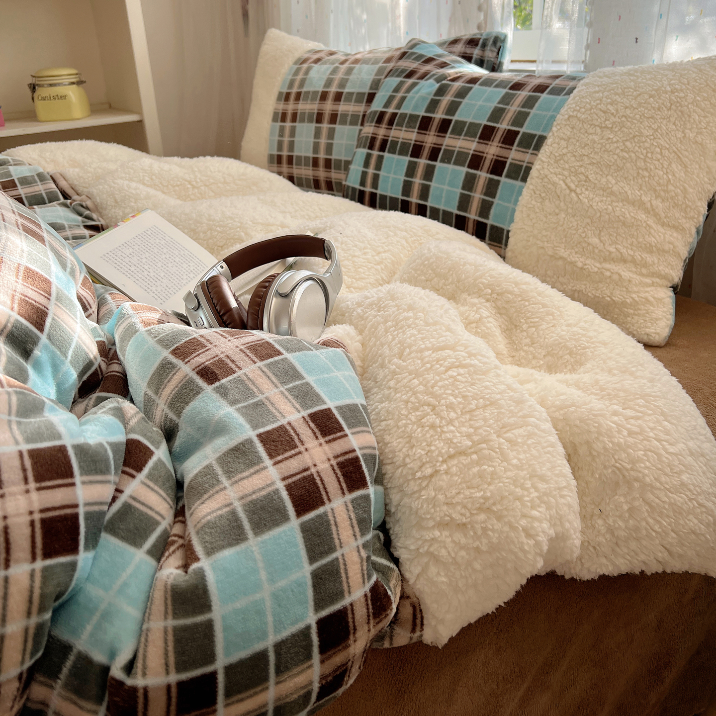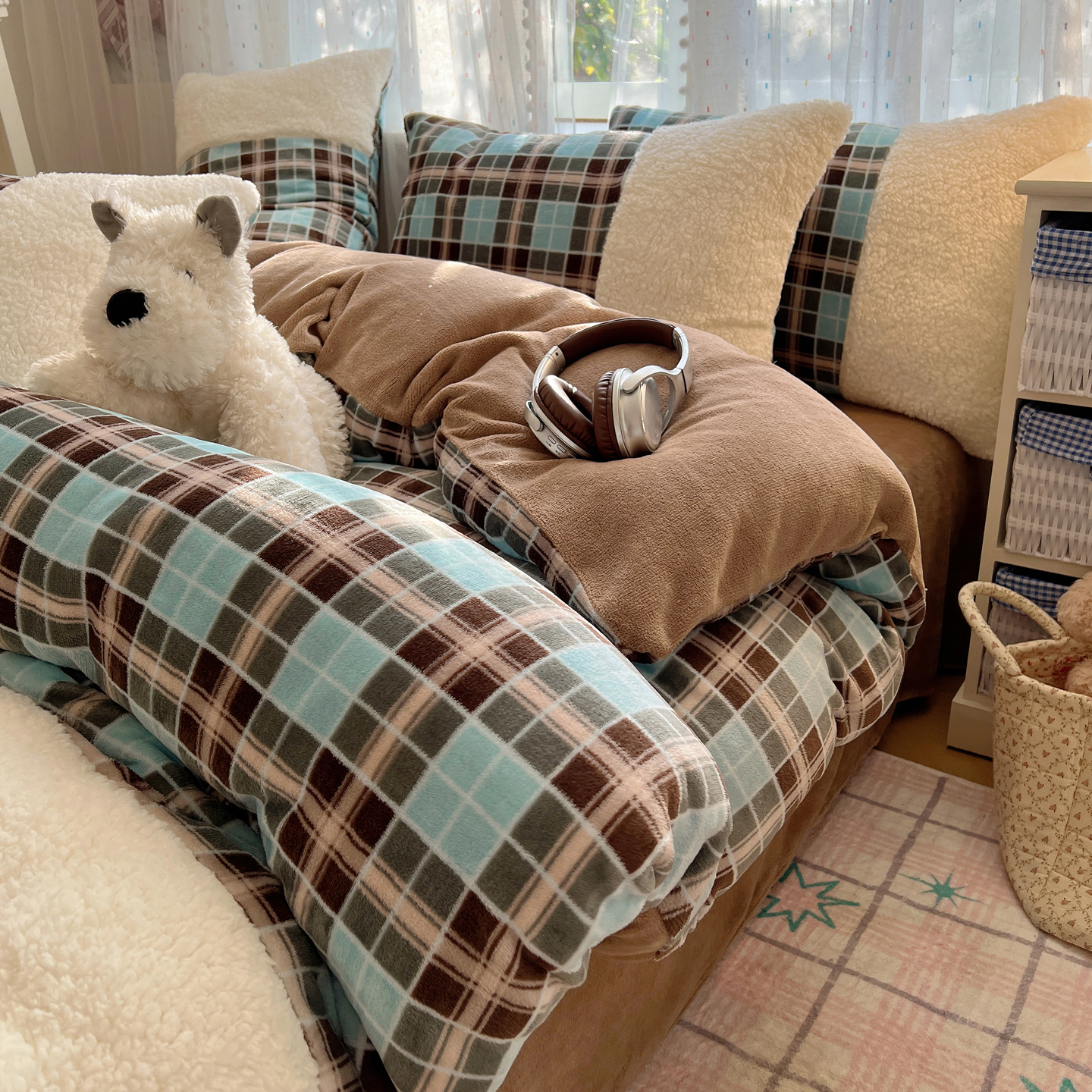 商品名称:顾里家纺 2025新款复古博主风高克重羊羔毛拼接牛奶绒套件 薄荷甜巧