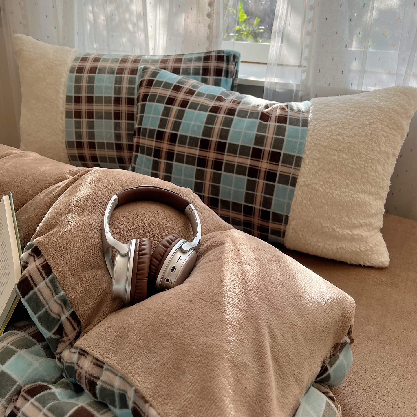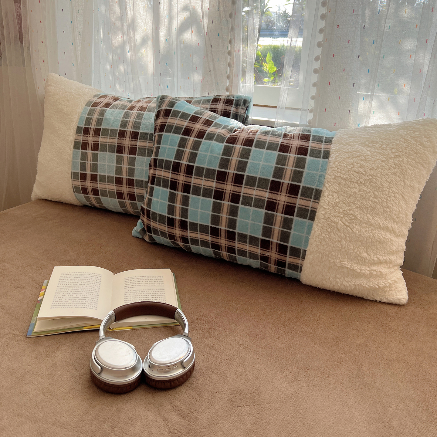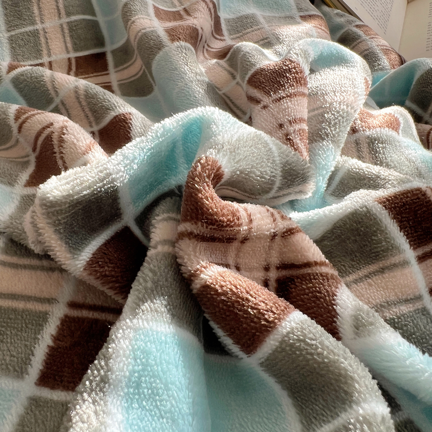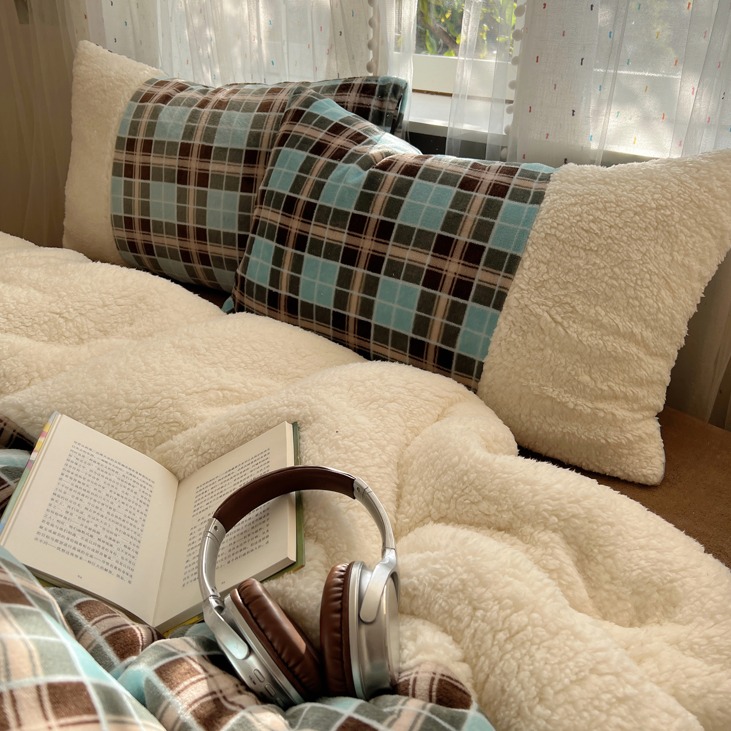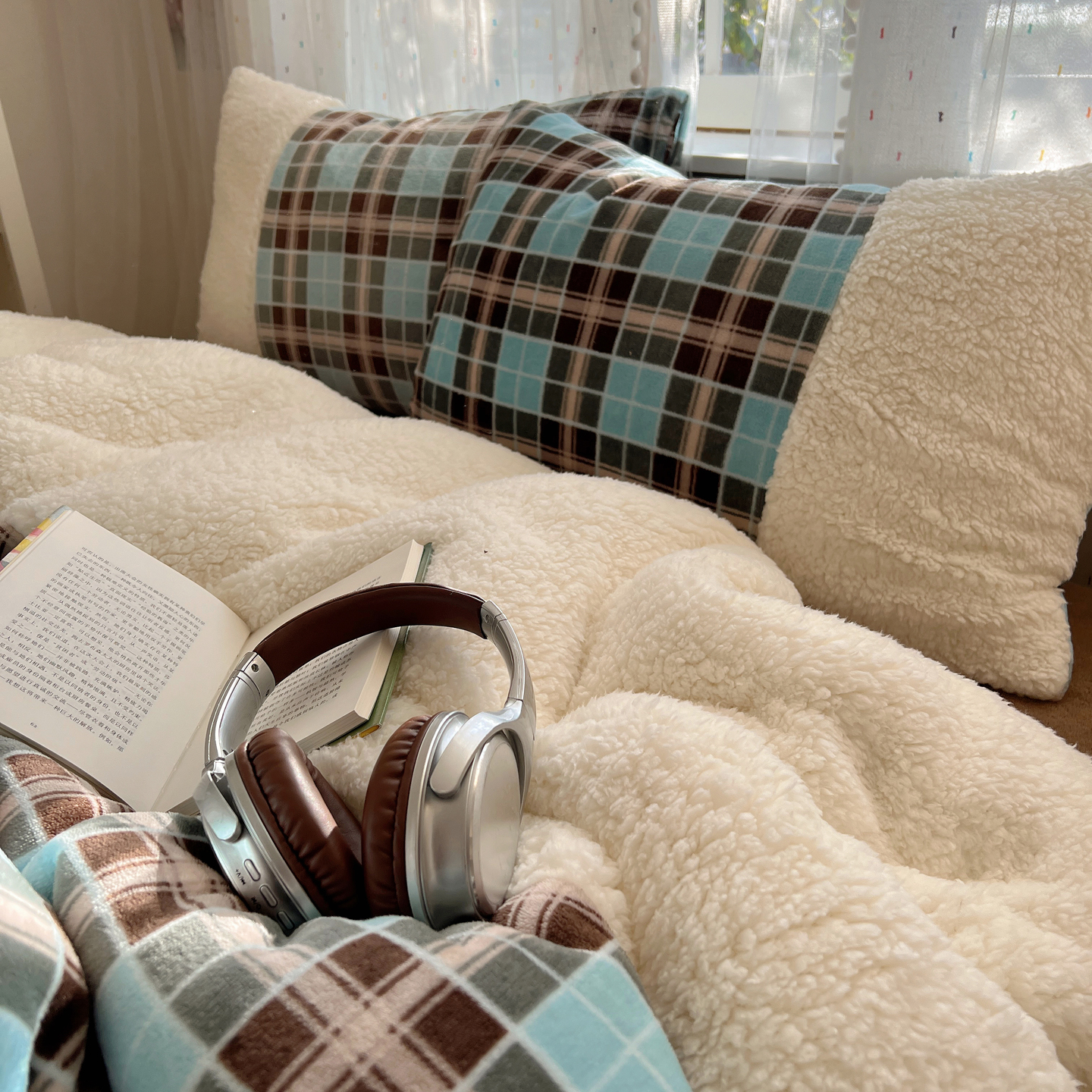 商品名称:顾里家纺 2025新款复古博主风高克重羊羔毛拼接牛奶绒套件 薄荷甜巧