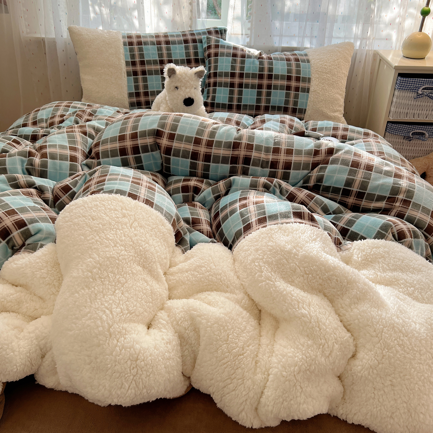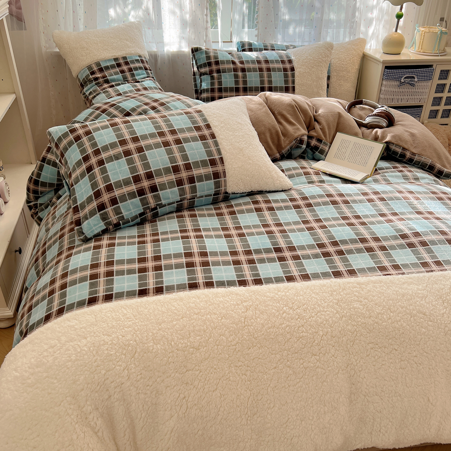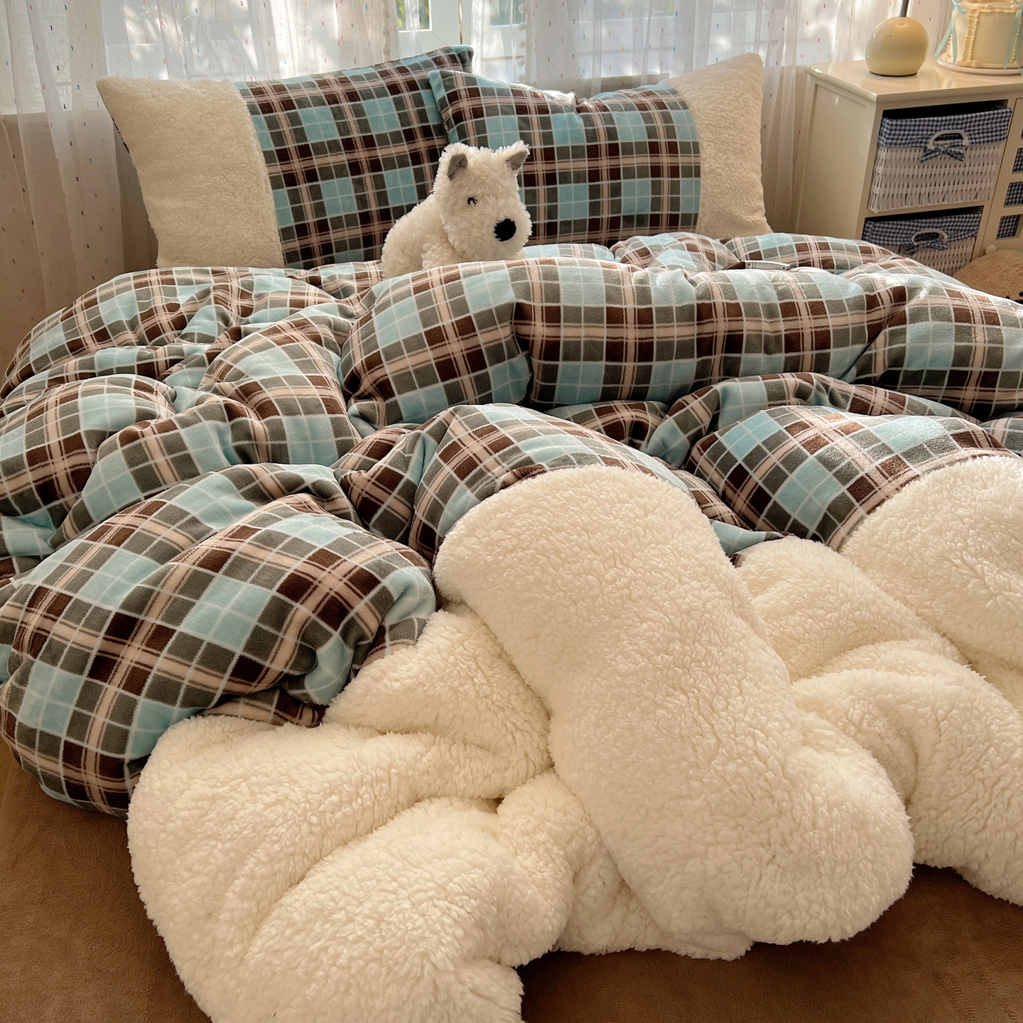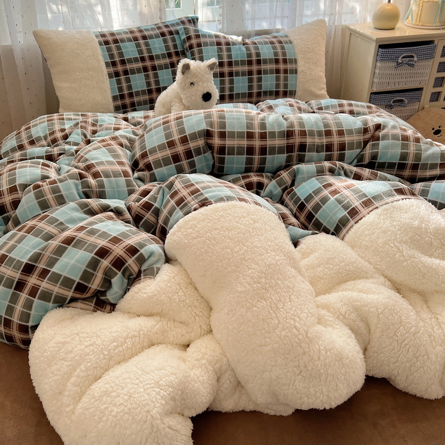 顾里家纺 2025新款复古博主风高克重羊羔毛拼接牛奶绒套件 薄荷甜巧