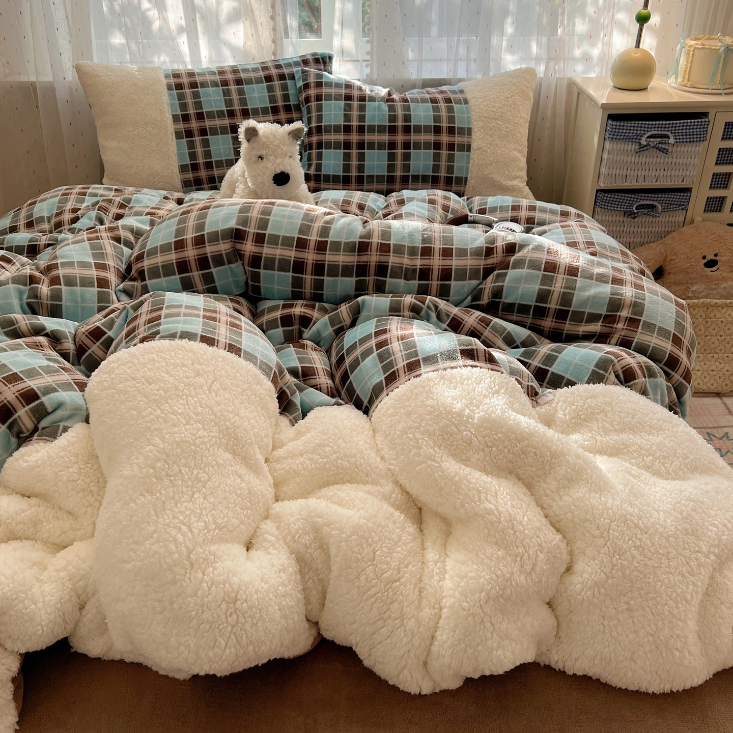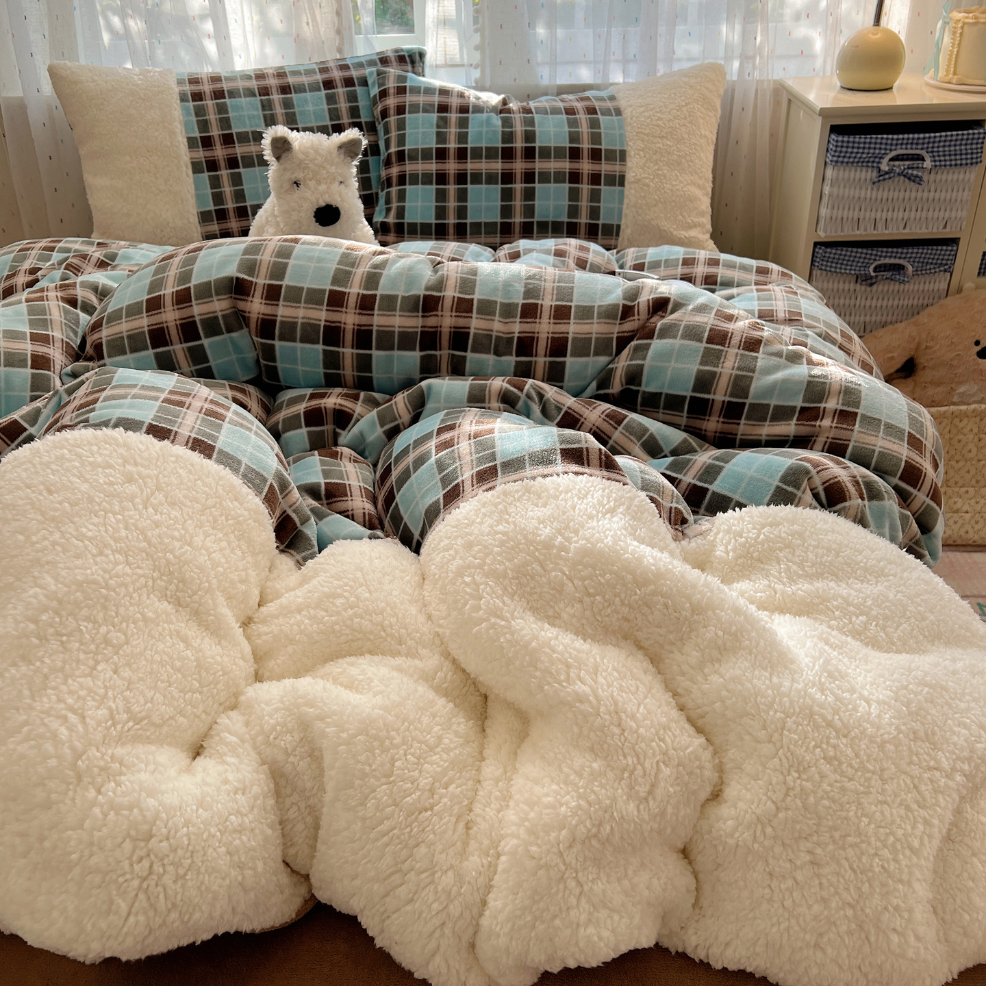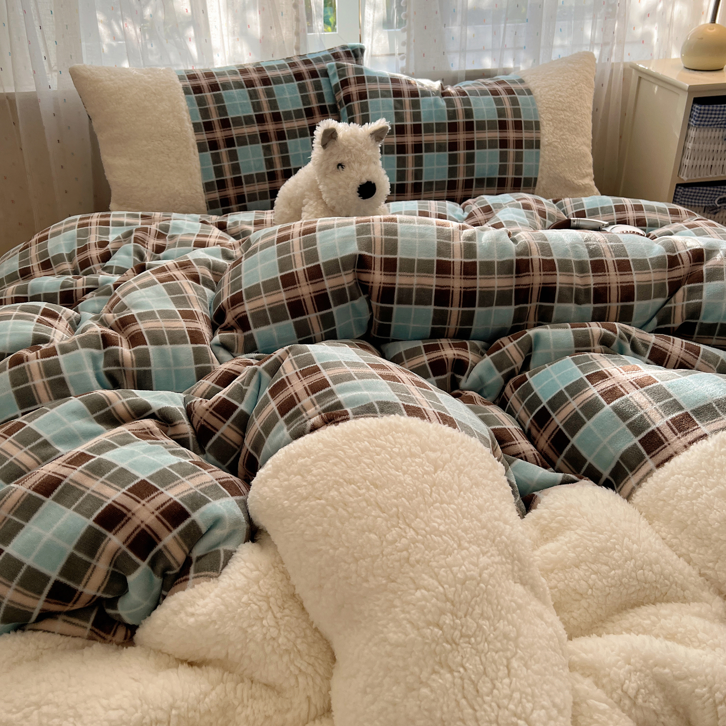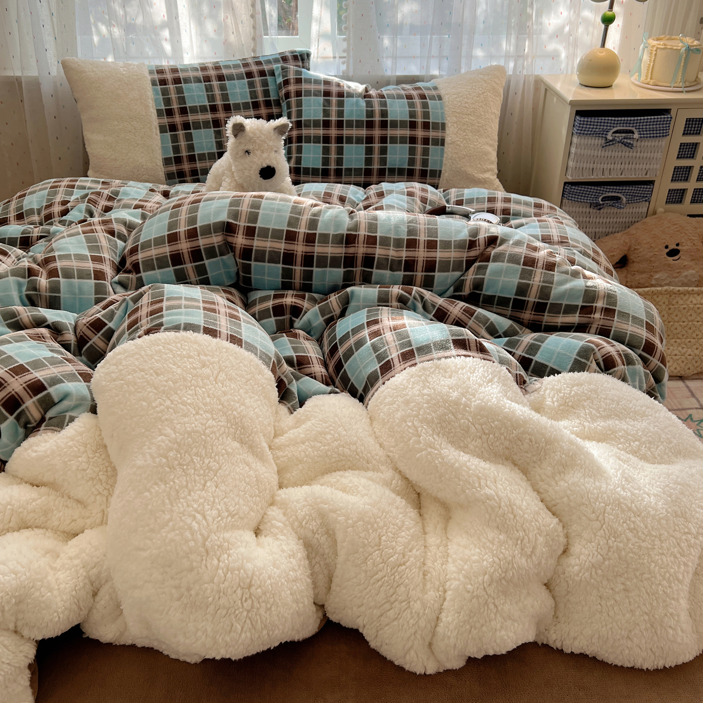 顾里家纺 2025新款复古博主风高克重羊羔毛拼接牛奶绒套件 薄荷甜巧