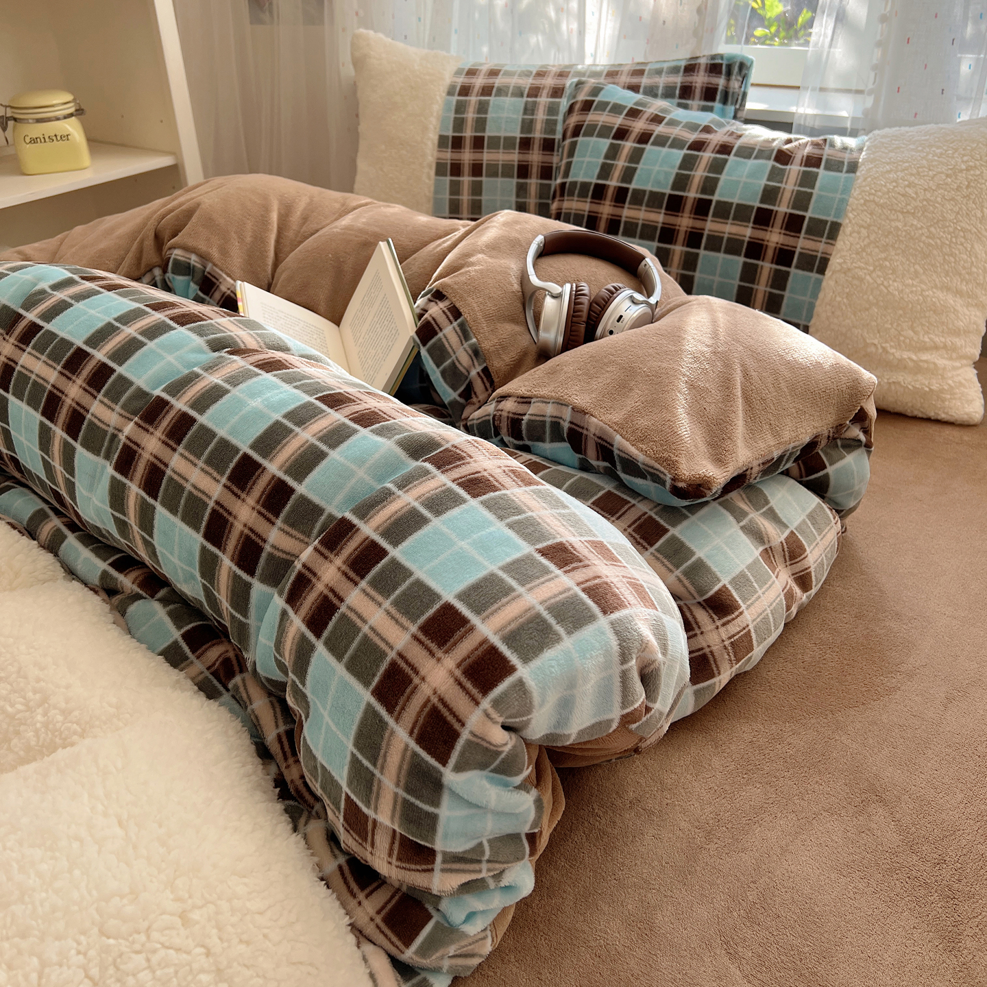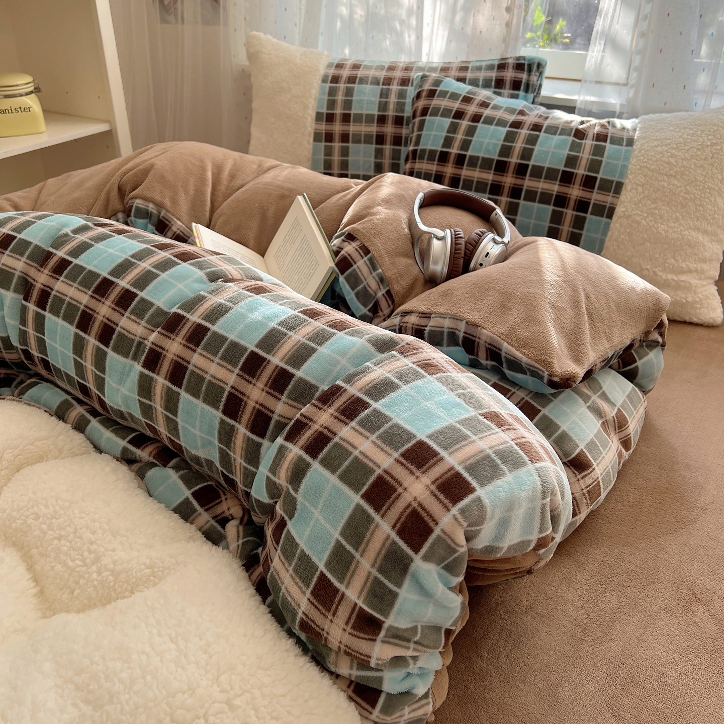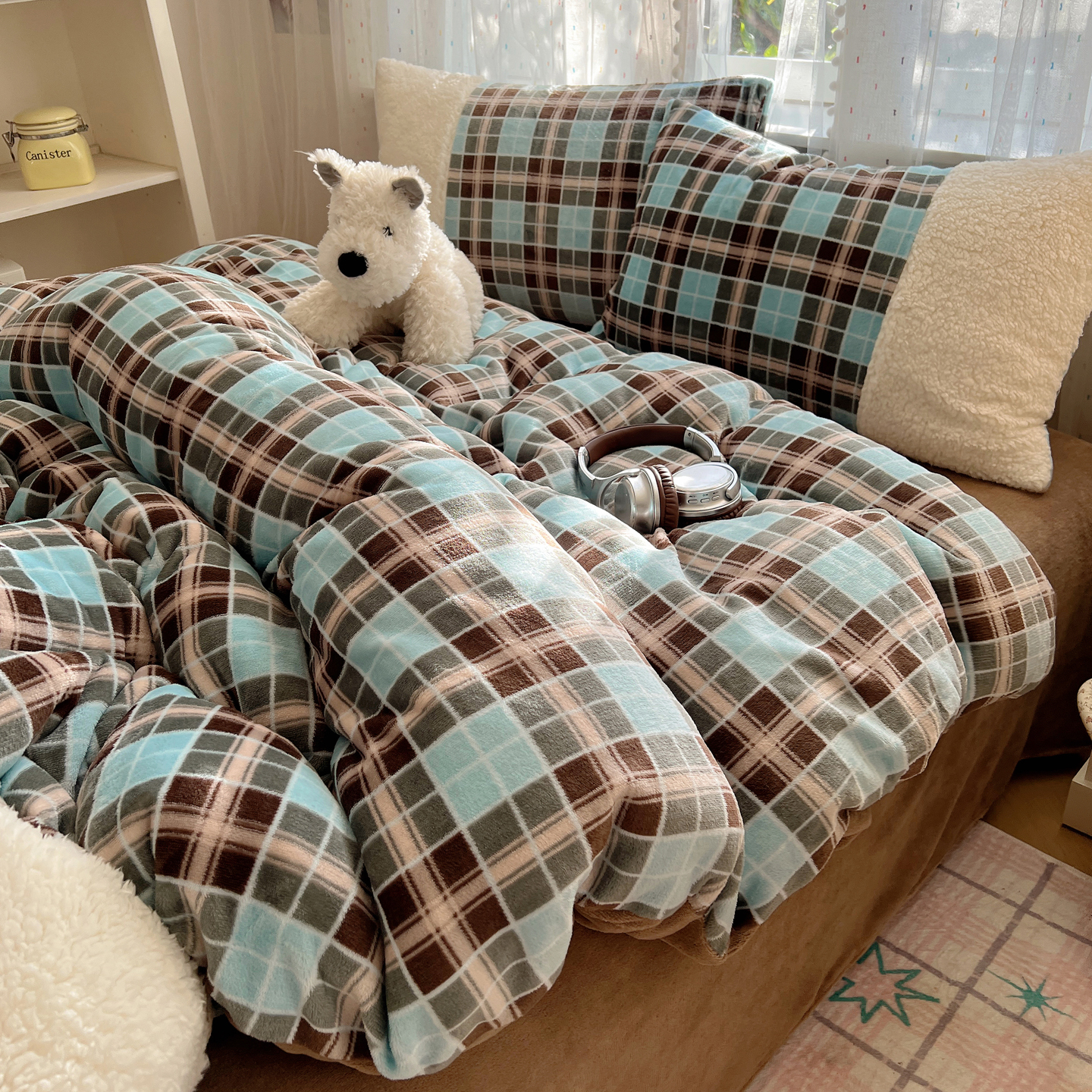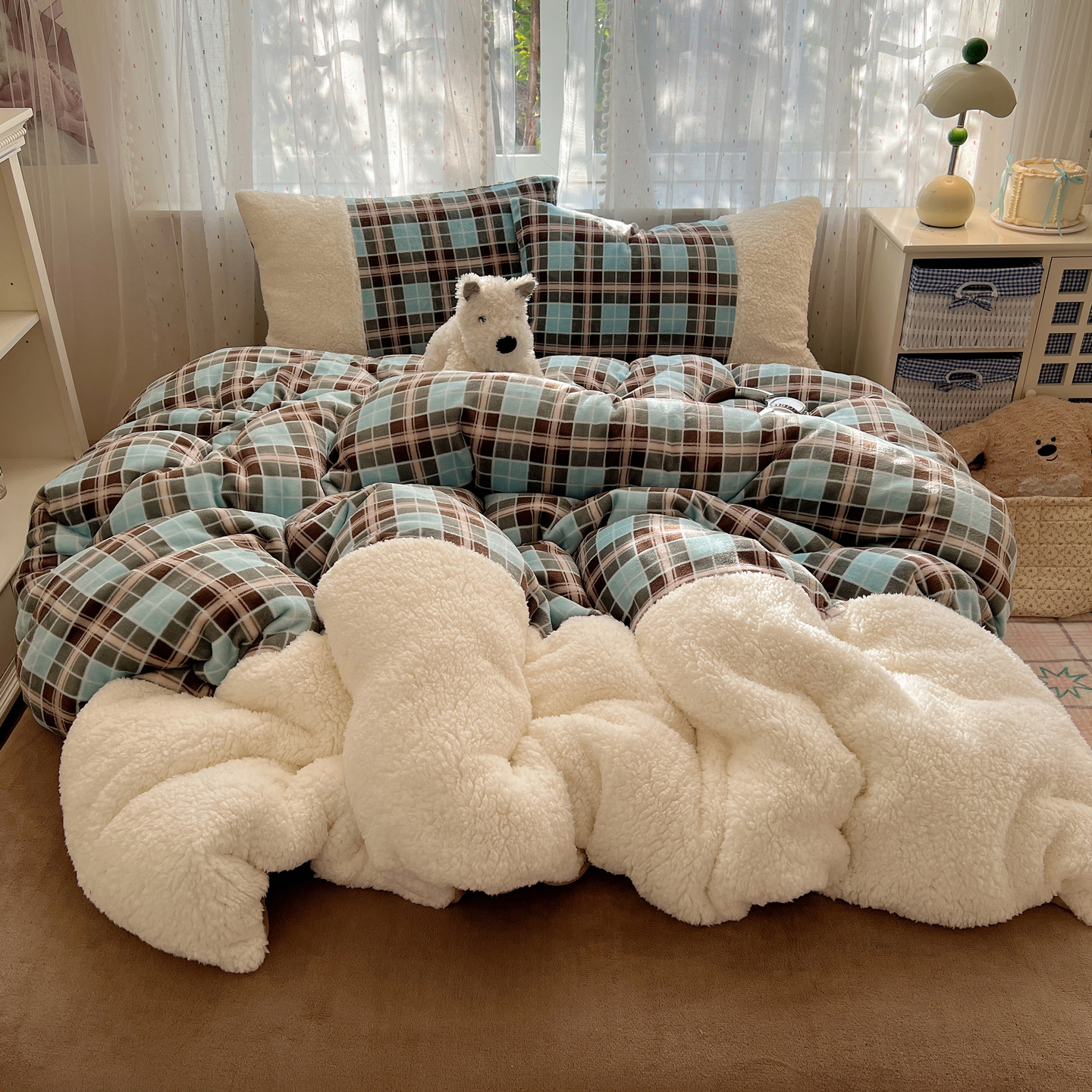 顾里家纺 2025新款复古博主风高克重羊羔毛拼接牛奶绒套件 薄荷甜巧