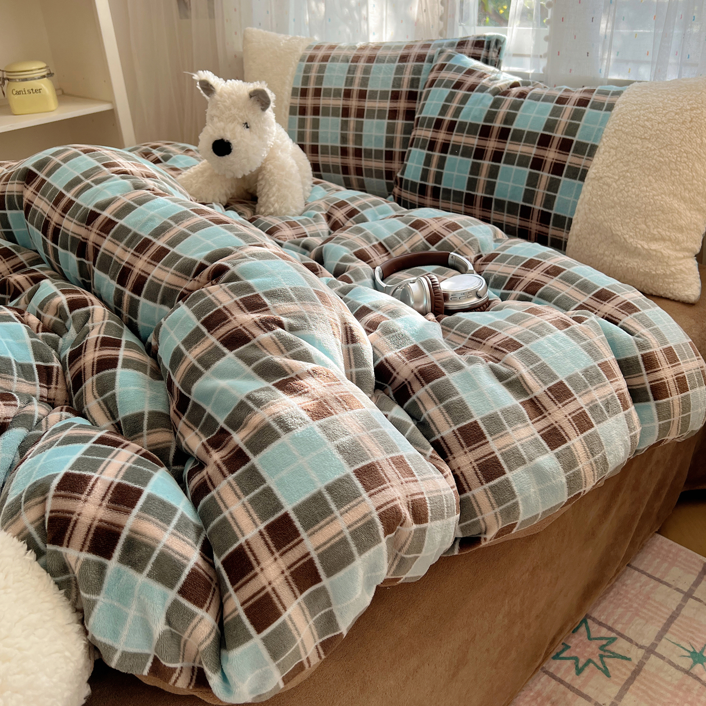 (总)顾里家纺 2024新款ins奶萌格子狗狗毛巾绣牛奶绒四件套,粉格小狗,黄格小狗,咖格小狗,蓝格小狗,绿格小狗