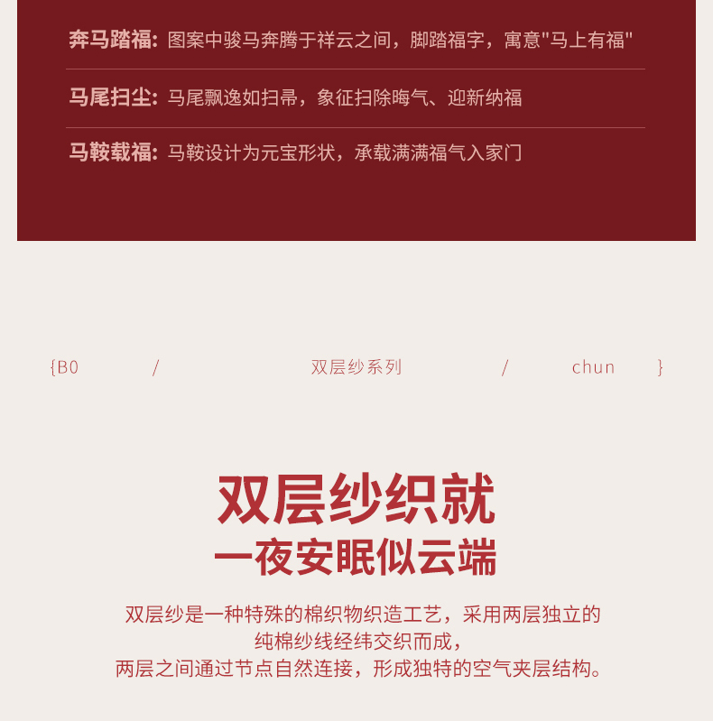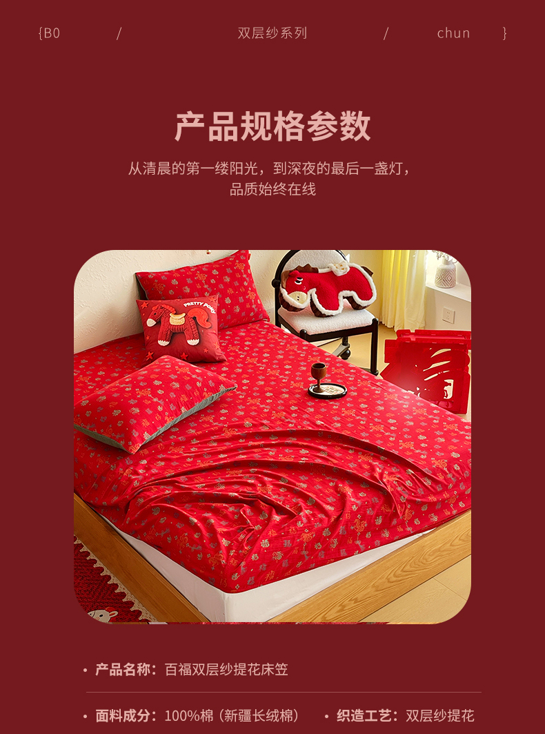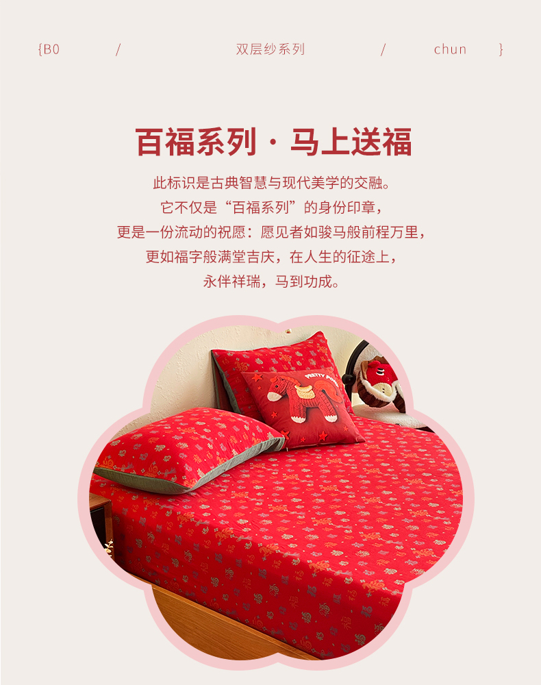 • 91家纺网 家纺一手货源 找家纺 春皖家纺 2026新款全棉色织双层纱提花百福系列拉链款-单床笠 红福马