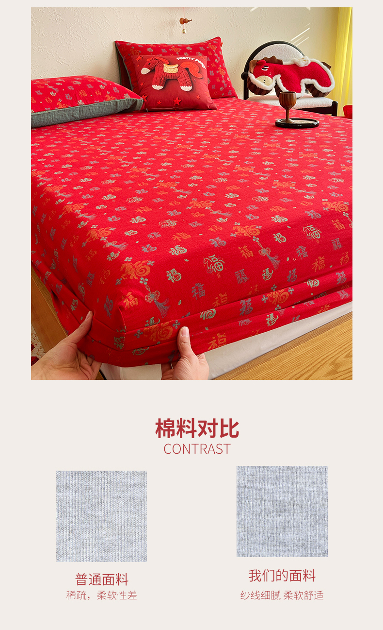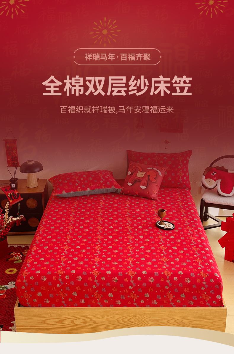 春皖家纺 2026新款全棉色织双层纱提花百福系列拉链款-单床笠 红福马