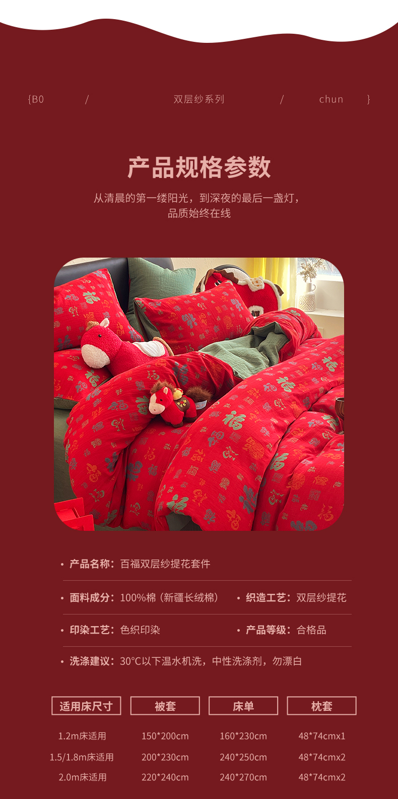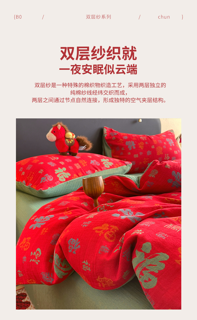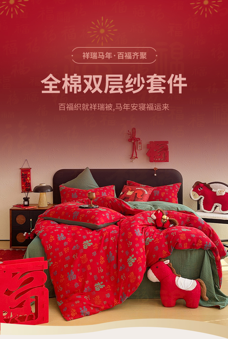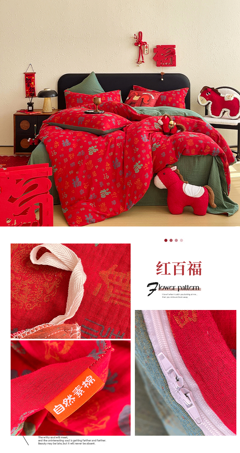 当前位置: 91家纺网 > 商品网购 > 床品套件 > 四件套 > 双层纱四件套 > 春皖家纺 2026新款全棉色织双层纱提花百福系列拉链款-四件套 红百福