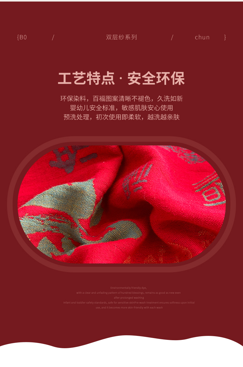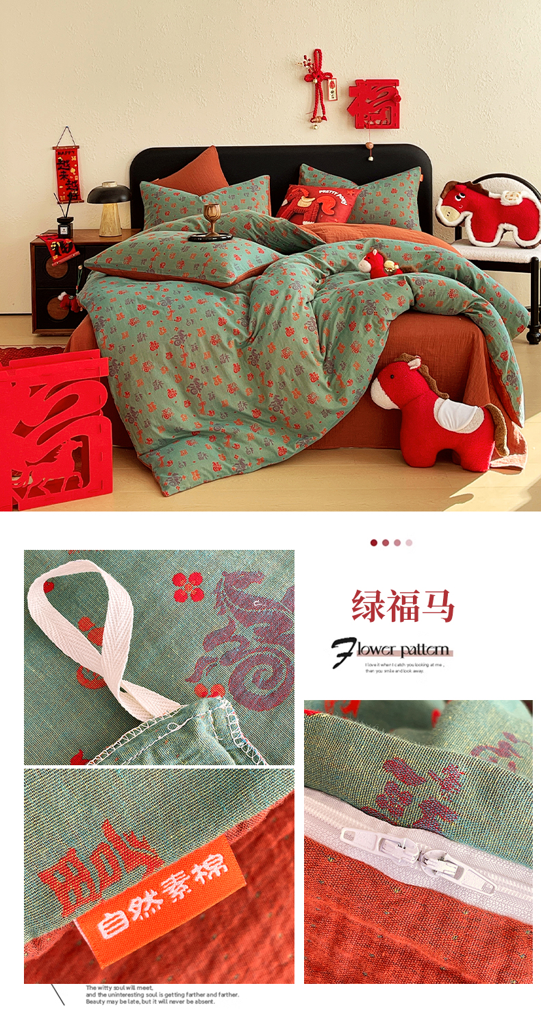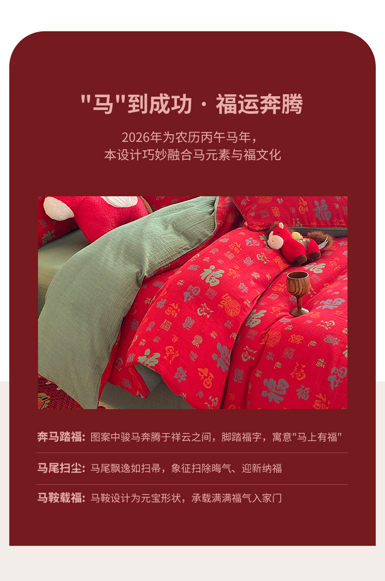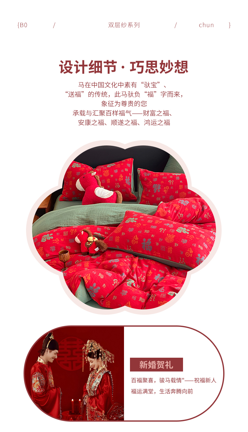当前位置: 91家纺网 > 商品网购 > 床品套件 > 四件套 > 双层纱四件套 > 春皖家纺 2026新款全棉色织双层纱提花百福系列拉链款-四件套 红百福