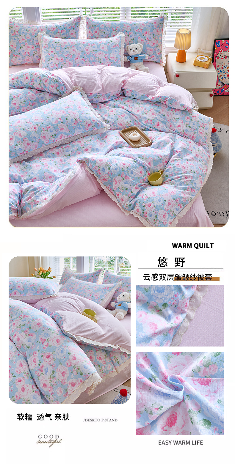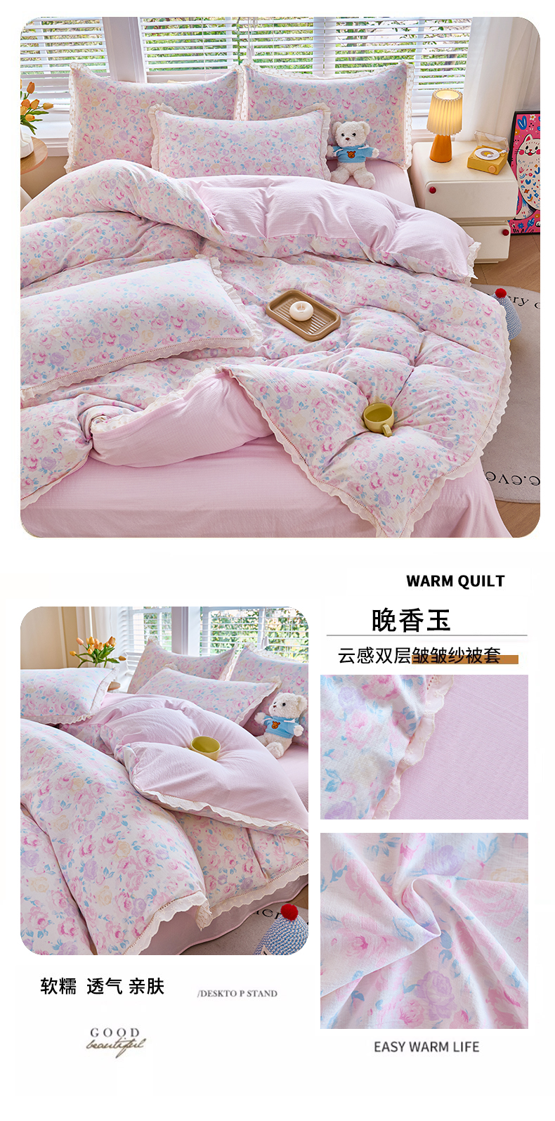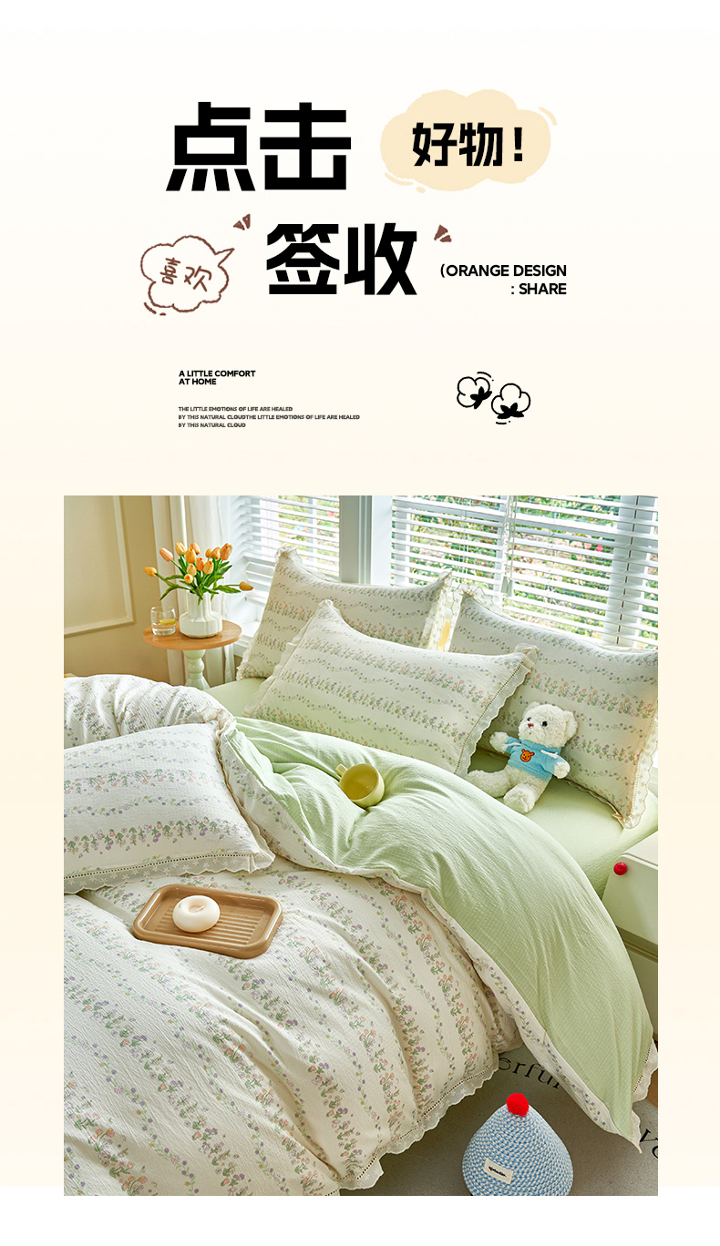 当前位置: 91家纺网 > 商品网购 > 床品套件 > 四件套 > 其它四件套 > 钰锦珀家纺 2026春夏新款云感皱皱纱镂空花边三件套四件套 春晓