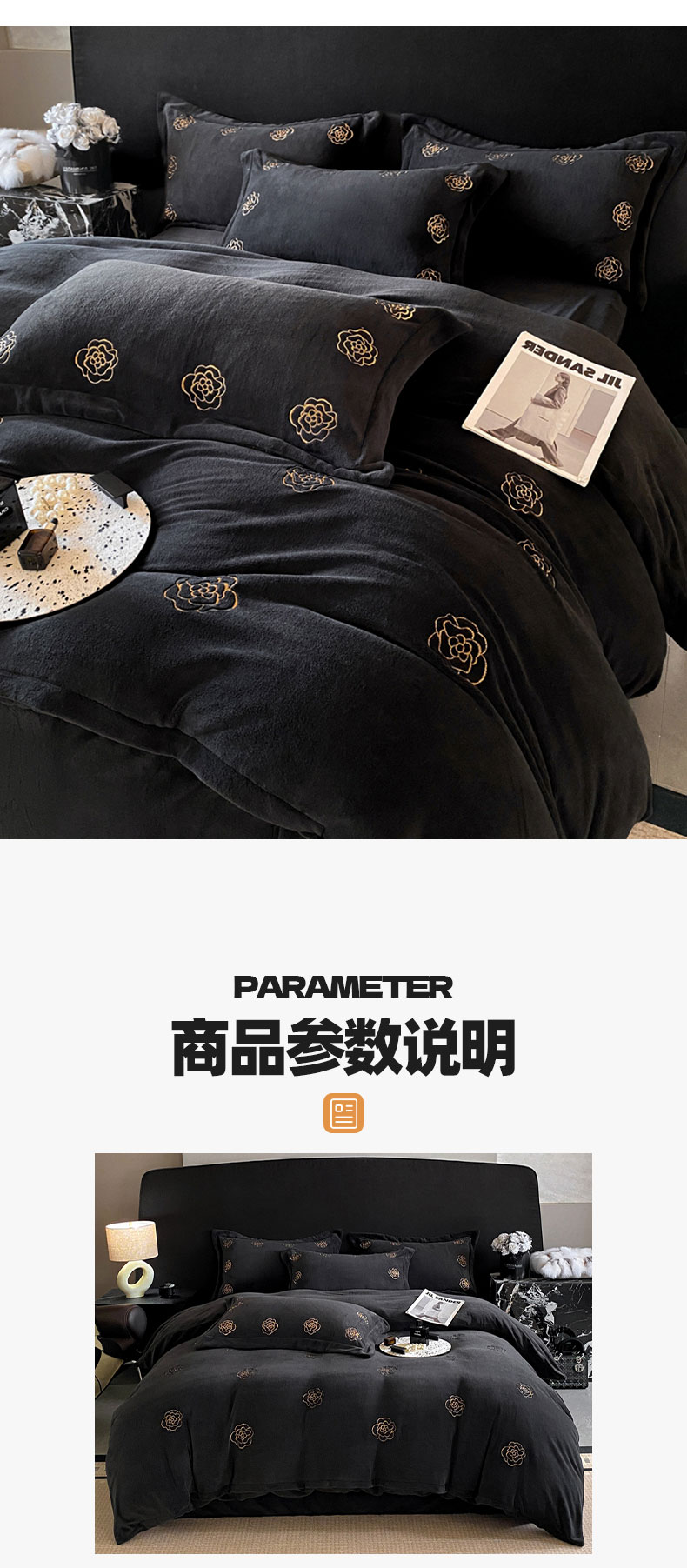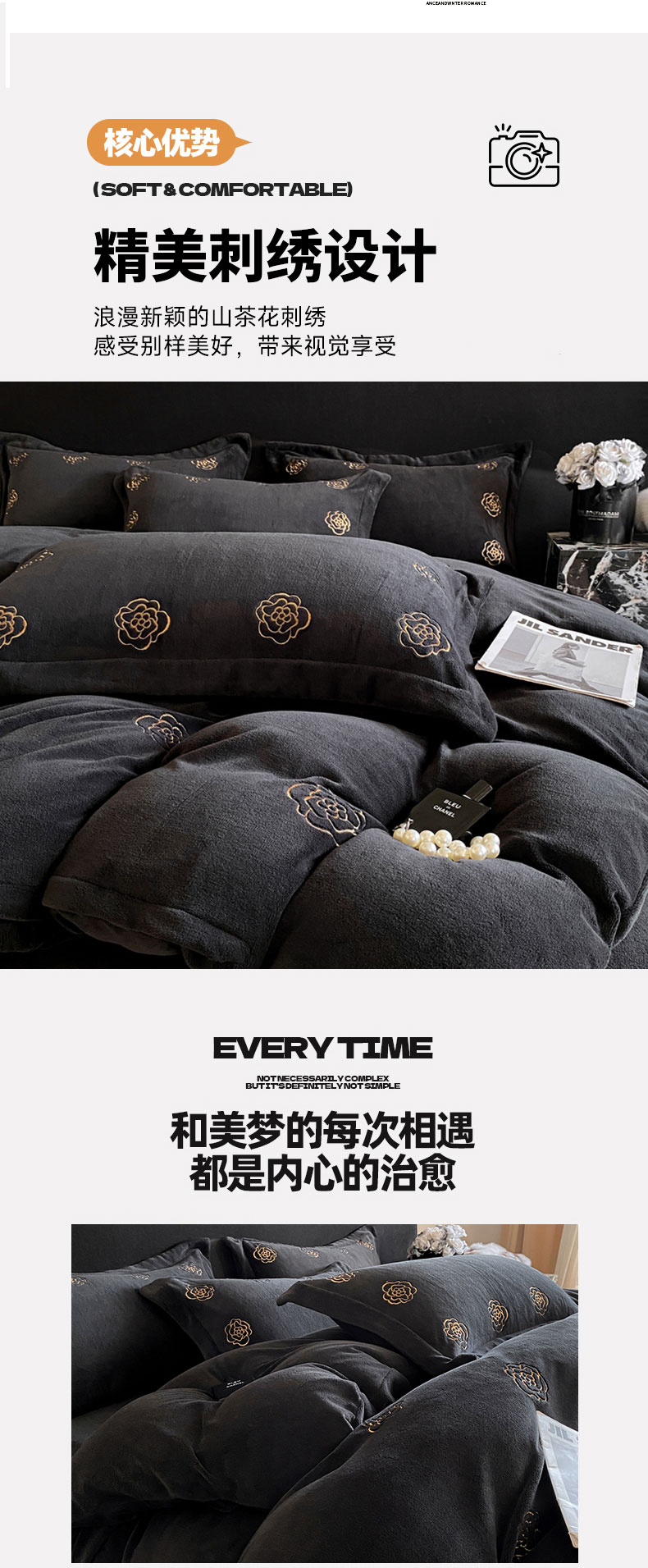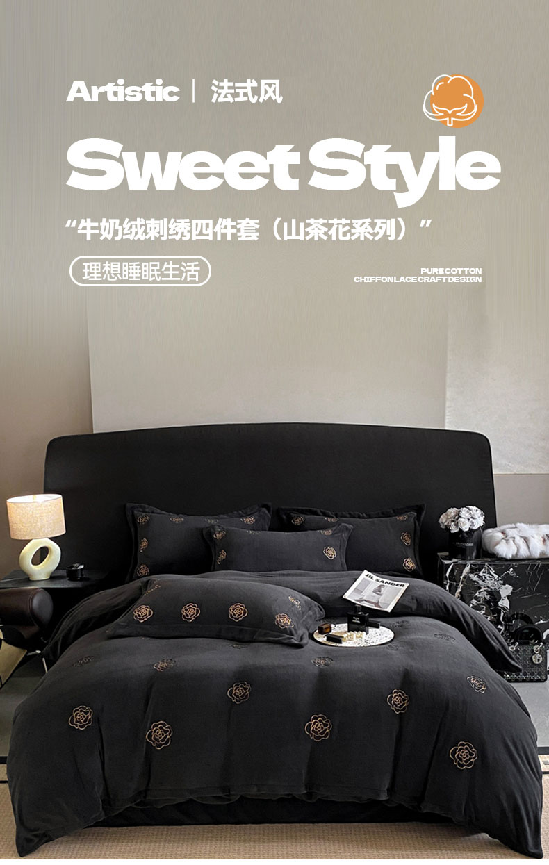 当前位置: 91家纺网 > 商品网购 > 床品套件 > 四件套 > 牛奶绒四件套 > 你好美丽 2025新款A类200克牛奶绒山茶花刺绣四件套 山茶花黑