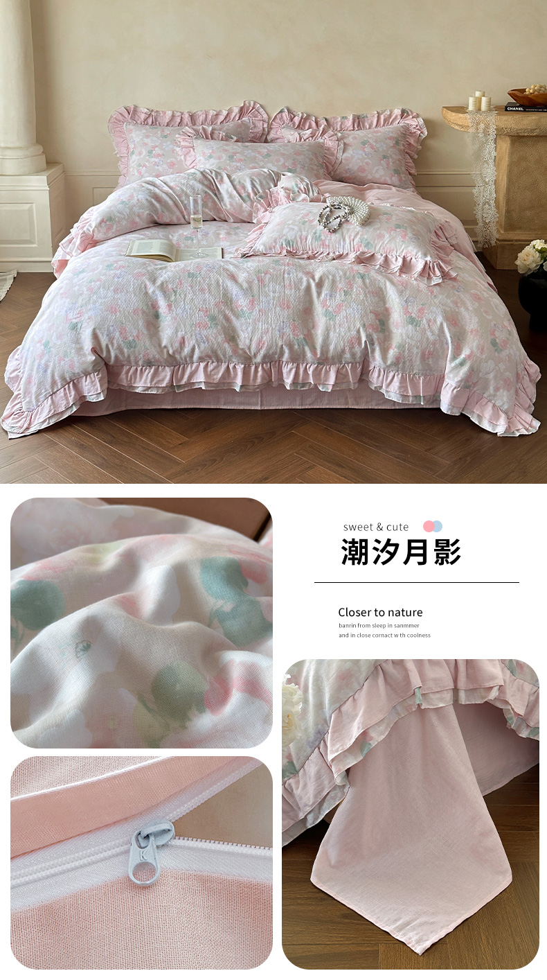 商品名称:乐美家纺 2025新款全棉纯棉法式双层纱花边四件套 潮汐月影
