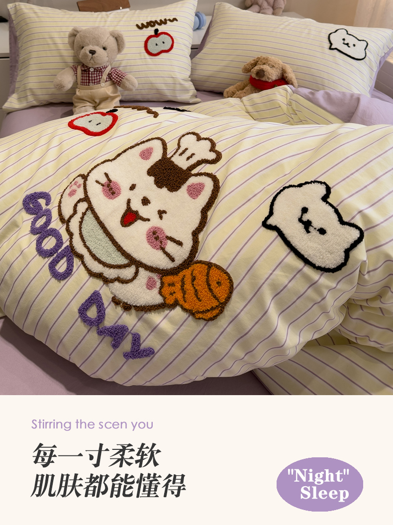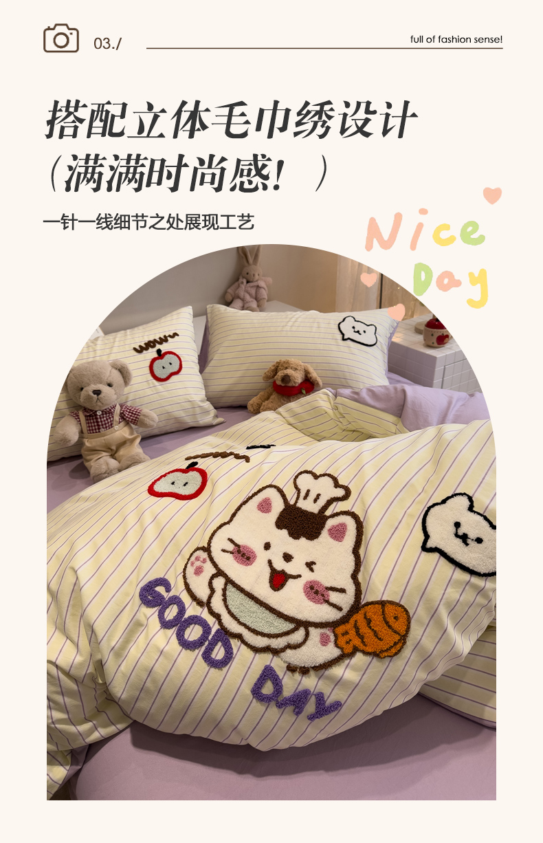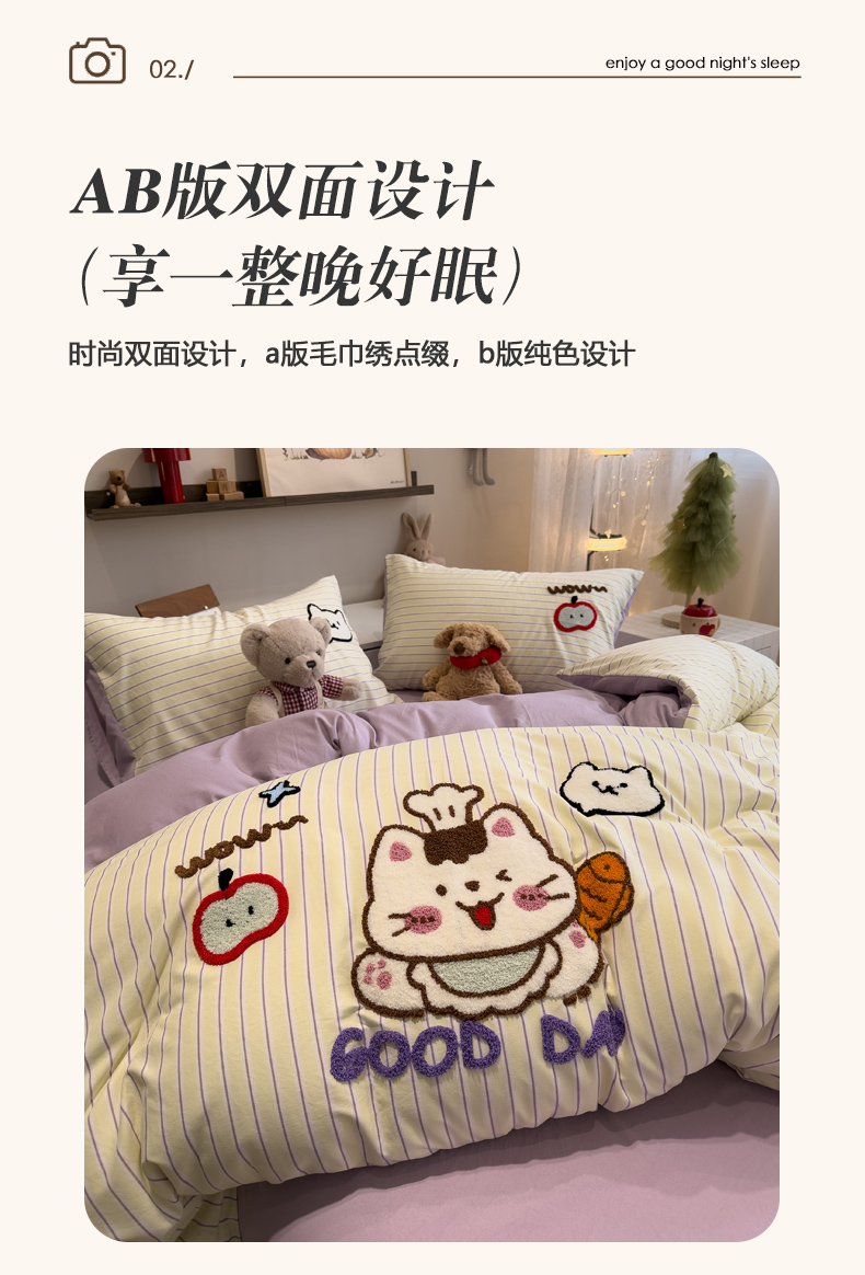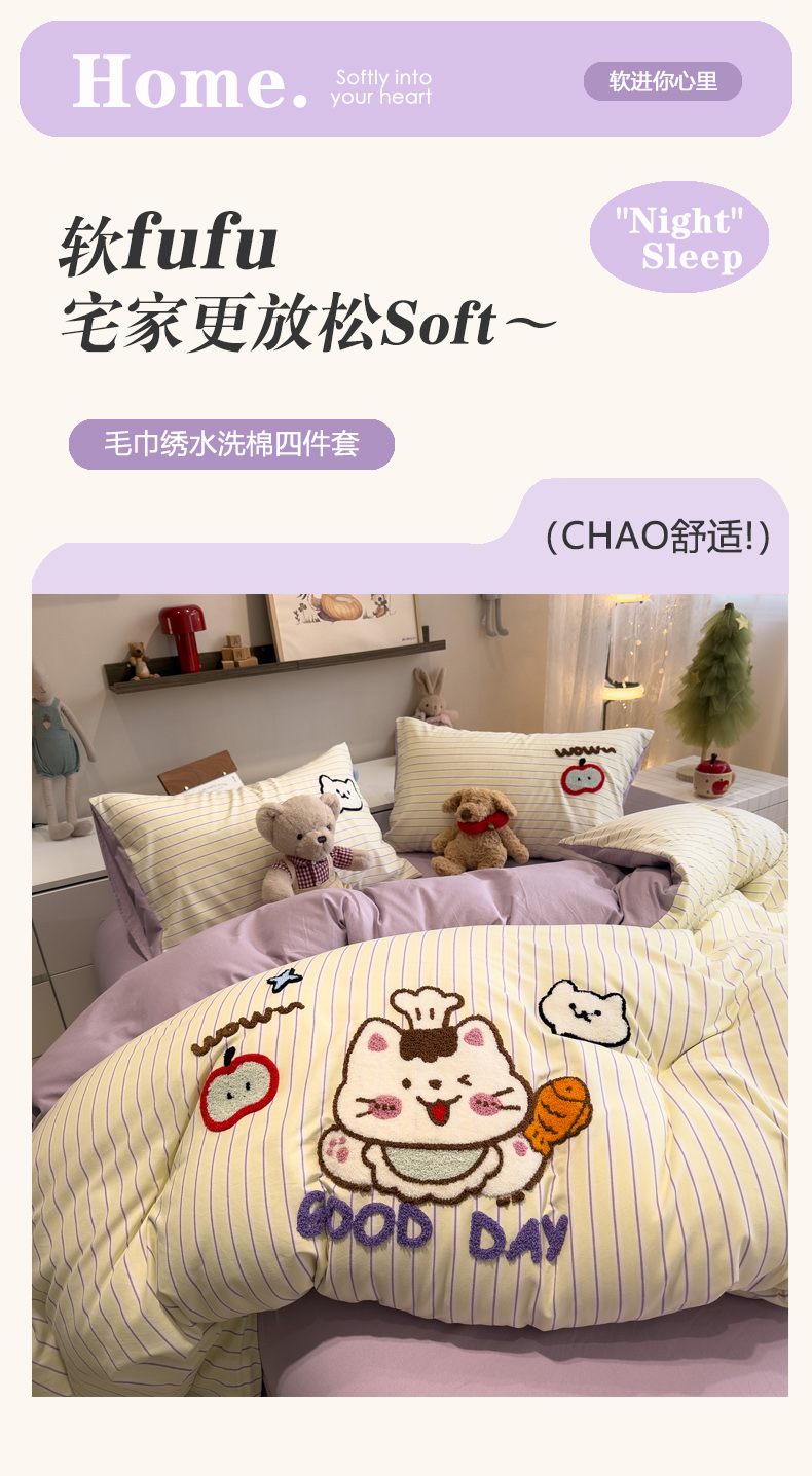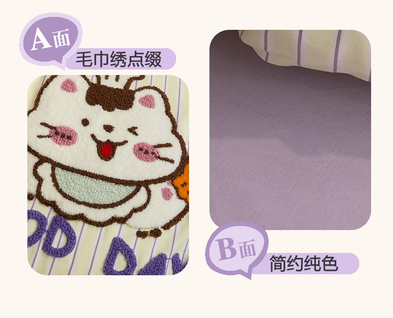 当前位置: 91家纺网 > 商品网购 > 床品套件 > 四件套 > 毛巾绣四件套 > 曼谷家纺 2026新款卡通水洗棉毛巾绣四件套被套 小鱼喵喵酱-紫条