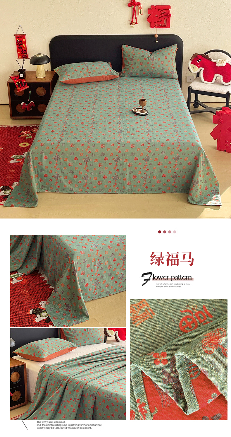 (总)春皖家纺 2026新款全棉色织双层纱提花百福系列拉链款-四件套,红百福,红赤兔,红福马,绿赤兔,绿福马,红绝影,绿绝影