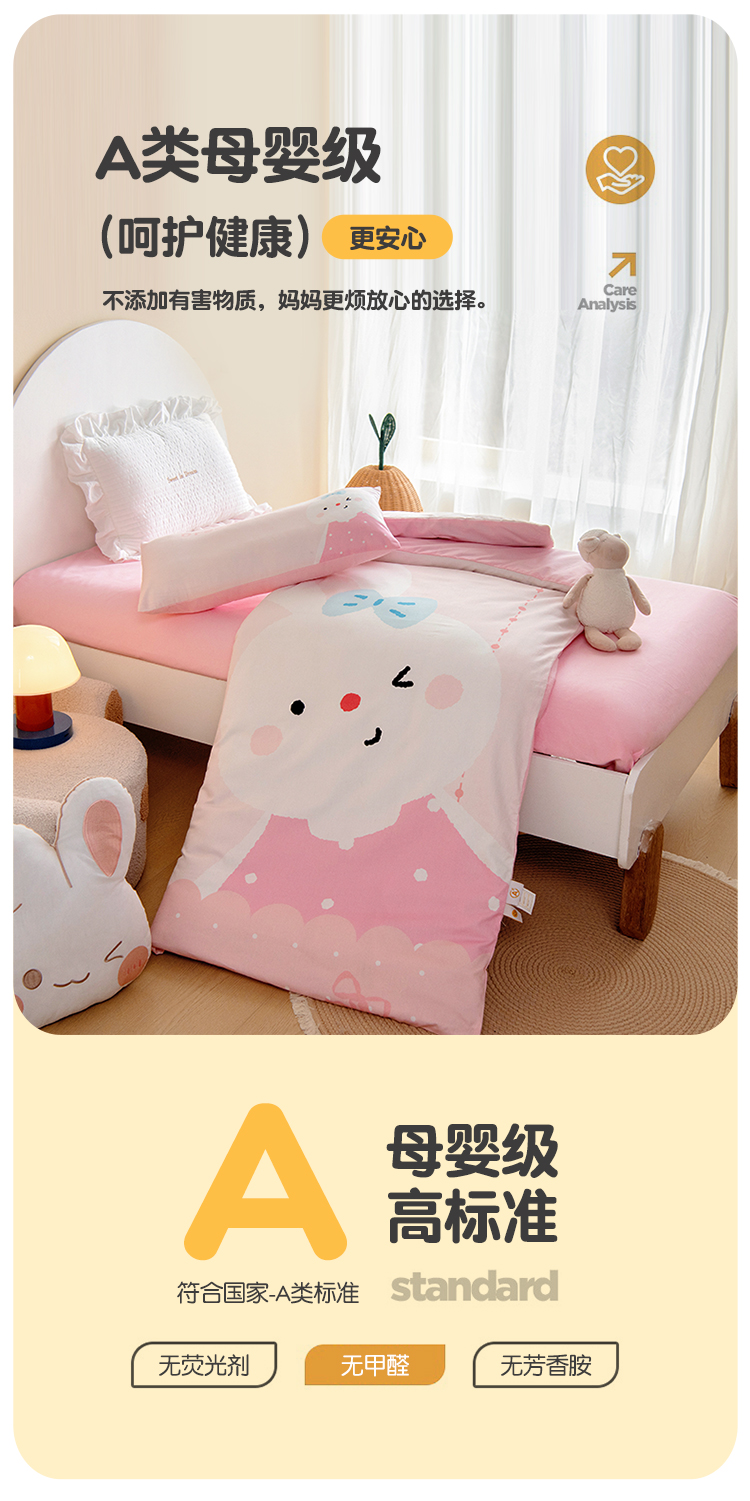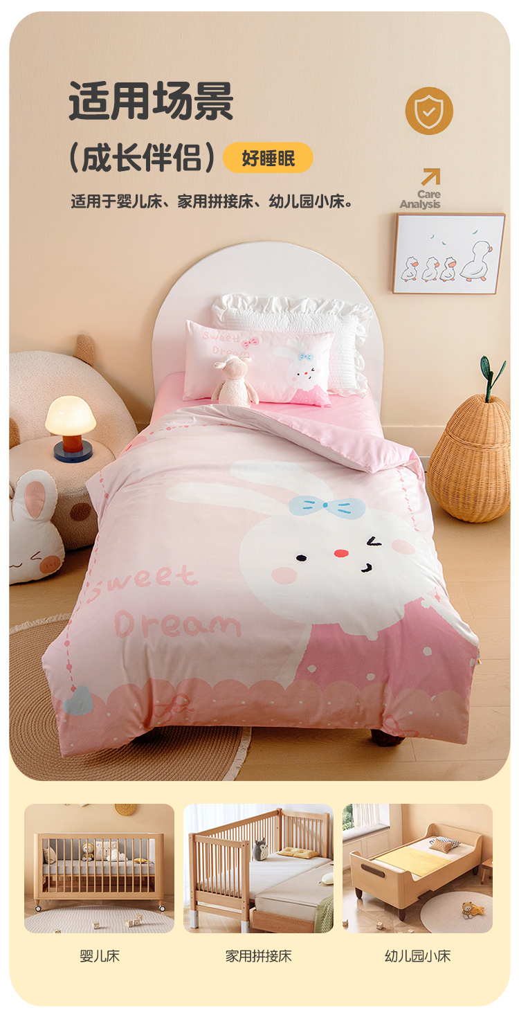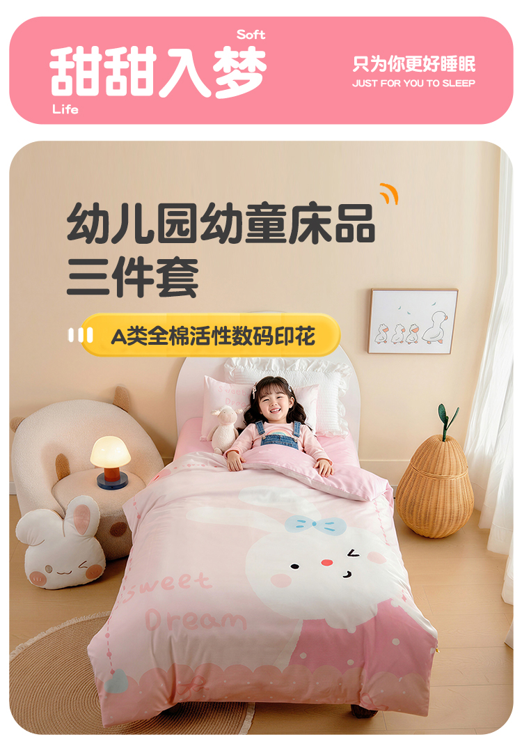 绒梦里 2026新款A类全棉卡通大版数码印花幼儿园被子三件套儿童套件被套,快乐芝士,波点企鹅,嘟嘟小车,粉萌小兔,奶茶兔兔,平安小马,俏皮恐龙,幸运树,幸运小熊,熊猫宝贝,紫色小兔,足球宝贝