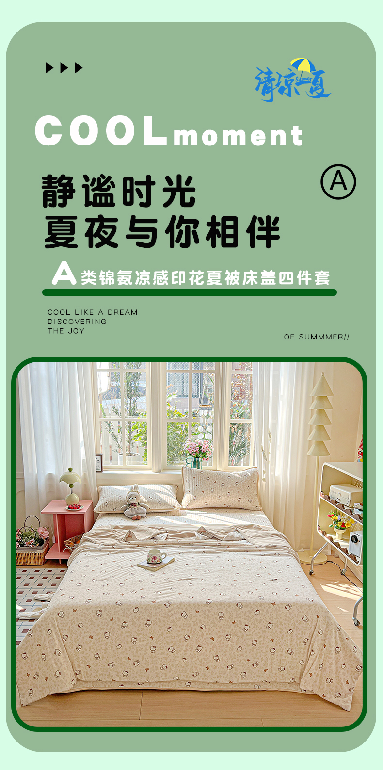当前位置: 91家纺网 > 商品网购 > 床品套件 > 四件套 > 夏被四件套 > 卡普家居 2026新款A类锦氨凉感印花夏被床盖床单款四件套 奶盖Kitty