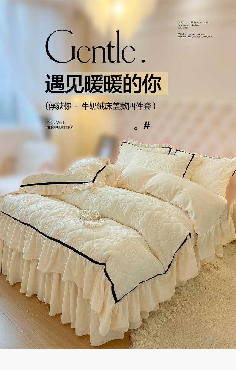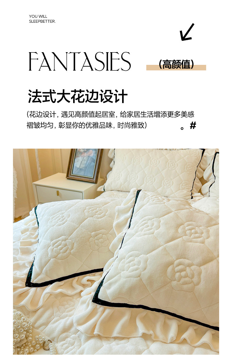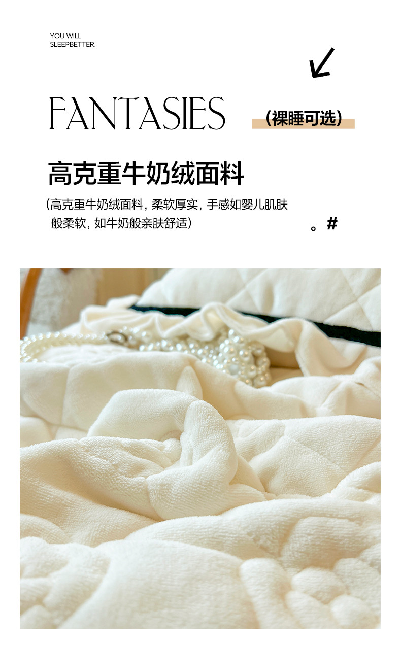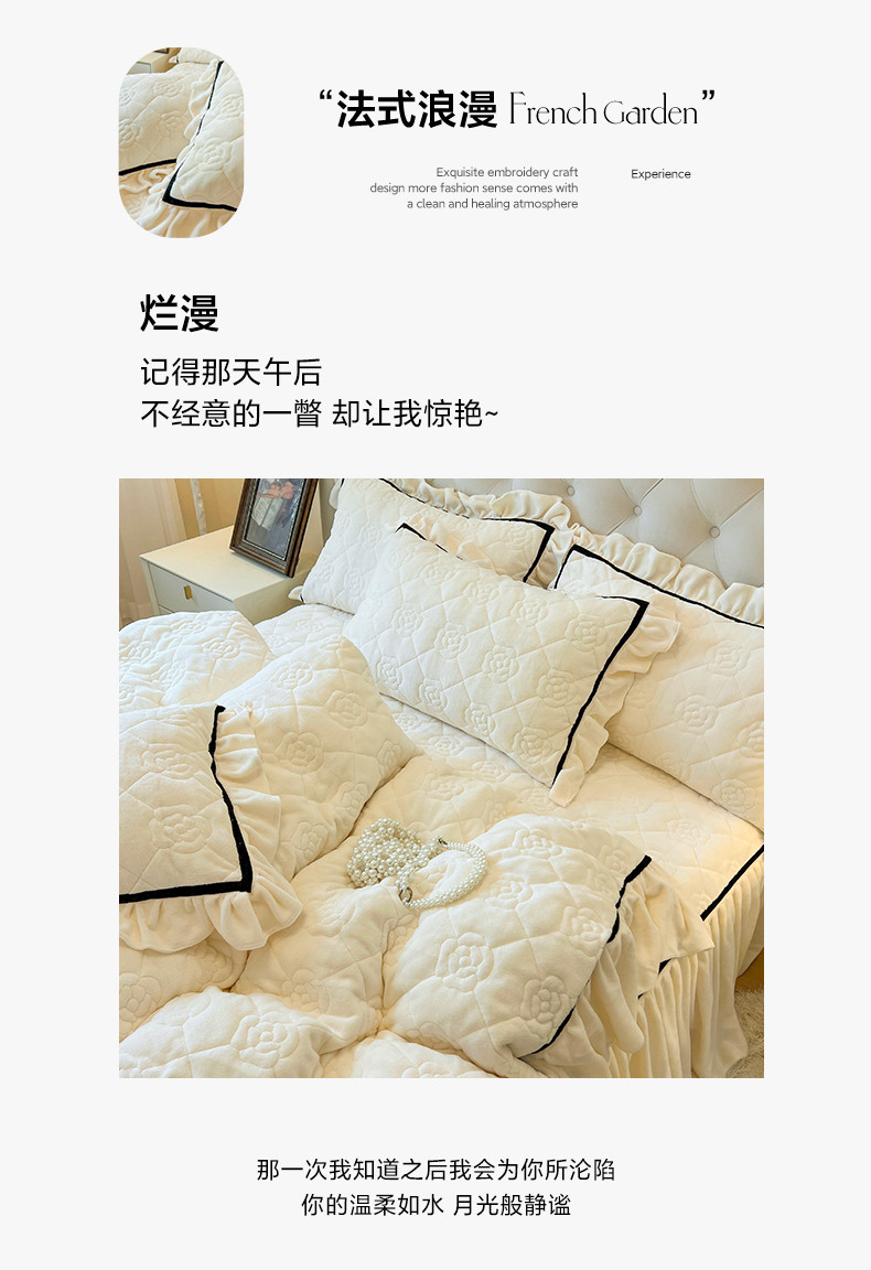 当前位置: 91家纺网 > 商品网购 > 床品套件 > 四件套 > 牛奶绒四件套 > 麒豆豆 新款高克重加厚保暖牛奶绒法式大花边四件套-眷恋 眷恋-元气白