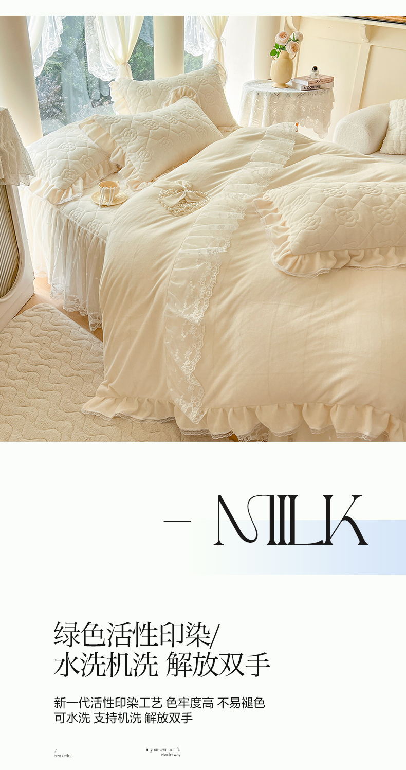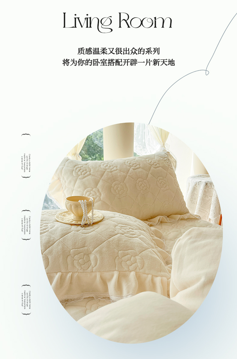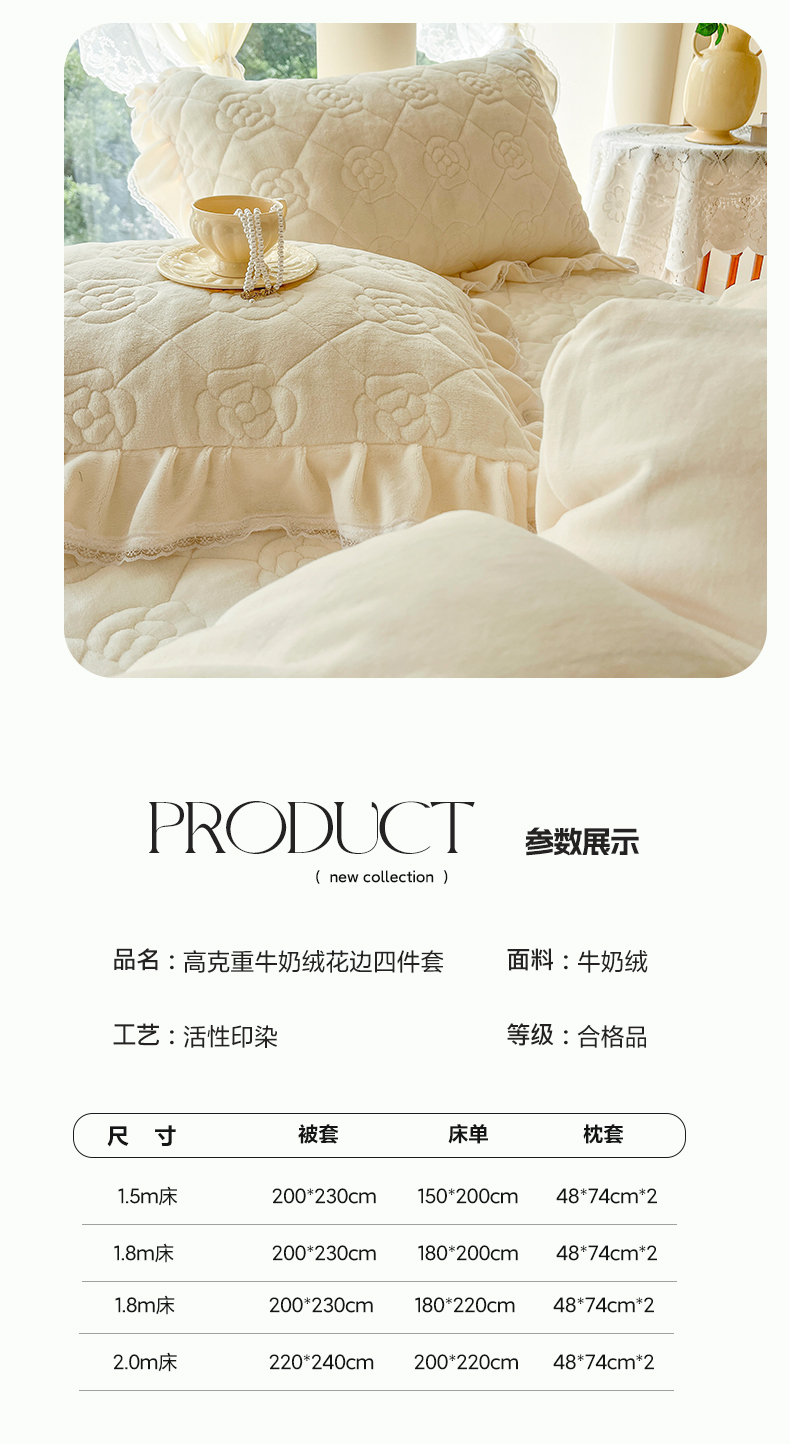 当前位置: 91家纺网 > 商品网购 > 床品套件 > 四件套 > 牛奶绒四件套 > 麒豆豆 2023新款高克重牛奶绒花边床裙四件套-山茶系列 山茶-米