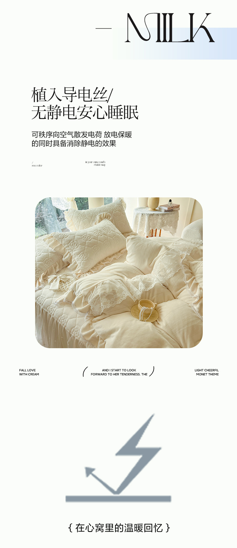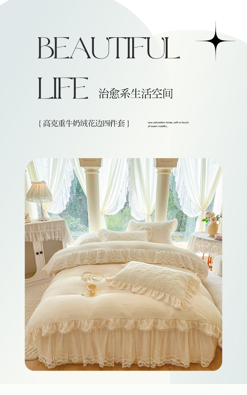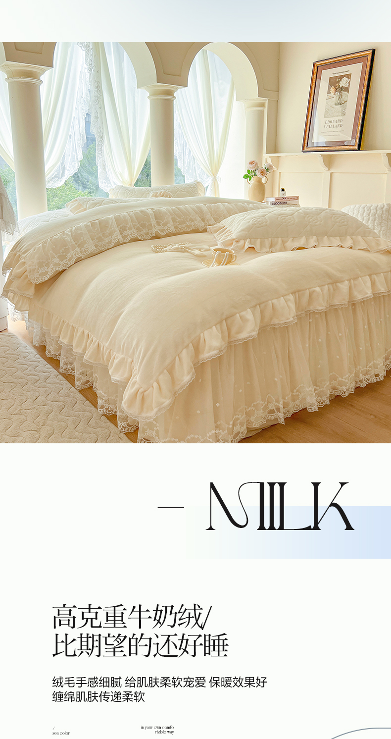 当前位置: 91家纺网 > 商品网购 > 床品套件 > 四件套 > 牛奶绒四件套 > 麒豆豆 2023新款高克重牛奶绒花边床裙四件套-山茶系列 山茶-米