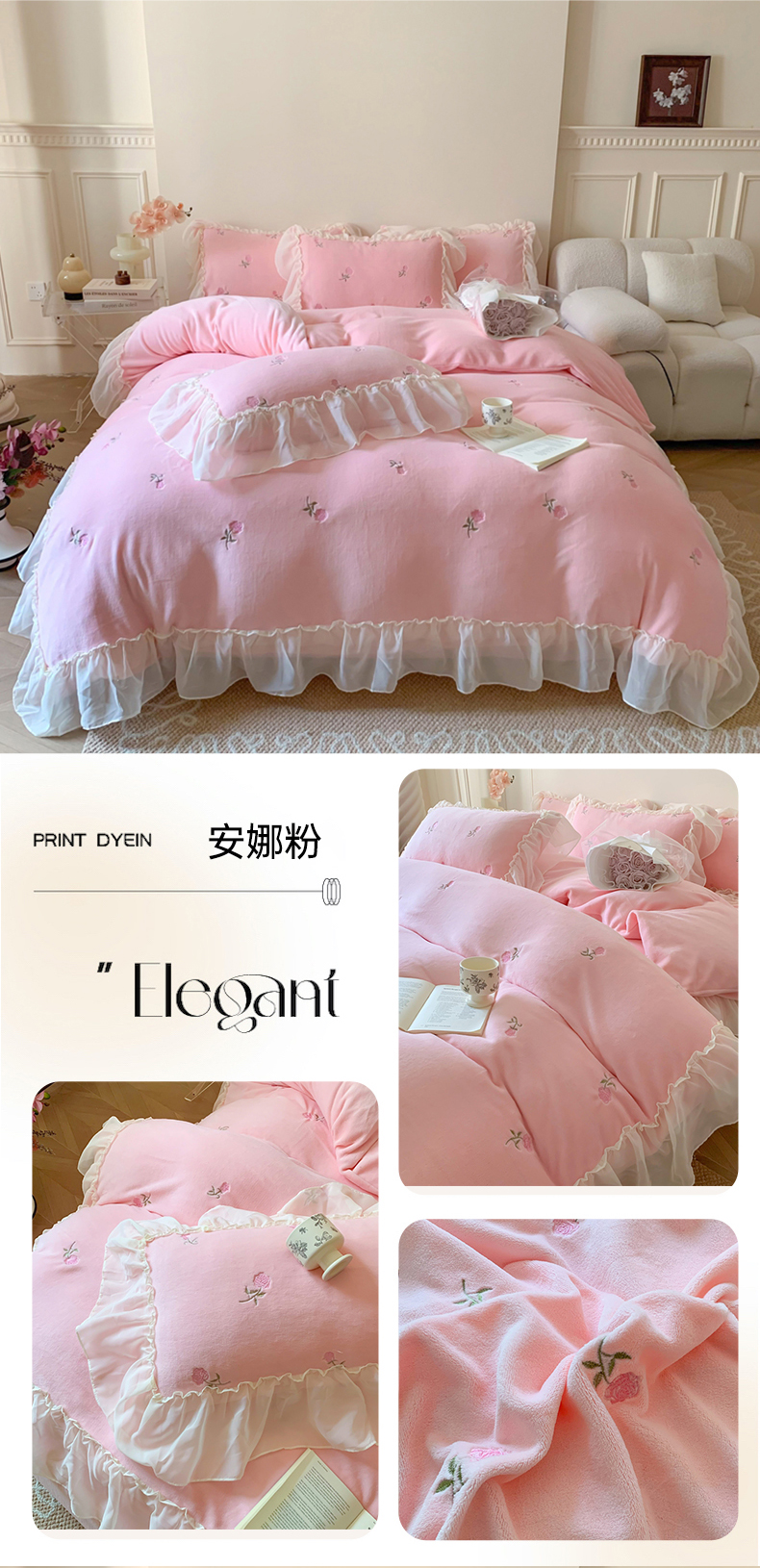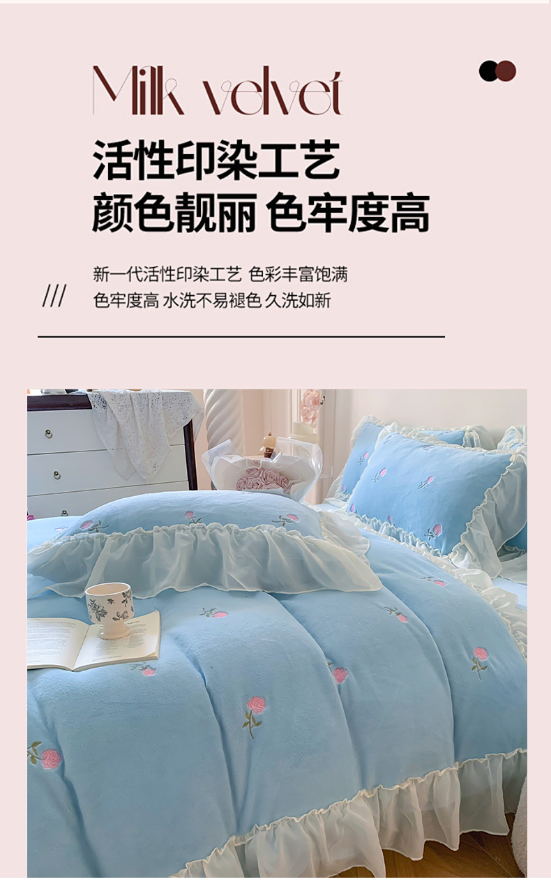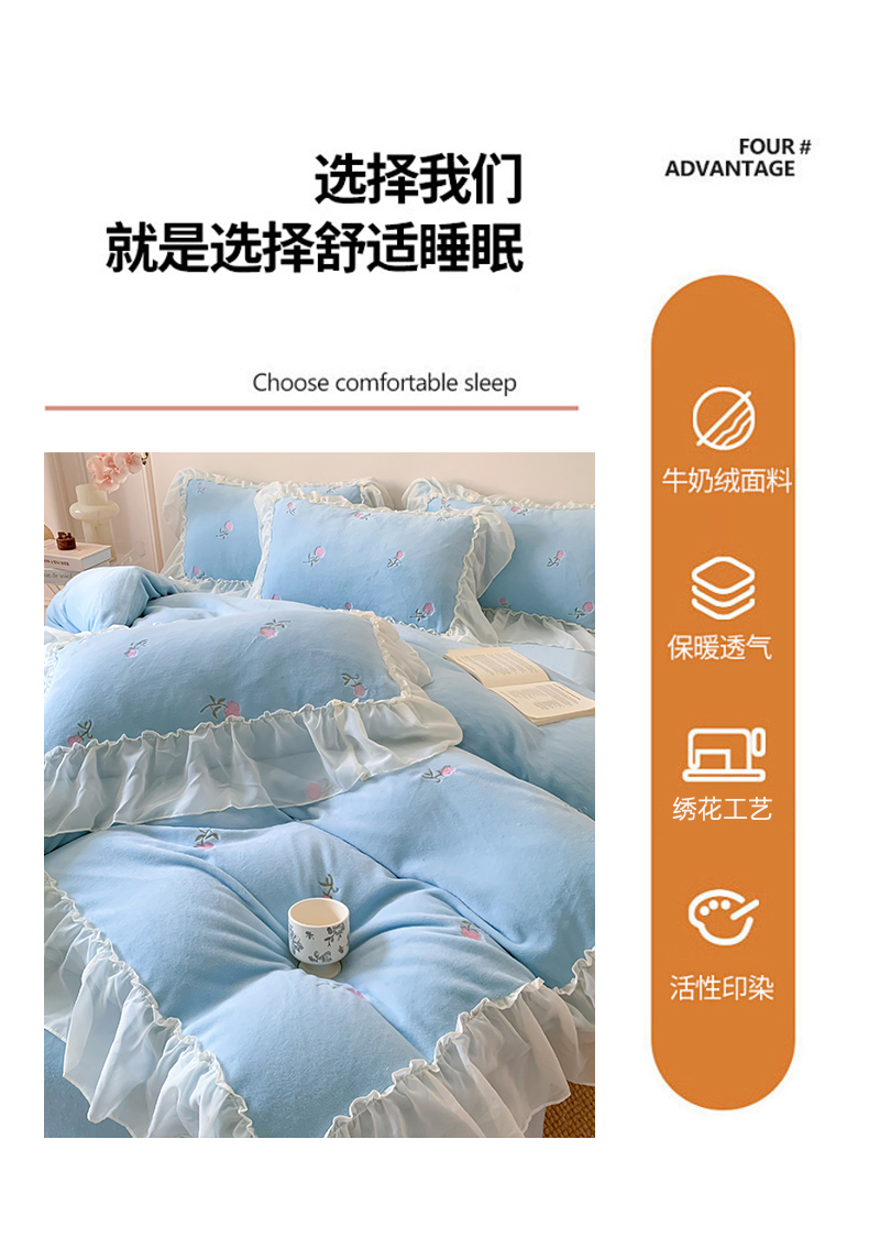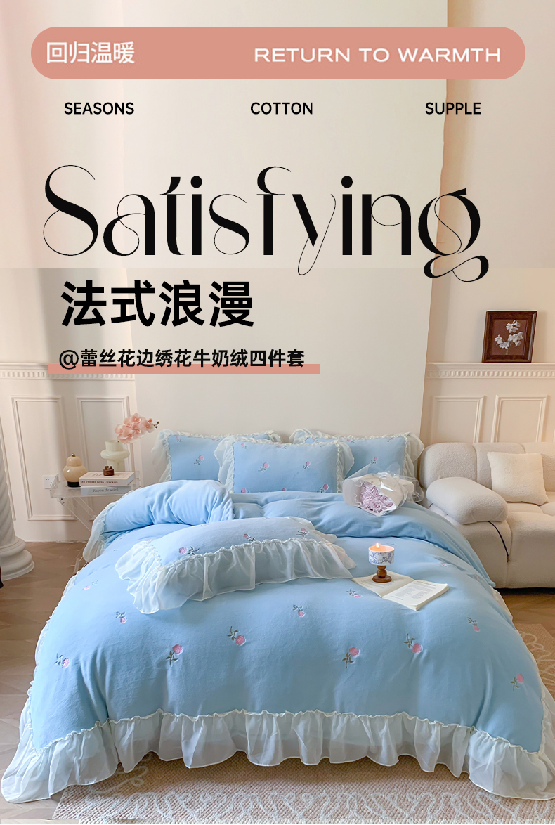 当前位置: 91家纺网 > 商品网购 > 床品套件 > 四件套 > 牛奶绒四件套 > 你好美丽 2025新款A类200克牛奶绒安娜满版刺绣花边四件套 安娜蓝
