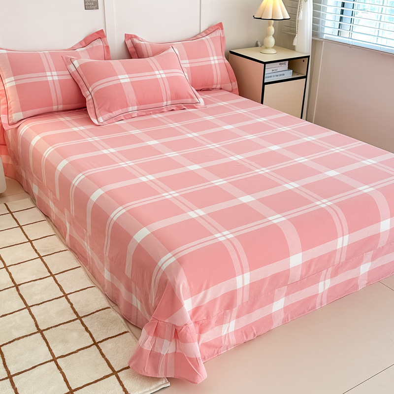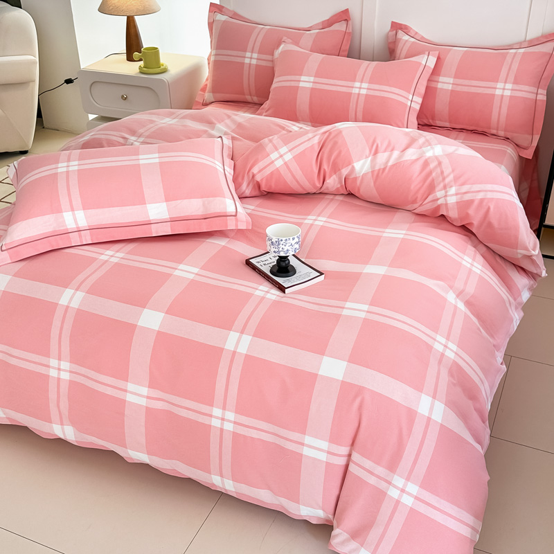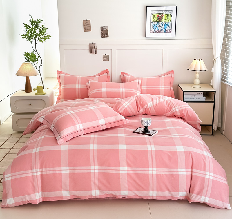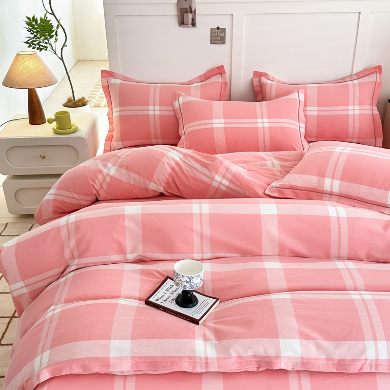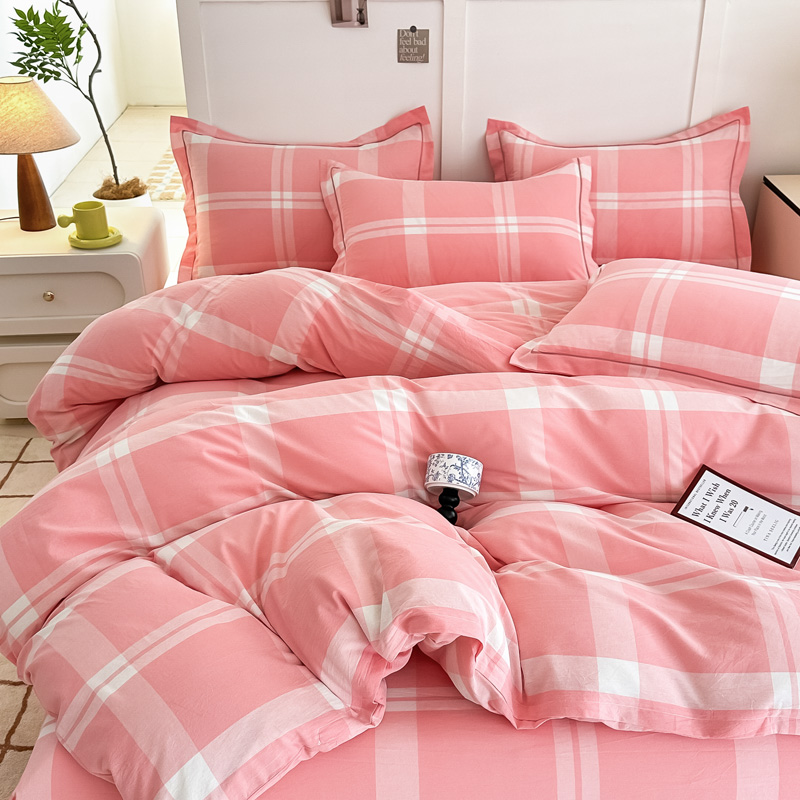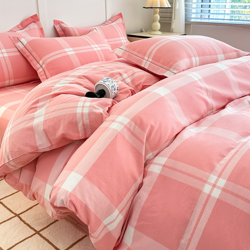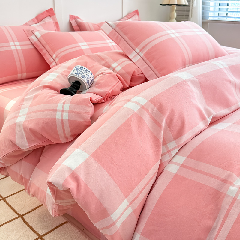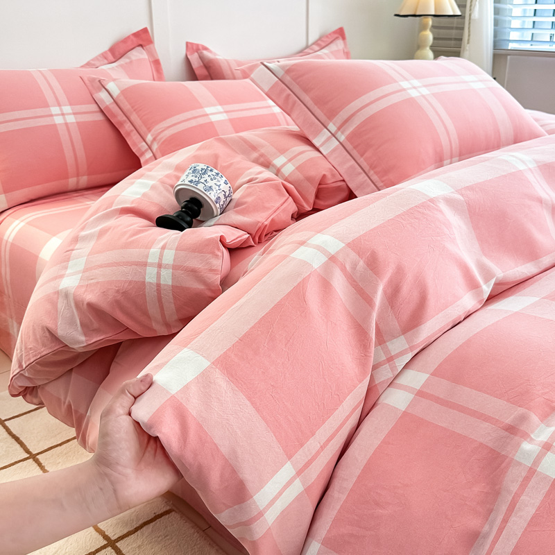 侯先生家纺 2025新款全棉色织四件套纯棉被套床单四季款格子三件套 布鲁格-粉