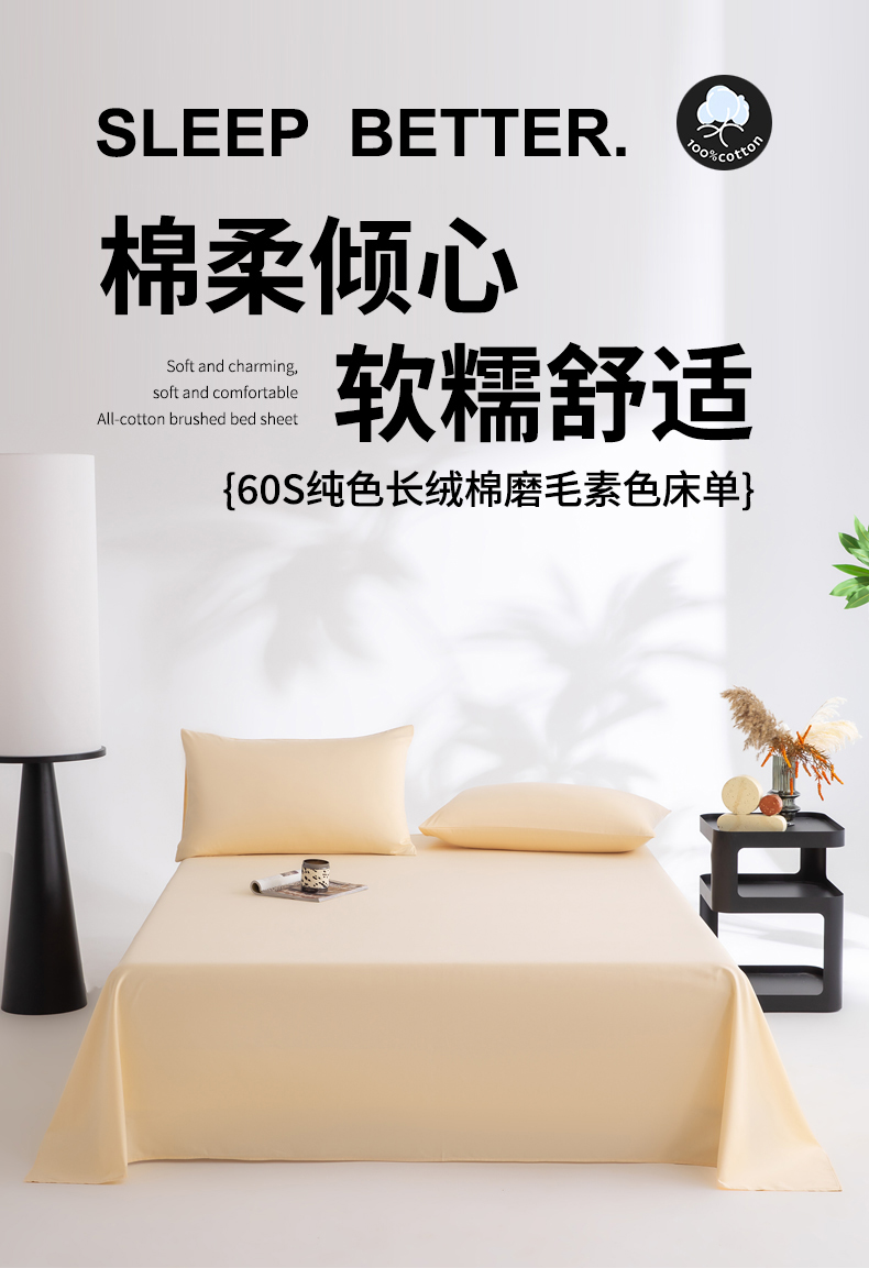 (总)寝柔家纺 2025新款60S纯色长绒棉磨毛素色四件套床单床笠款,杏驼,魅力紫,奶霜黄,暖橙,少女粉,水波兰,碳木灰,午夜蓝