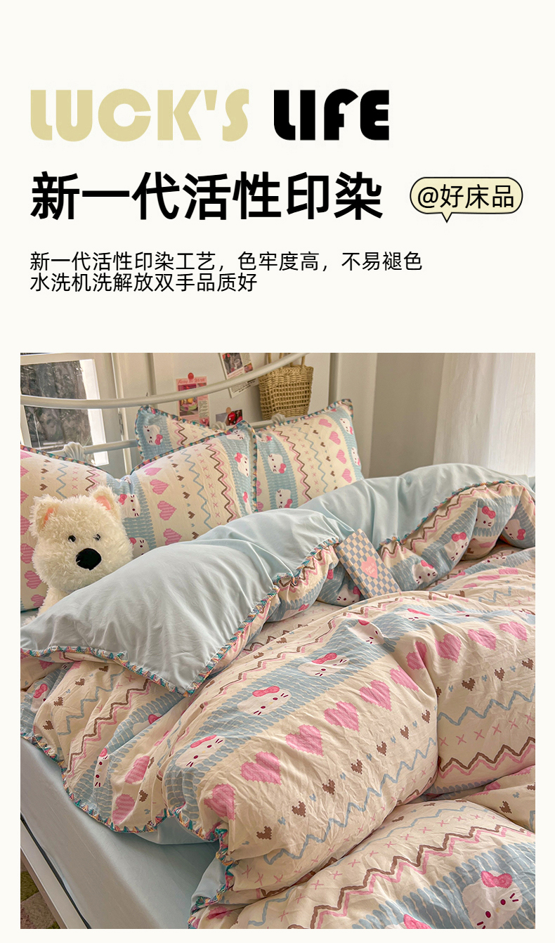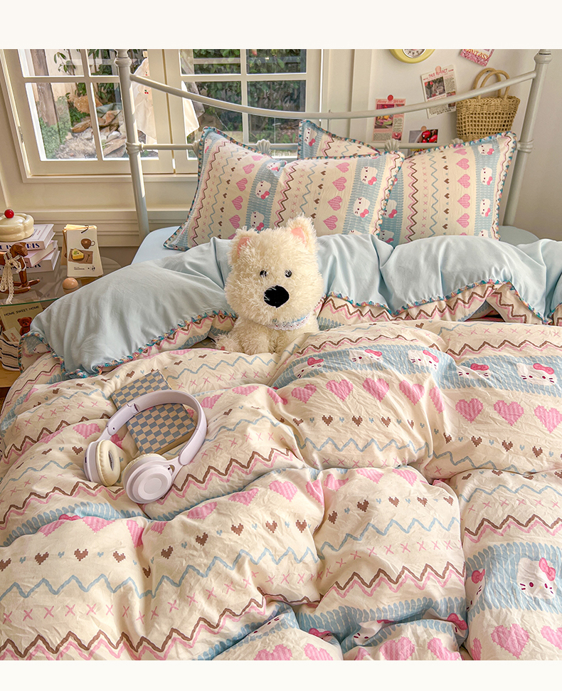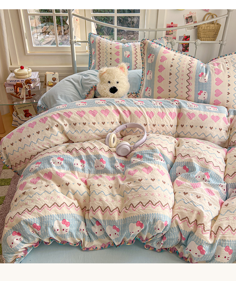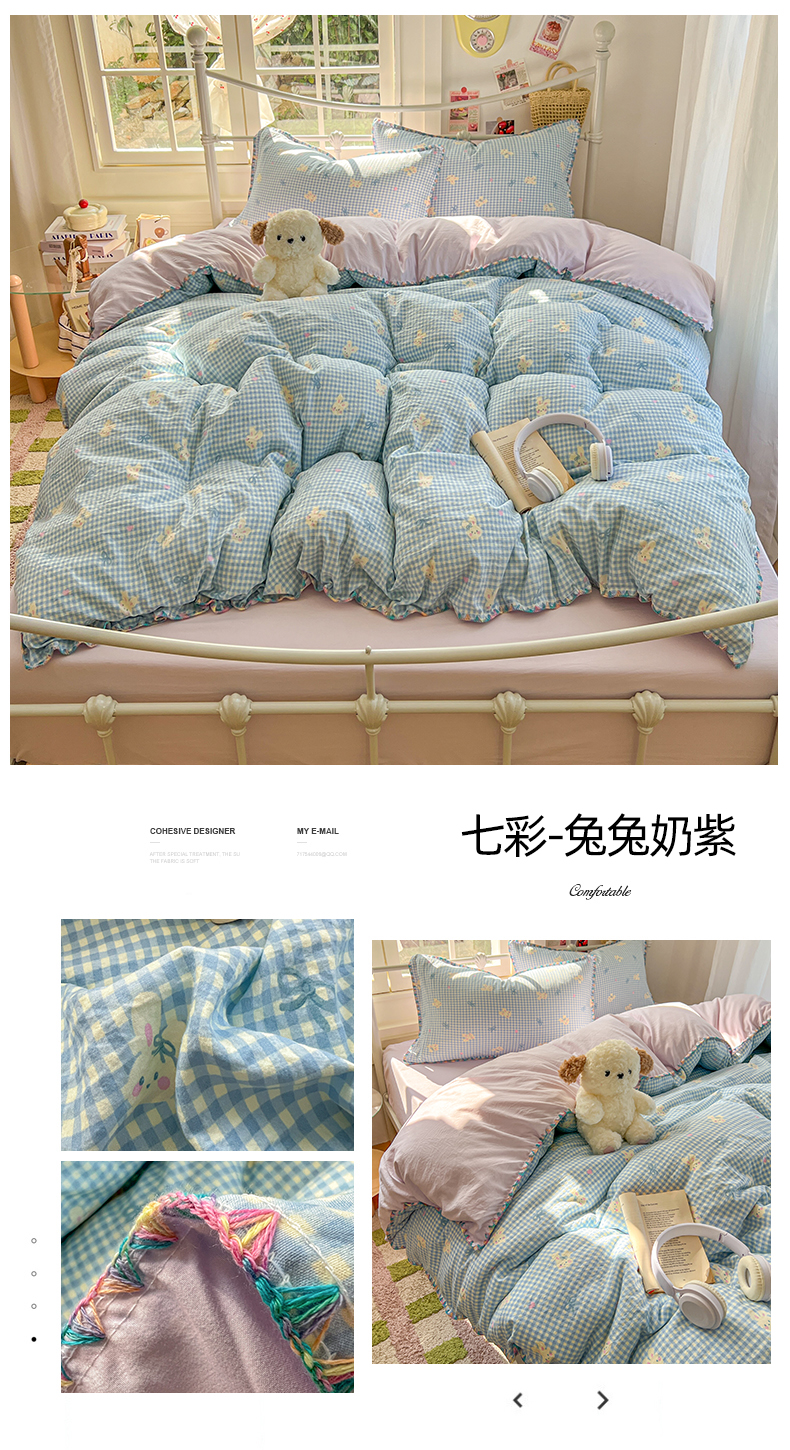 当前位置: 91家纺网 > 商品网购 > 床品套件 > 四件套 > 水洗棉四件套 > 冕悠家纺 2026新款超柔软卡通七彩贝壳边水洗棉四件套 提供买家秀 七彩-猫猫奶蓝