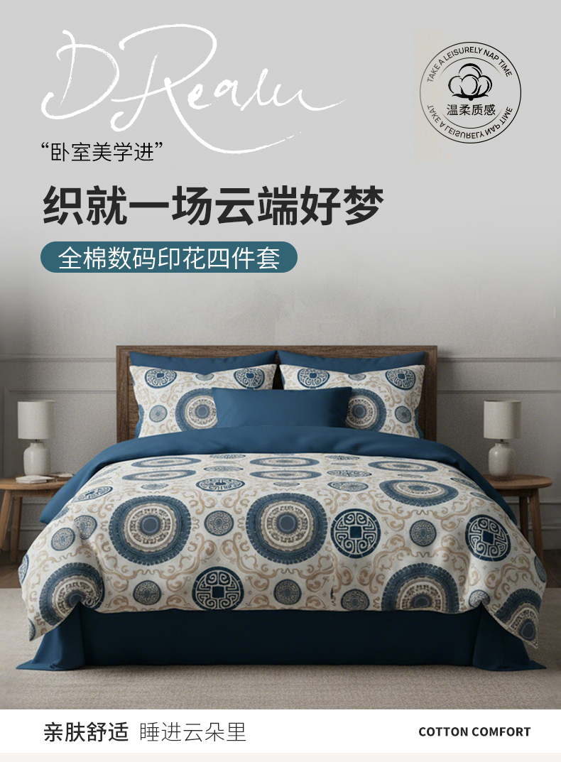 (总)纯色雨家纺 2026新款全棉四件套100纯棉中国风家纺套件斜纹数码印花四季床品,金福,欧兰