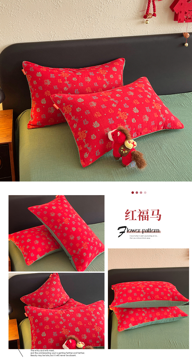 春皖家纺 2026新款全棉色织双层纱提花百福系列拉链款-单枕套 红百福