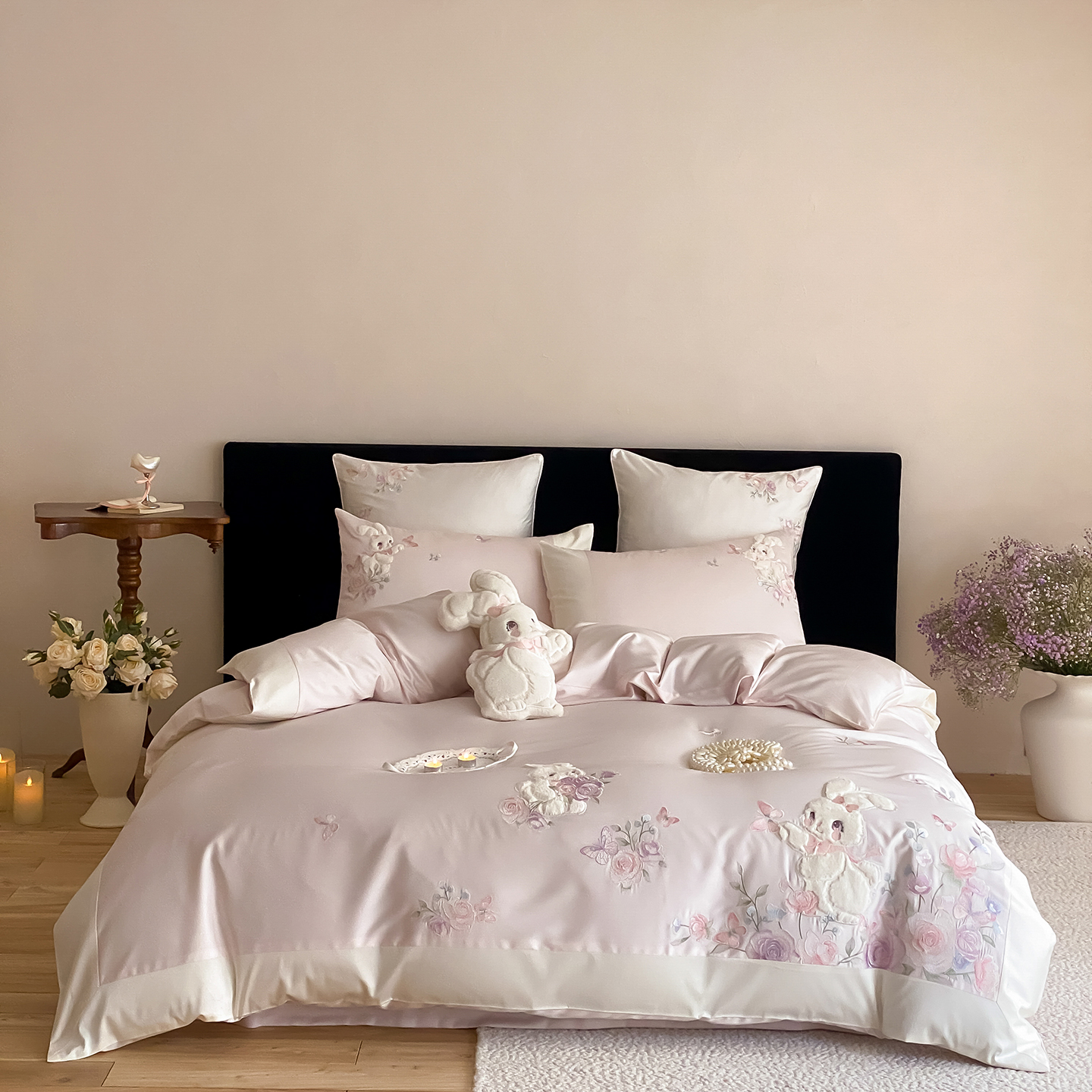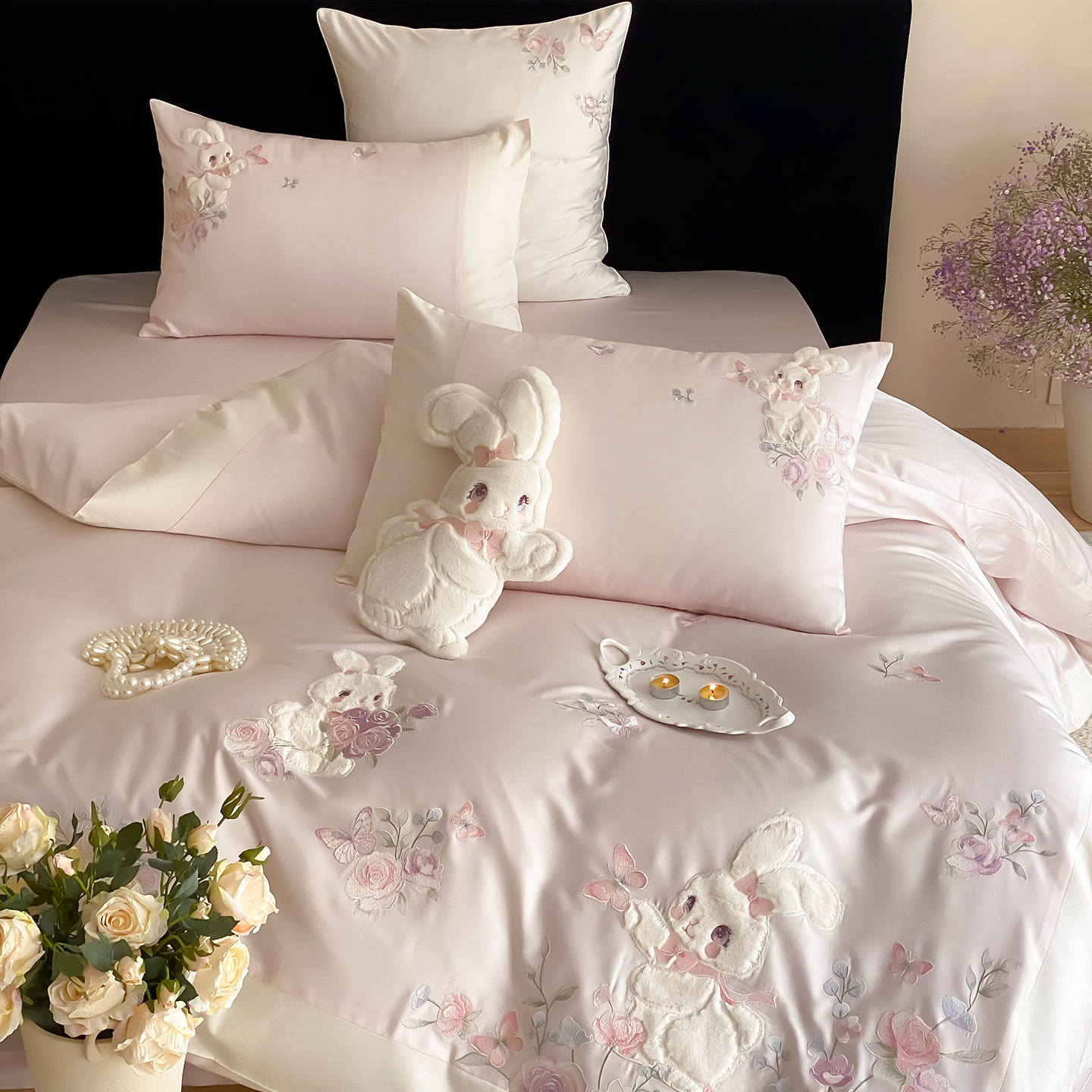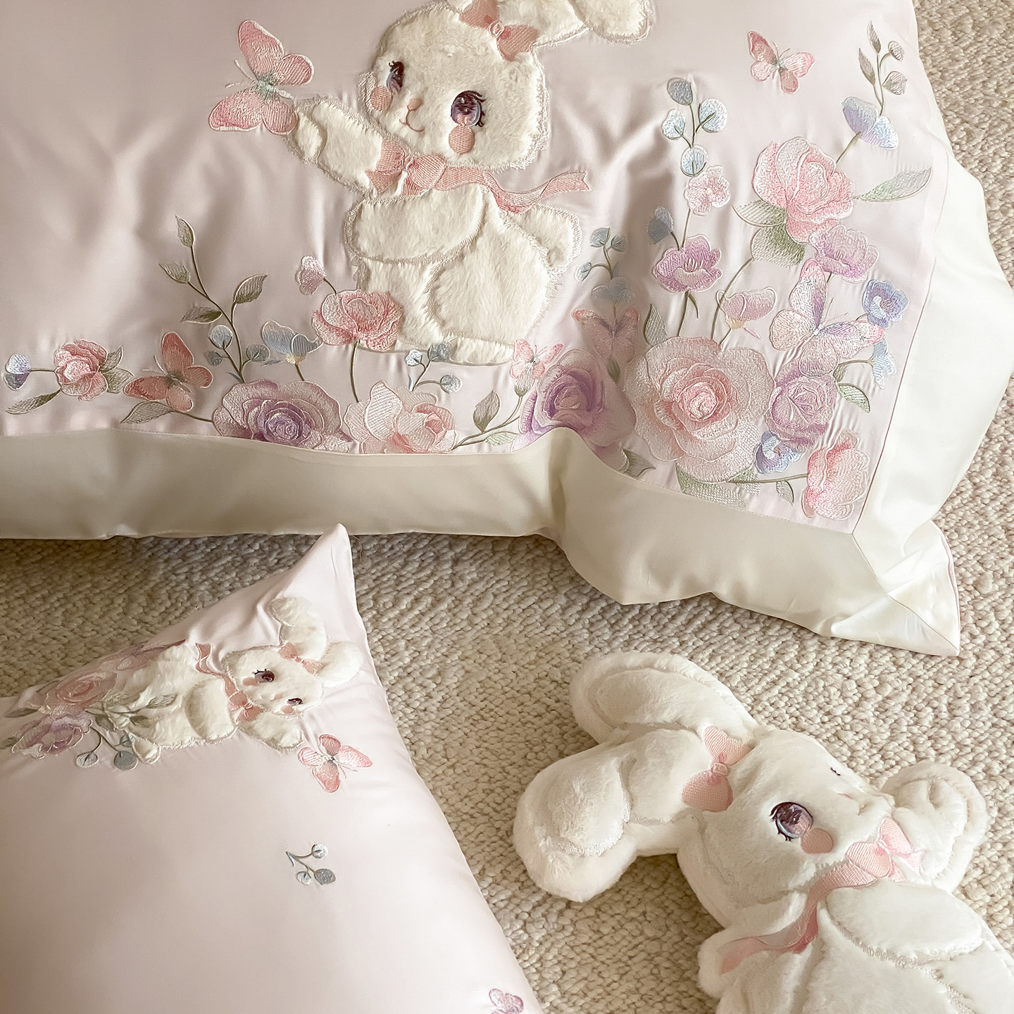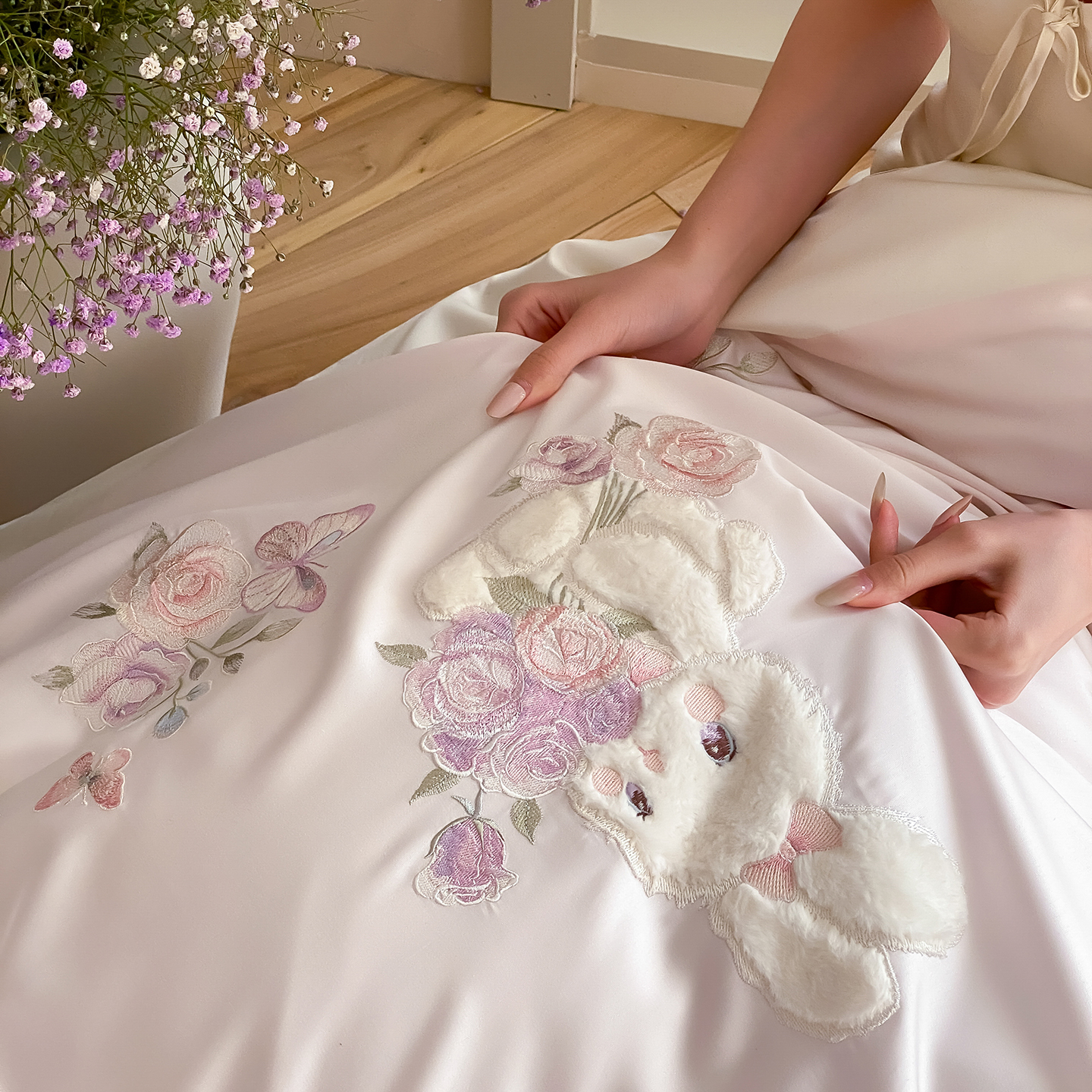 商品名称:(总)莎臣豹 2026新款100支新疆长绒棉精美兔毛立体贴布绣四件套-小兔花语